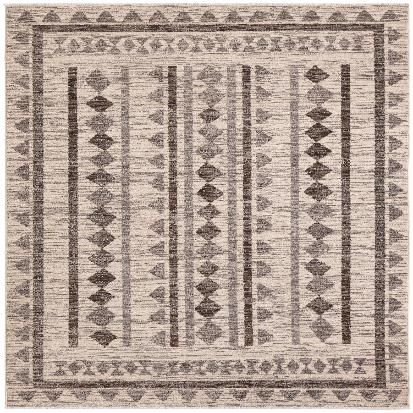 Primary color is Ivory. Colors in this rug include: Ivory, Brown, Gray.
