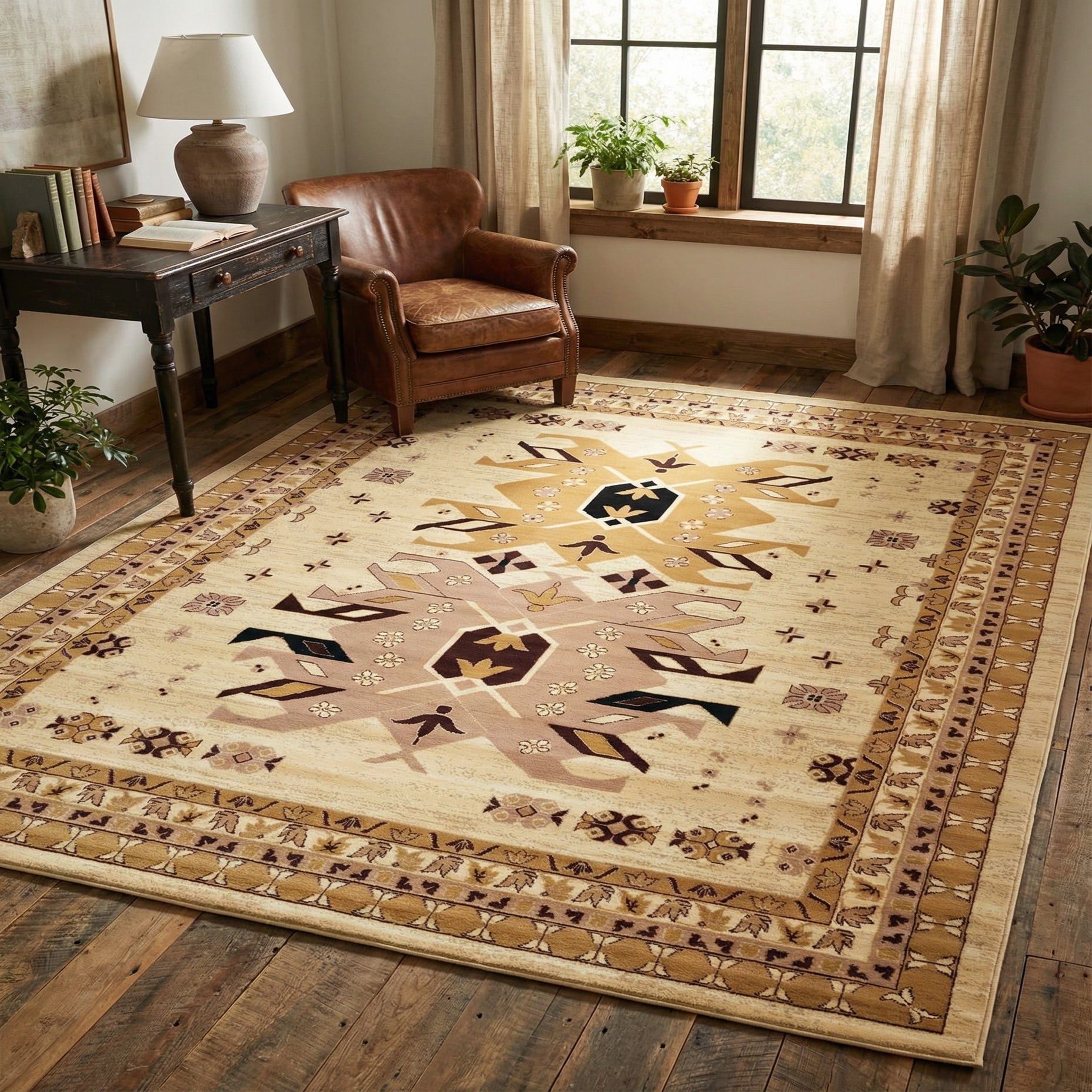 Well-suited for living rooms, dining areas, and bedrooms where a neutral foundation and classic pattern are desired. Place it under a sofa and coffee table to anchor seating, beneath a dining table to define the meal area, or centered in a bedroom to add quiet pattern without overpowering other finishes. The warm neutrals pair especially well with wood tones, leather, and natural textiles in traditional, transitional, farmhouse, or southwestern interiors.