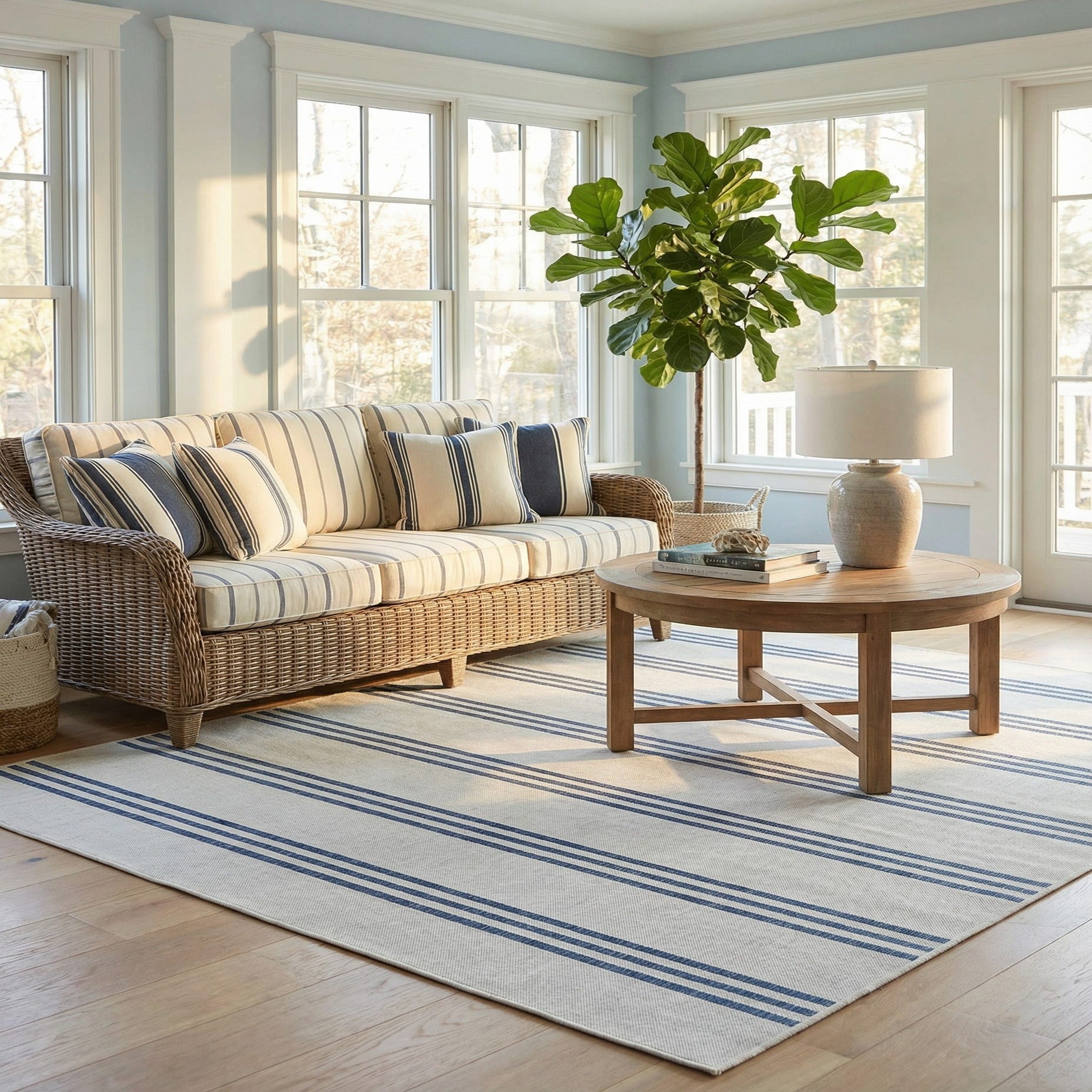 Clean, evenly spaced blue bands cross an ivory field in a timeless horizontal stripe layout. The pattern pairs narrow and slightly wider stripes to create visual rhythm while maintaining a simple, modern profile. Machine made from 100% polypropylene, the rug has a low, flat texture with a subtle woven grain that you can feel underfoot and that lays flat for easy placement.