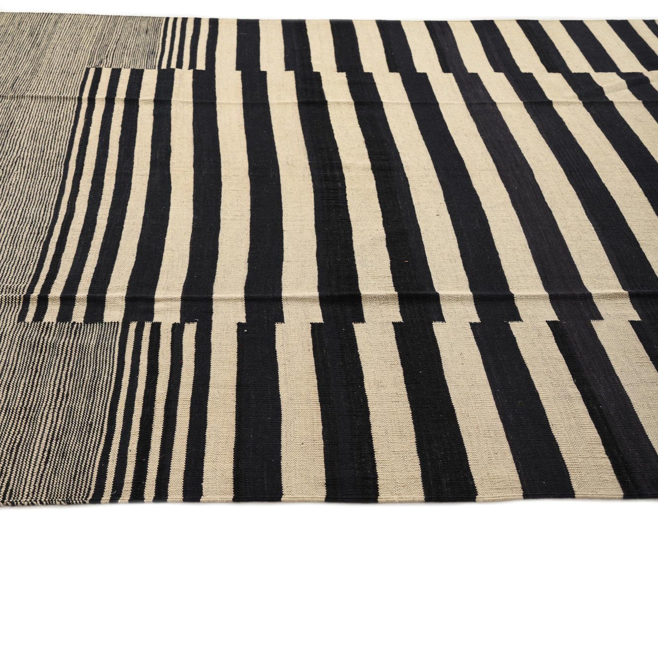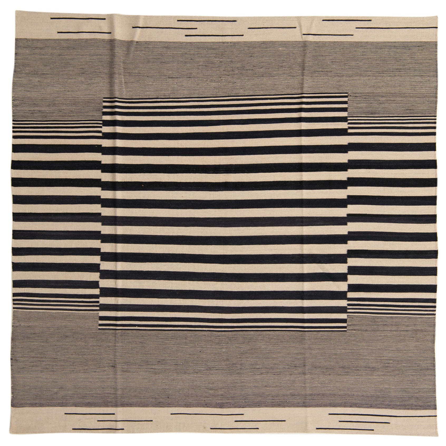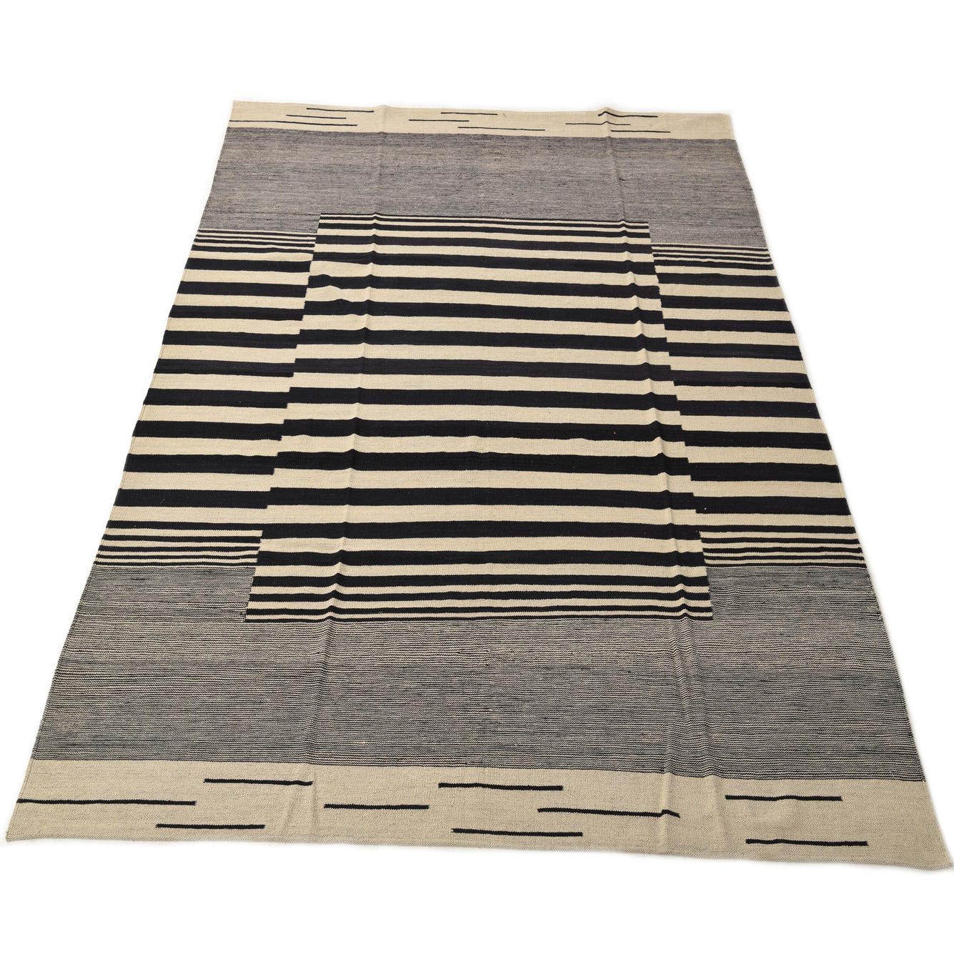 An 8x10 rectangular flatweave rug featuring a bold black and ivory stripe pattern, with a central striped rectangle framed by solid ivory and black striped borders.