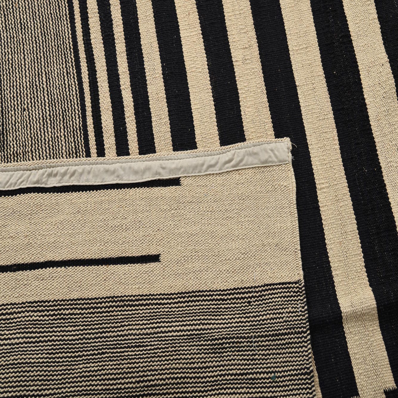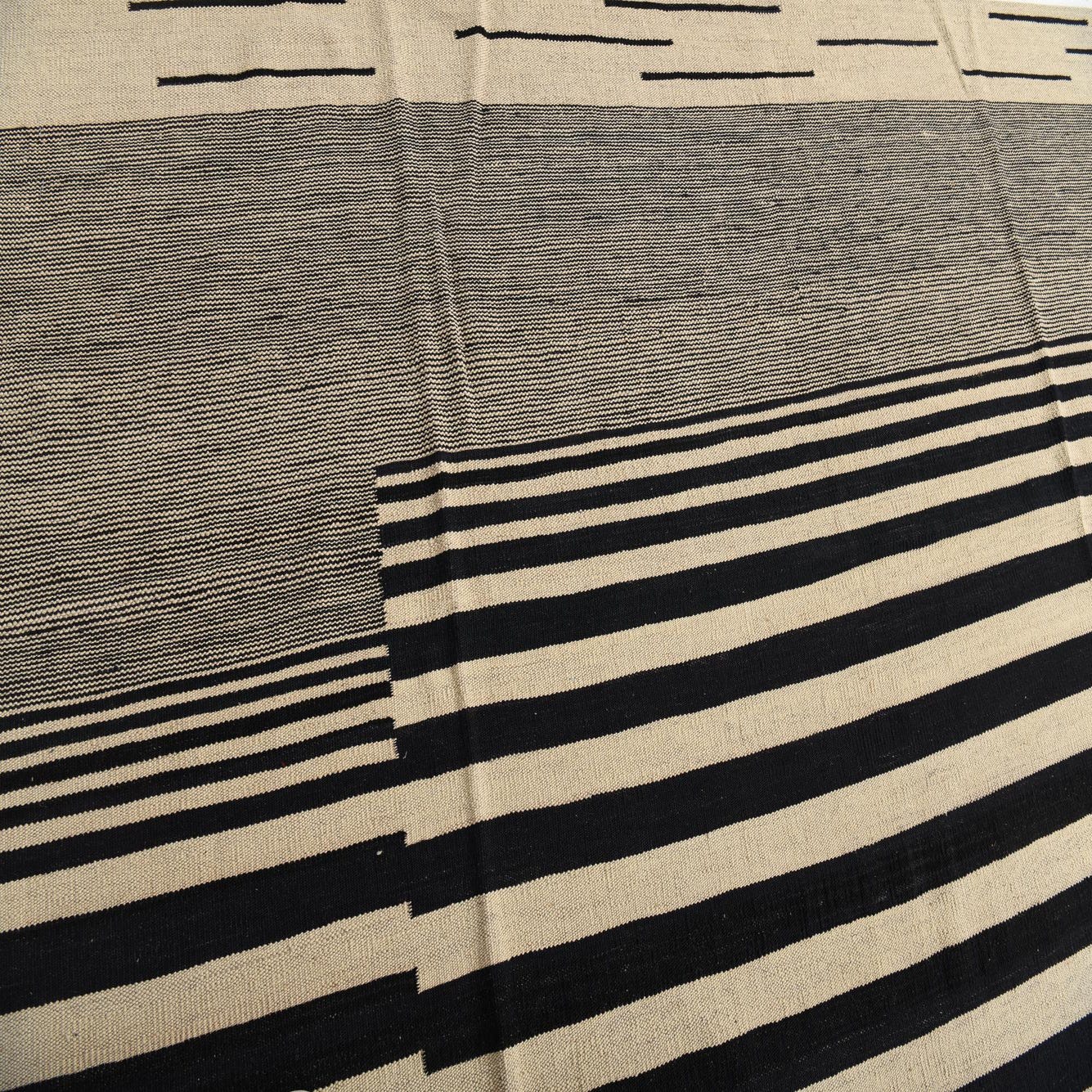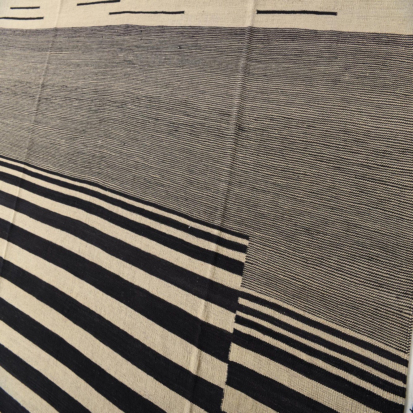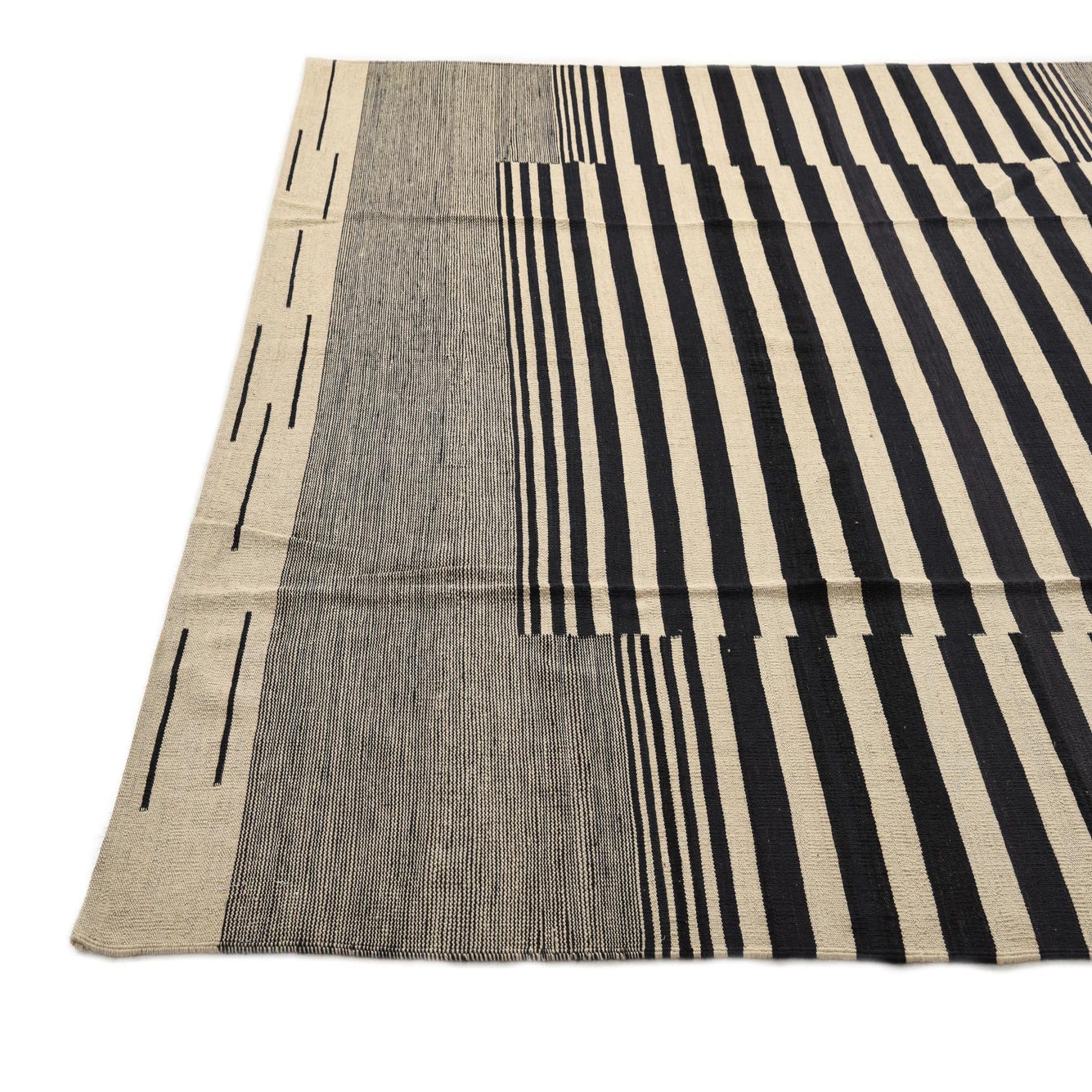An 8x10 rectangular flatweave rug featuring a bold black and ivory stripe pattern, with a central striped rectangle framed by solid ivory and black striped borders.