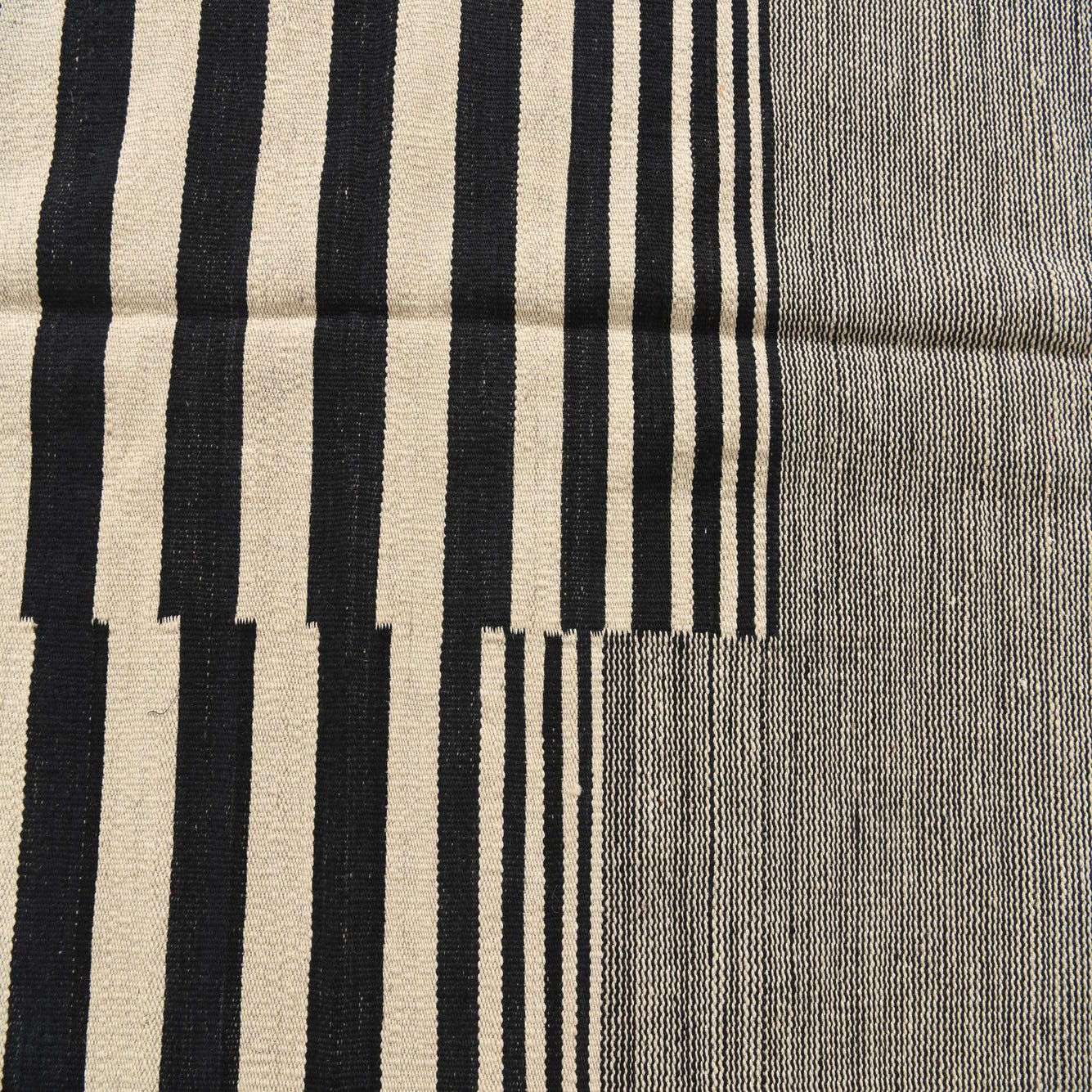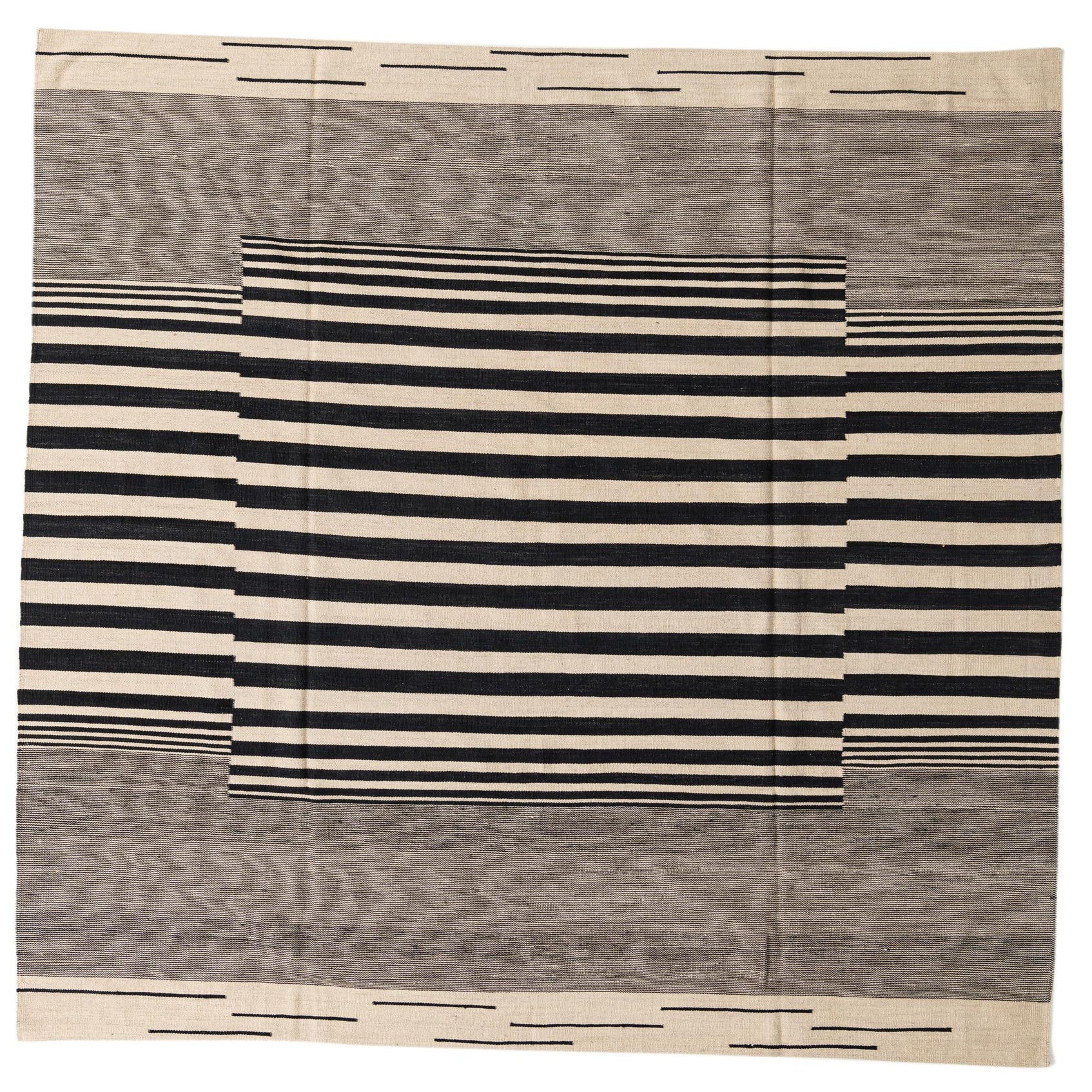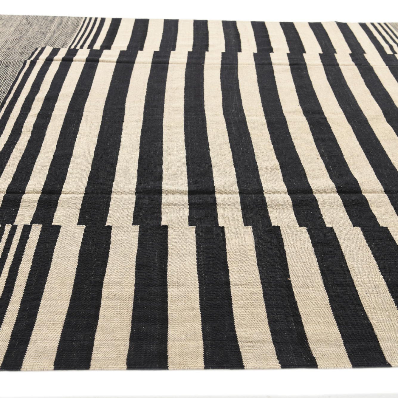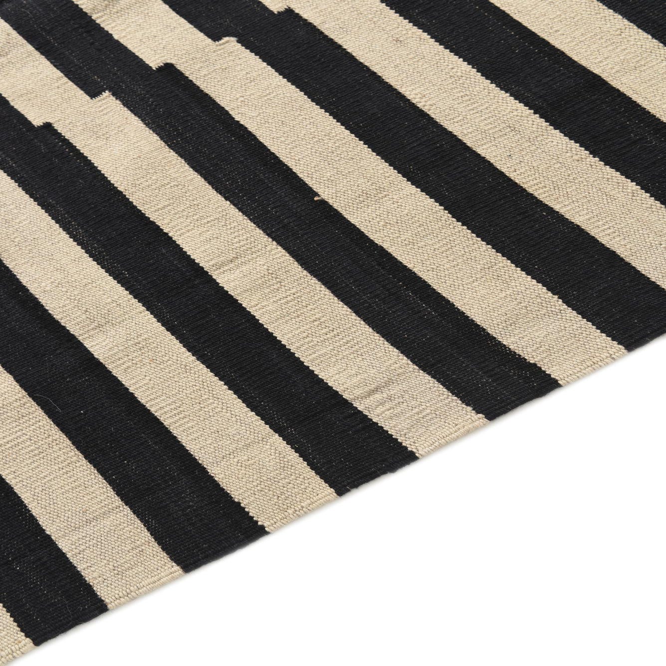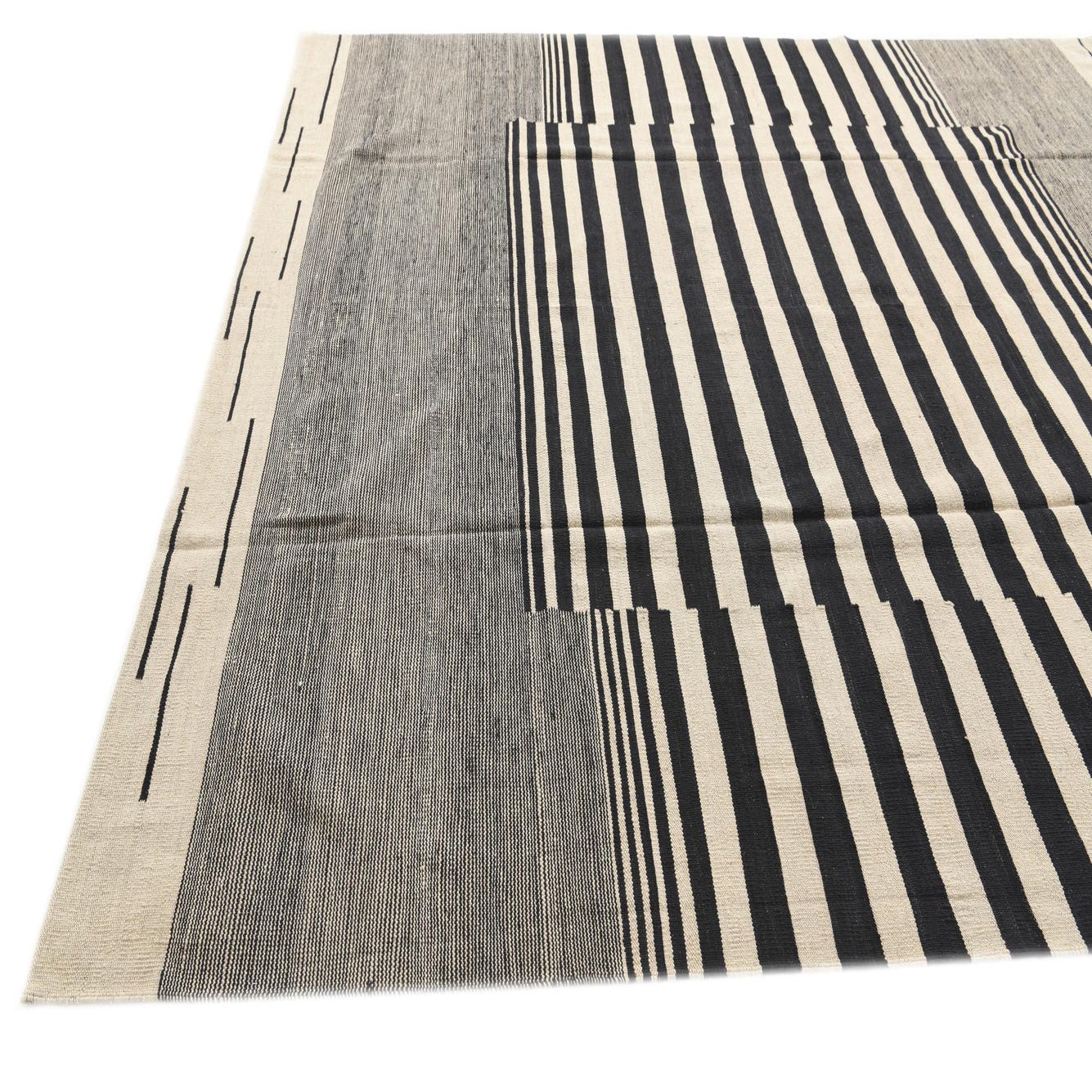 An 8x10 rectangular flatweave rug featuring a bold black and ivory striped pattern with solid ivory and black sections.