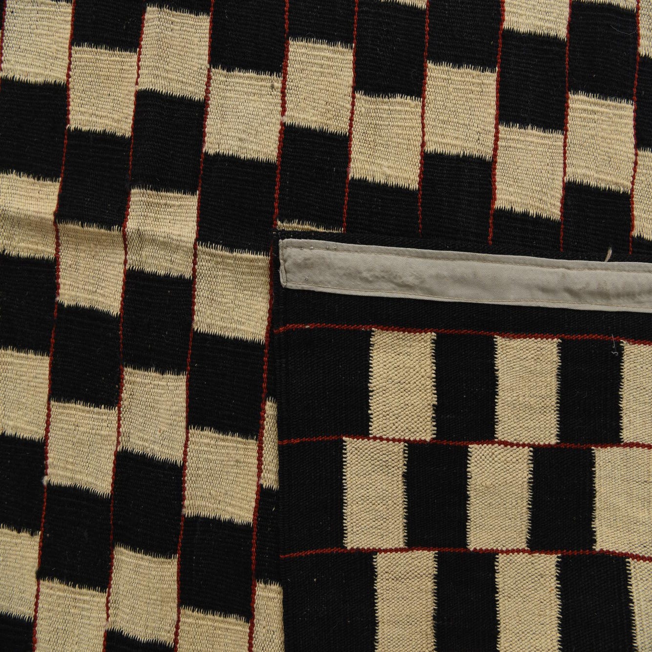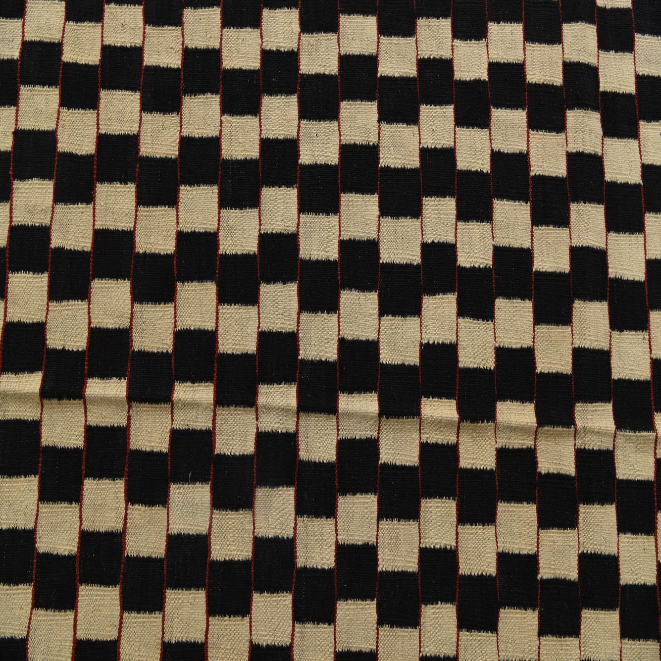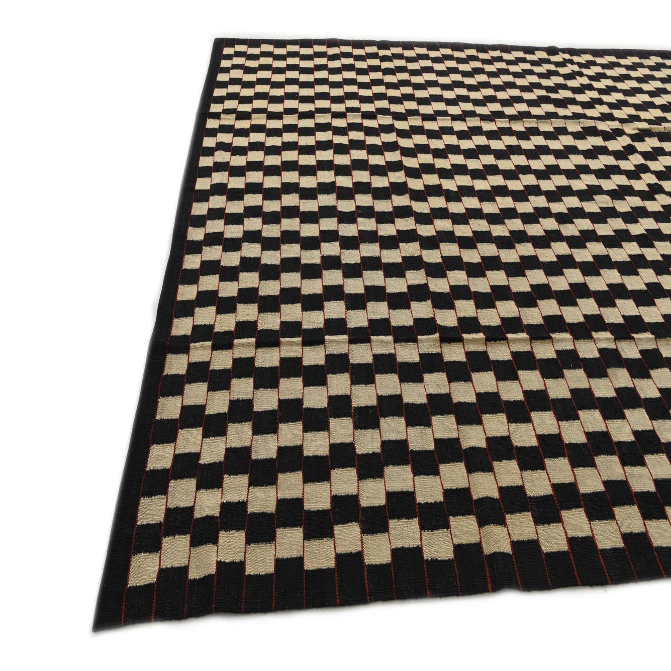 An 8x10 rectangular flatweave rug featuring a bold black and ivory checkerboard pattern with subtle red accents.