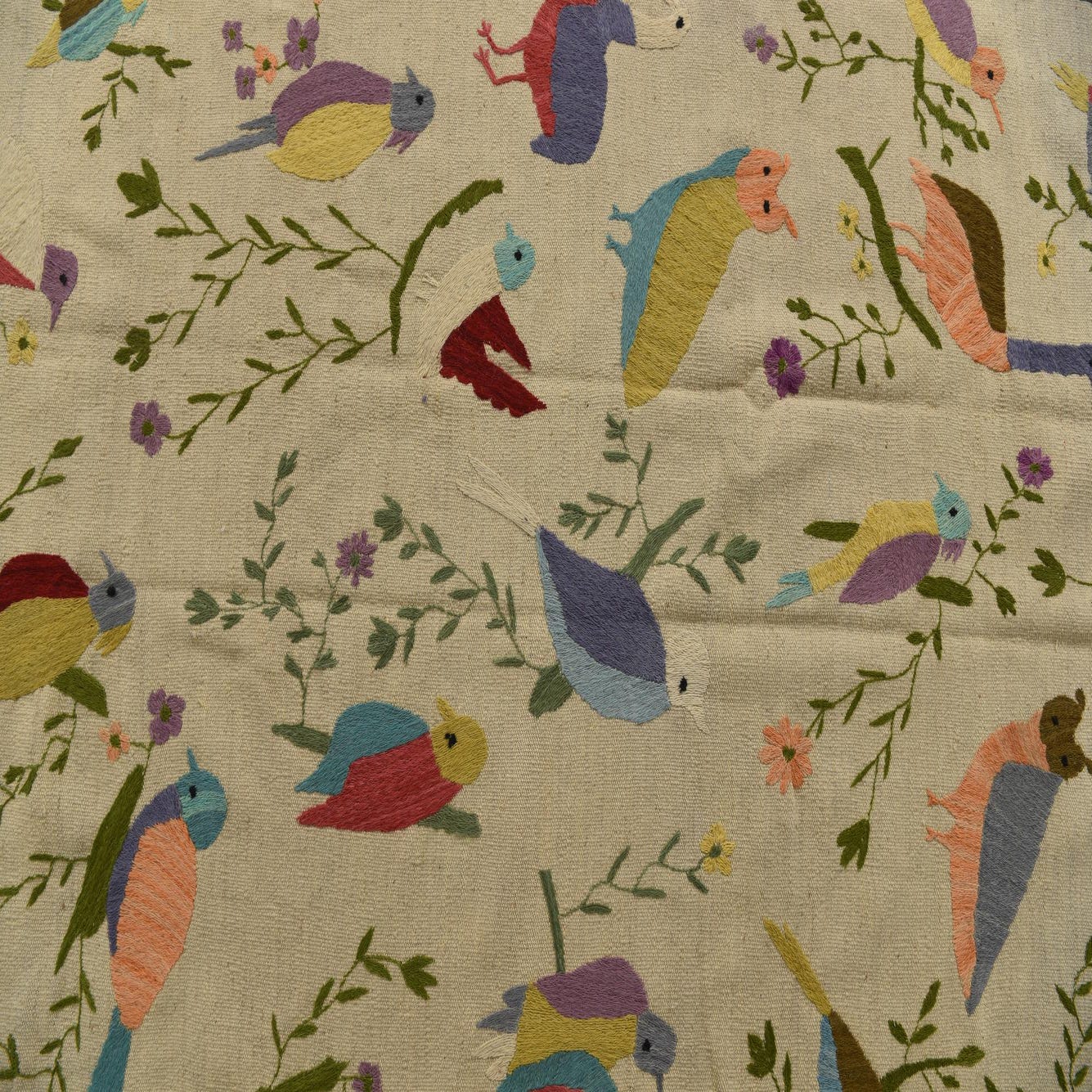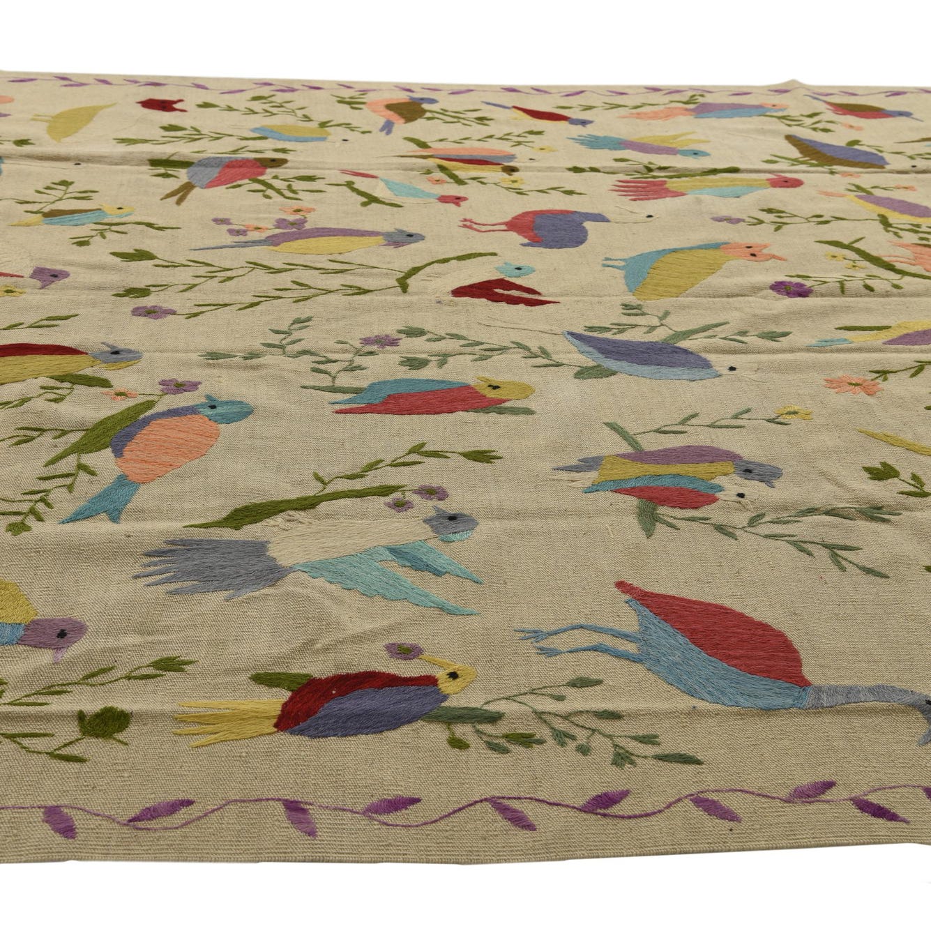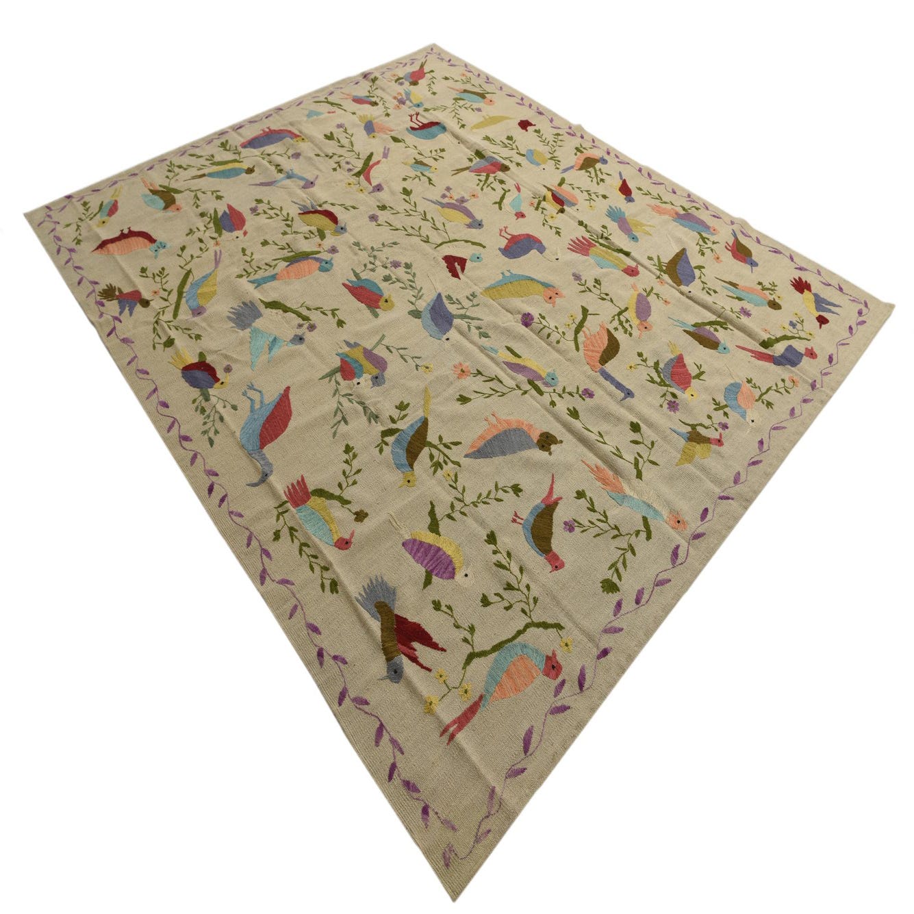 An 8x10 ivory rectangular rug with a vibrant, colorful bird and floral tribal pattern and a purple vine border.