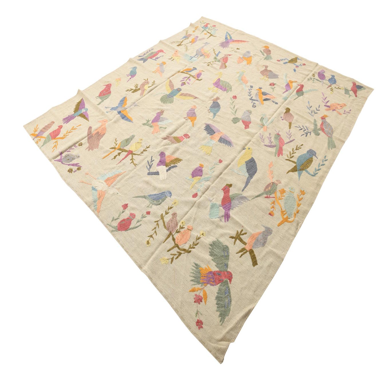 An 8x10 ivory flatweave rug featuring a vibrant, multicolored tribal bird and floral pattern, ideal for a living room.
