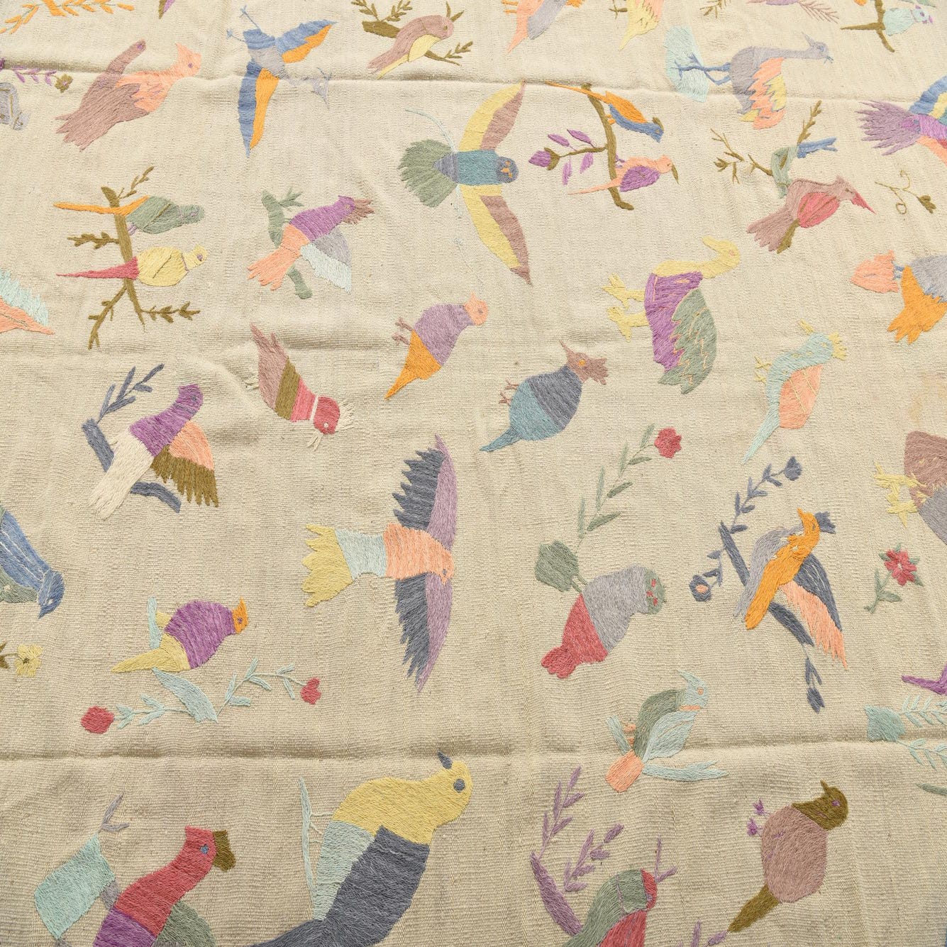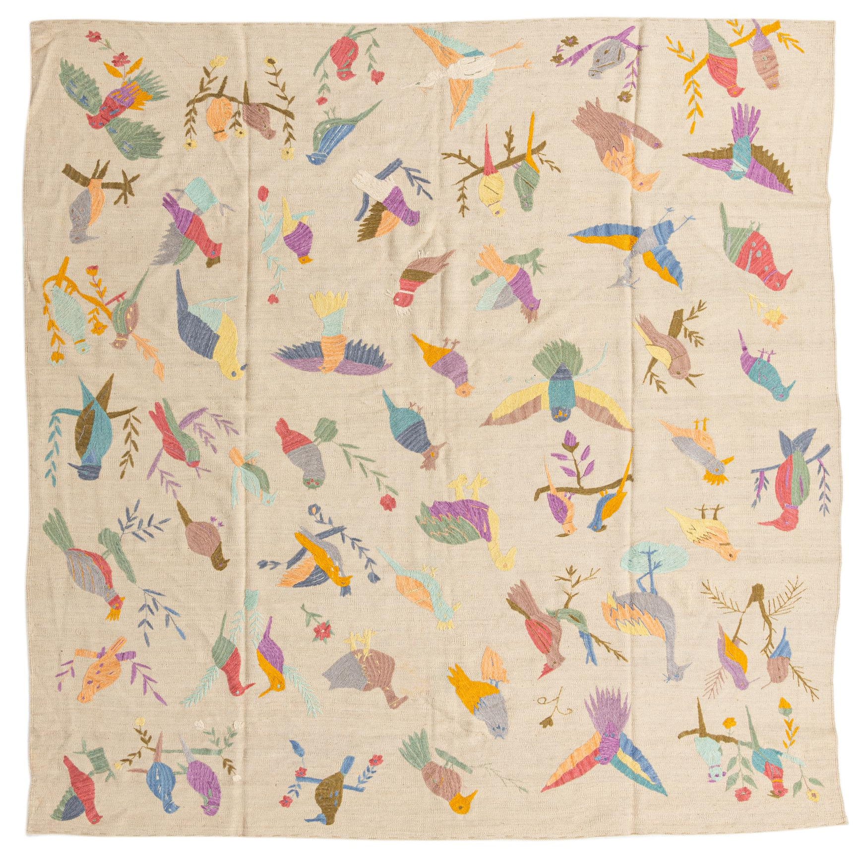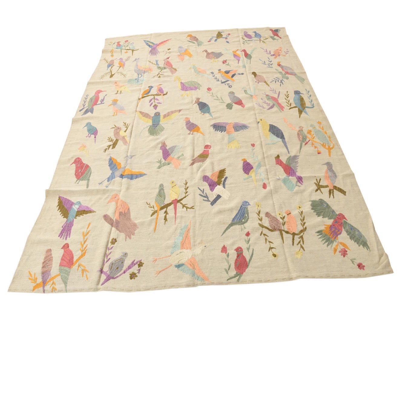The Kilim Suzani collection presents this hand-woven 100% wool rug that showcases a playful and vibrant array of embroidered botanical and avian motifs, creating a tapestry of folklore and tradition in textile form. The 8x10 rug features a warm ivory background that allows the eclectic palette of ivory, beige, blue, brown, burgundy, light blue, light brown, light green, light salmon, rust red, yellow, pink, purple, and red to flourish in a harmonious dance of color.