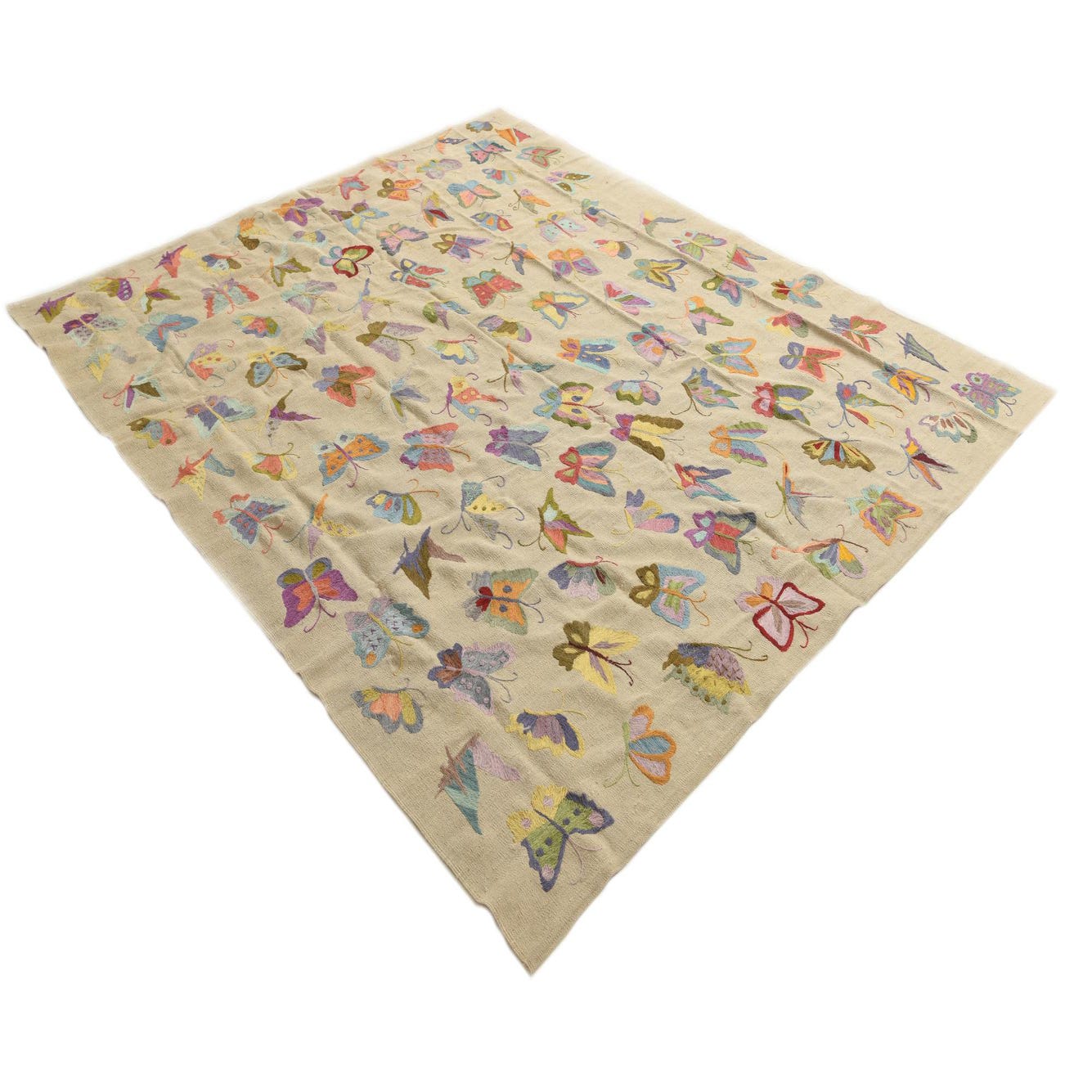 An 8x10 rectangular ivory flatweave rug featuring a vibrant, scattered pattern of colorful butterflies in various sizes and hues.