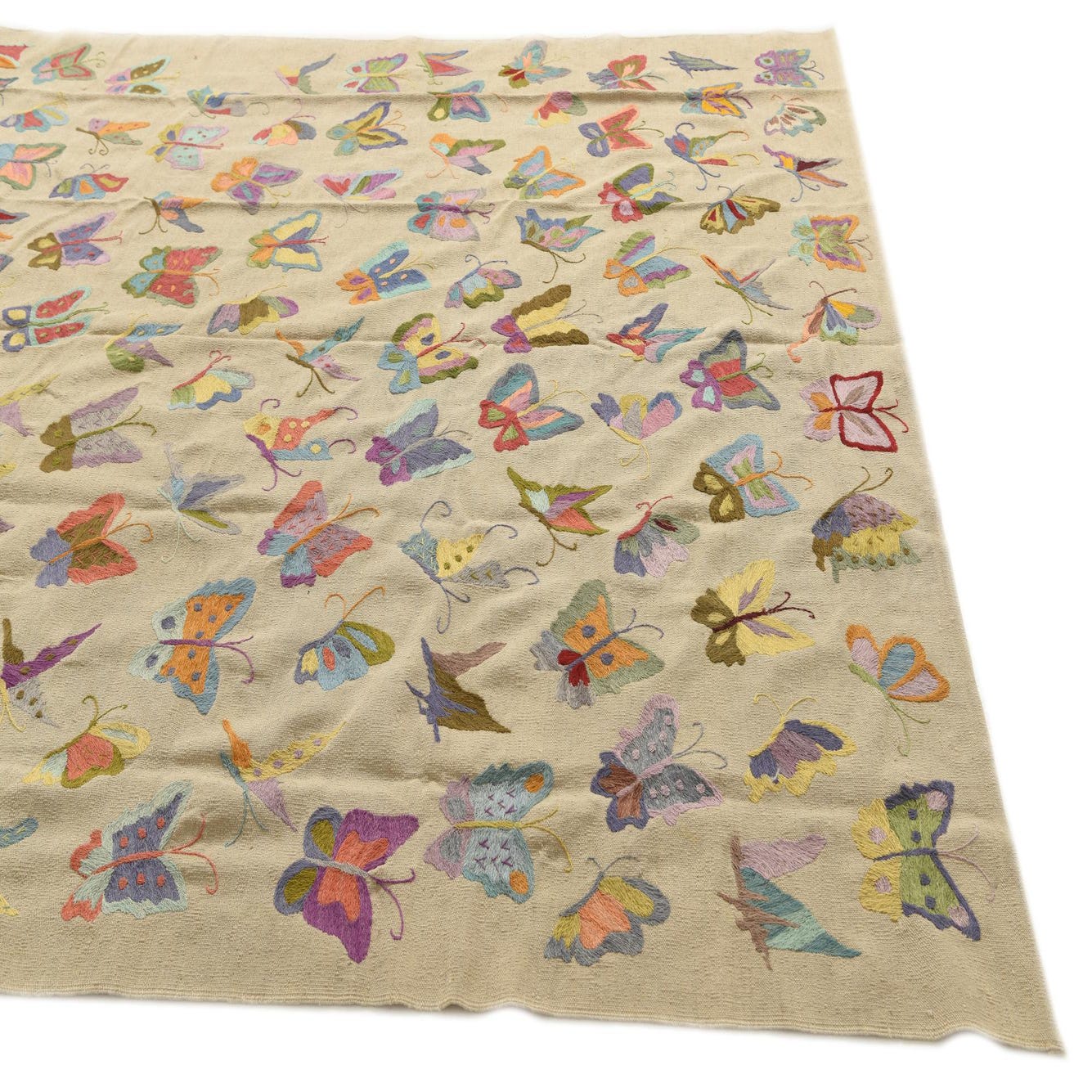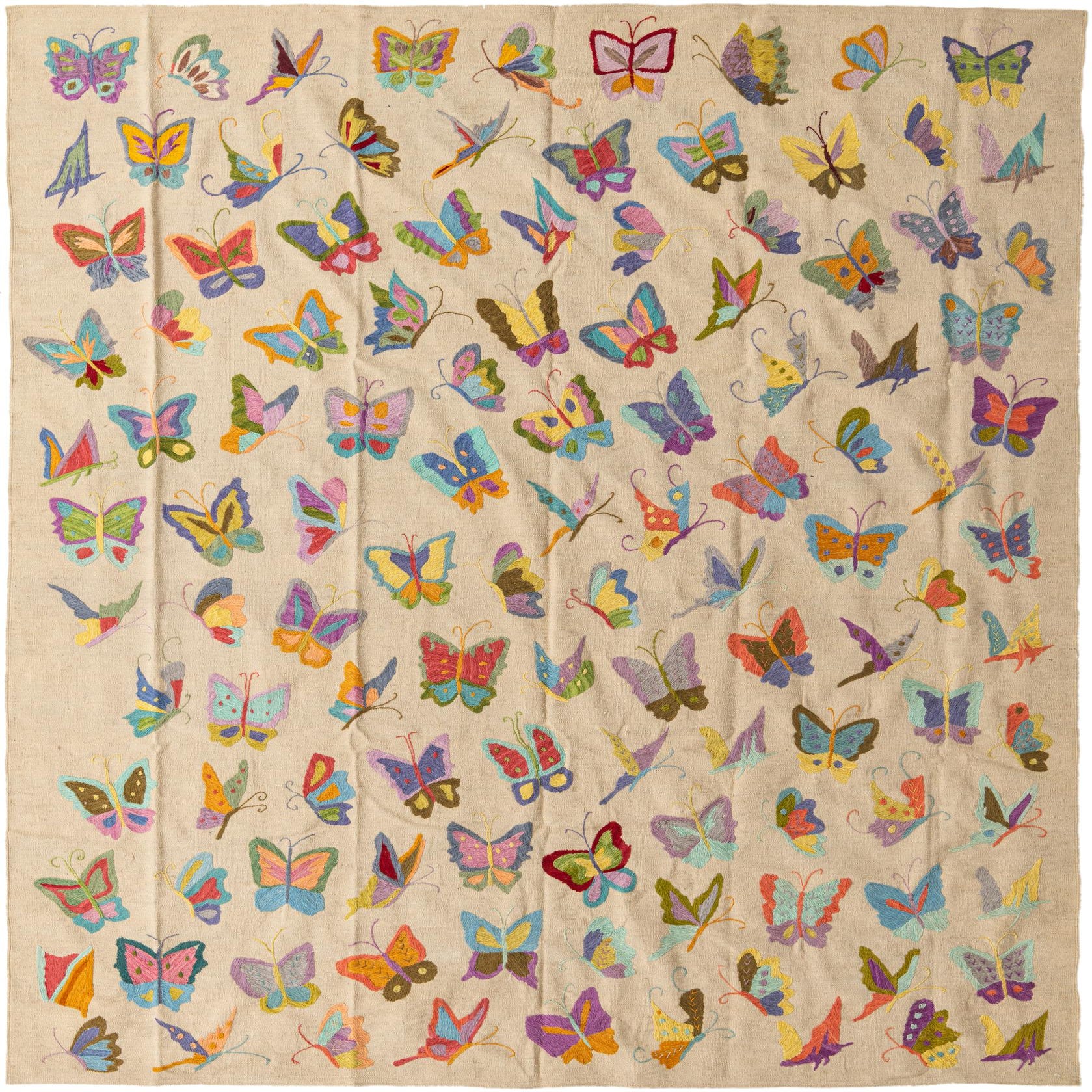 The rug's texture and flatweave construction enhance its authentic, folk-art feel, while the symmetrical placement of the butterfly motifs lends a sense of harmony and balance to the design. The diversity in color and playful imagery makes this rug suitable for an array of interiors, from eclectic and bohemian spaces to more traditional settings that need a burst of color and whimsy.