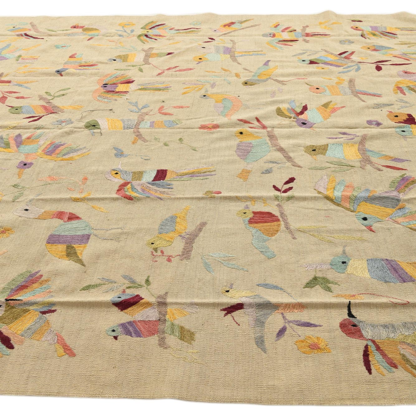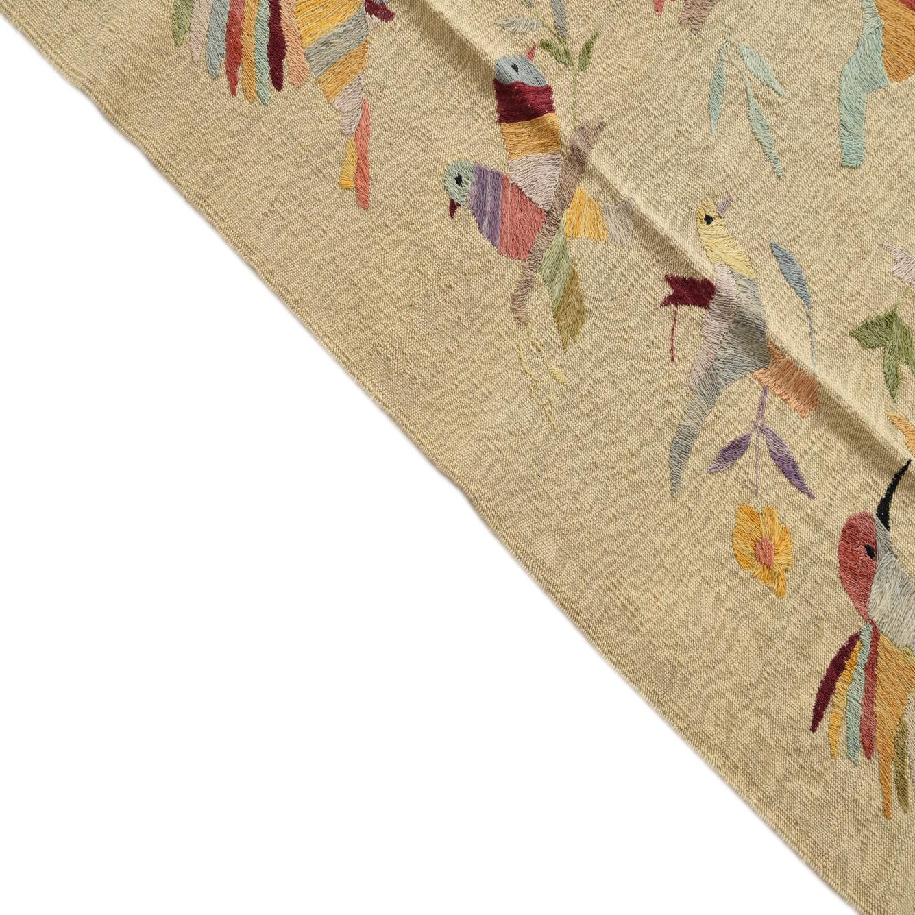 The flatweave texture of this rug, characteristic of Kilim style rugs, offers a durable and low pile that fits well in high-traffic areas and under furniture. Each bird and leaf is outlined with a crisp precision that speaks to the skillful craftsmanship of the weavers.