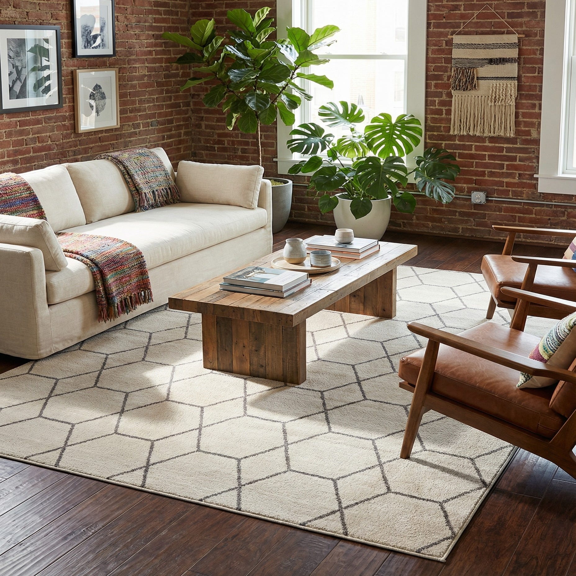 This neutral palette and streamlined motif work well in contemporary and transitional interiors — place it under a sofa and coffee table to anchor a living room, layer it beneath a bed for added warmth in a bedroom, or use it to bring cohesion to a home office or dining area. It pairs easily with light woods, matte metals, and minimalist furnishings, and complements styles ranging from Scandinavian simplicity to mid-century modern.