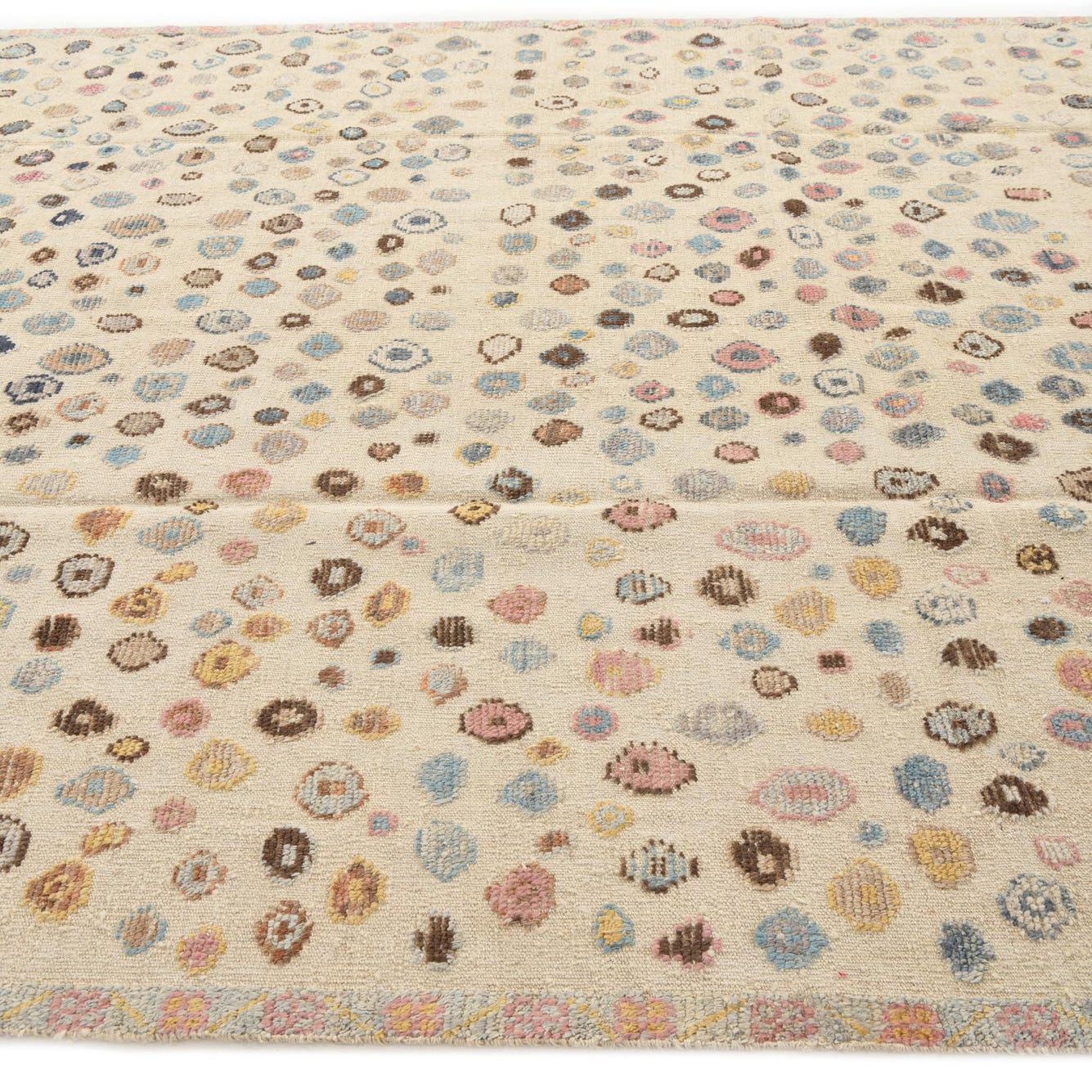 Part of the Moroccan collection, this hand-knotted 8x10 rug is crafted from 100% wool, delivering a texture that is plush and durable. The rug features an ivory background embellished with a varied palette of colors, including beige, blue, brown, light blue, light brown, light green, light salmon, navy blue, peach, pink, gray, and yellow. Its pattern is an assemblage of subtle, abstract shapes that suggest a modern take on traditional Moroccan designs. The edges are finished with a fringe, adding a classic touch to its overall contemporary appeal.