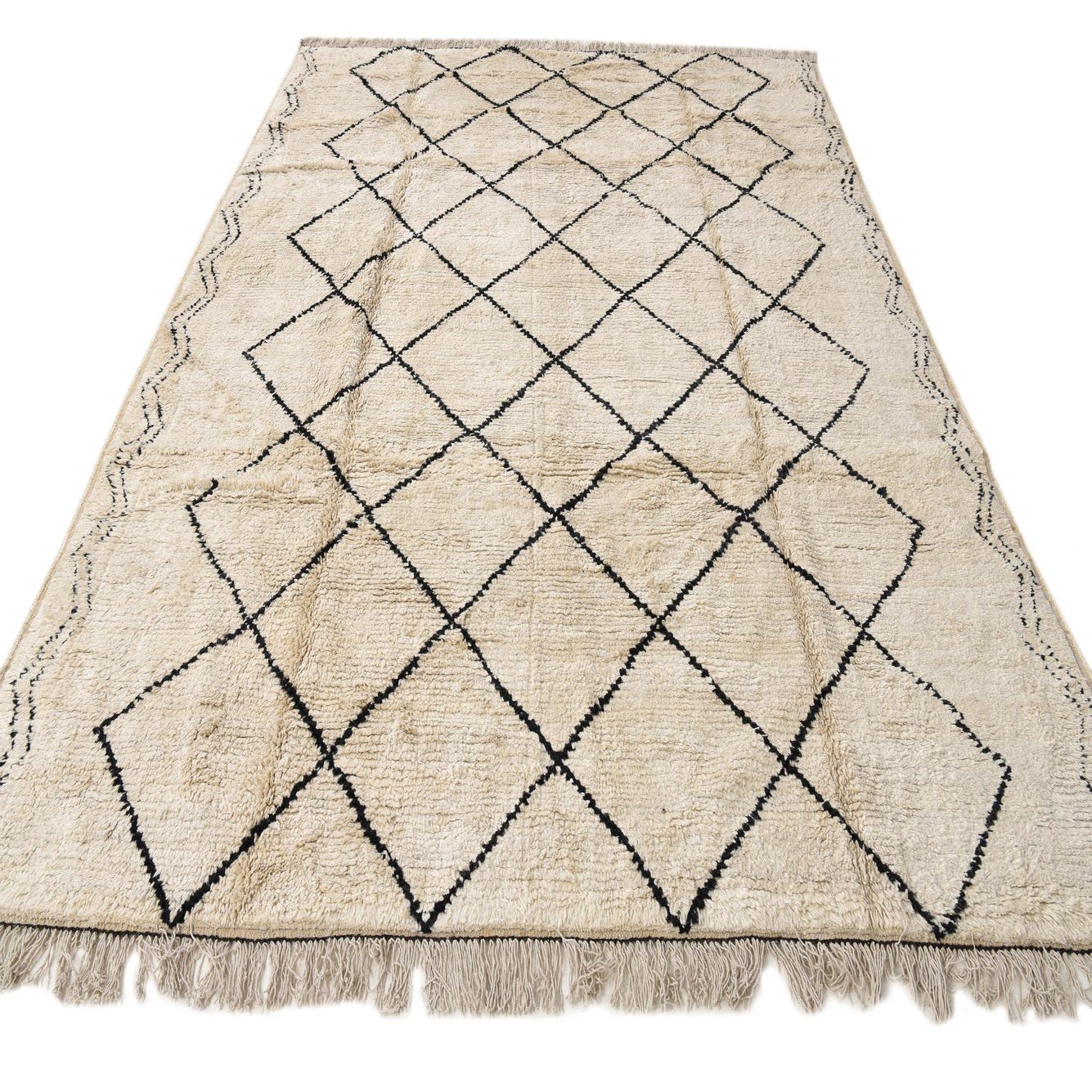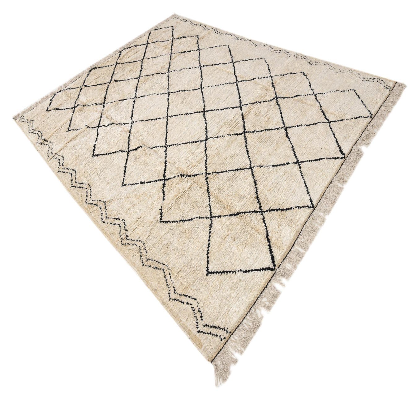 An 8x10 rectangular ivory shag rug with a black tribal diamond pattern and fringed edges, perfect for a modern living room.