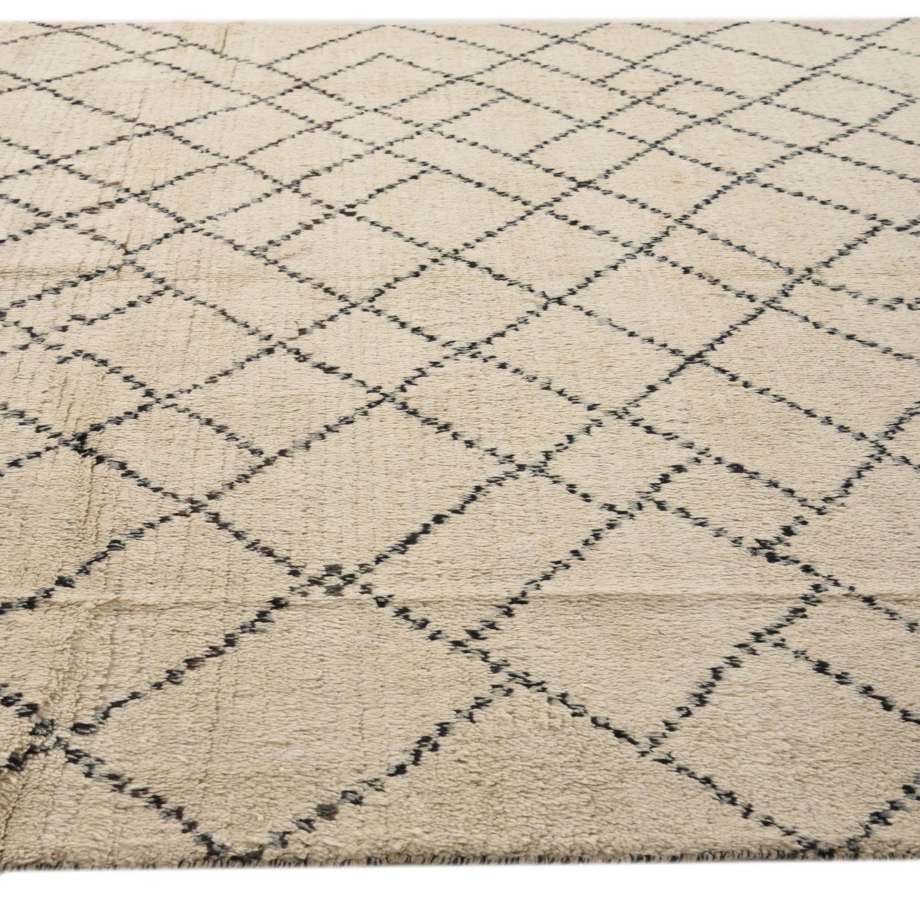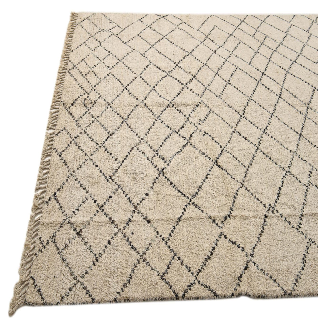 The Moroccan collection presents a hand-knotted 8x10 wool rug that showcases a harmonious interplay of Ivory, Black, and Light Blue hues. The design features an Ivory background with a dynamic black geometric pattern accentuated by subtle touches of light blue. The texture is characteristically plush, inherent to 100% wool compositions, offering both comfort and warmth underfoot.