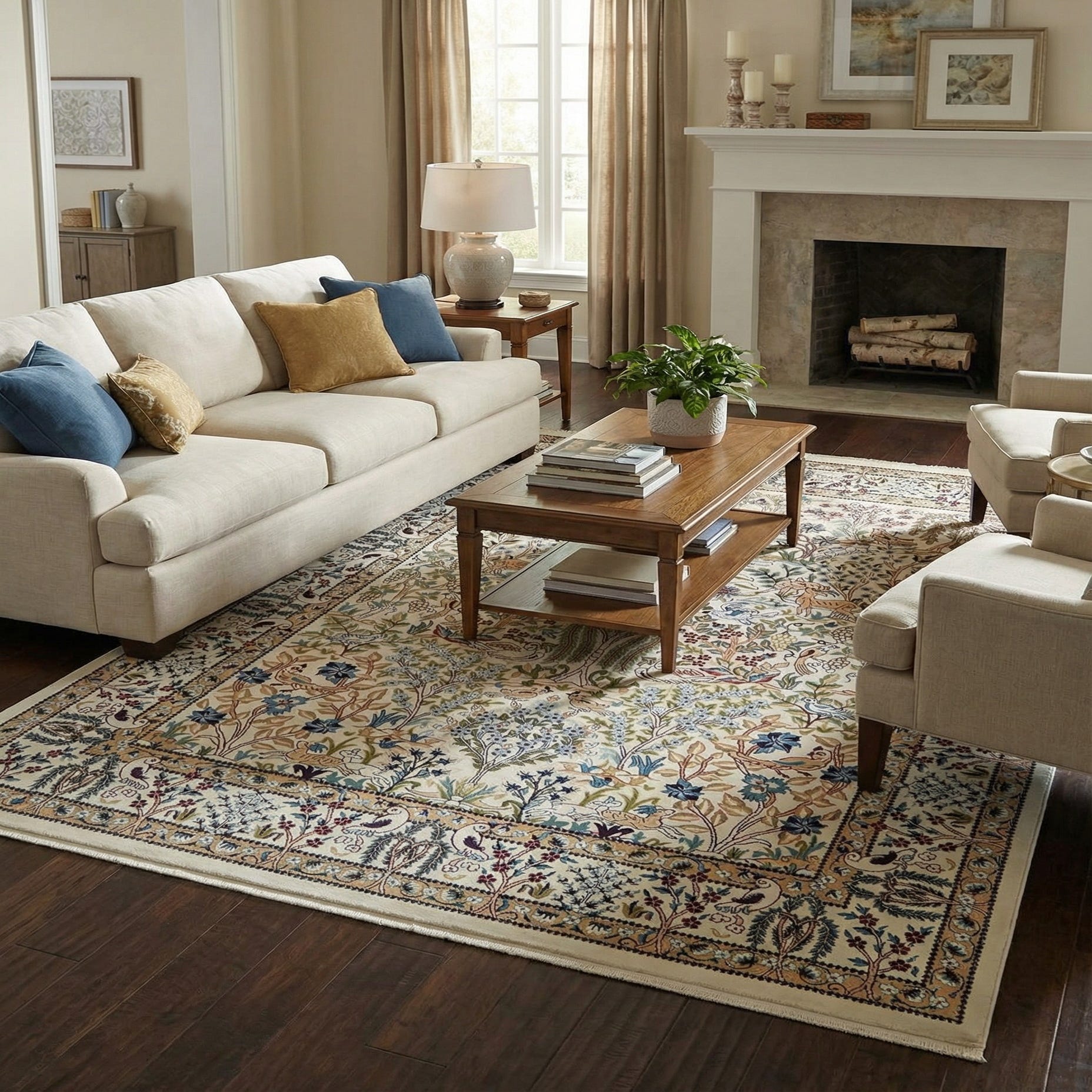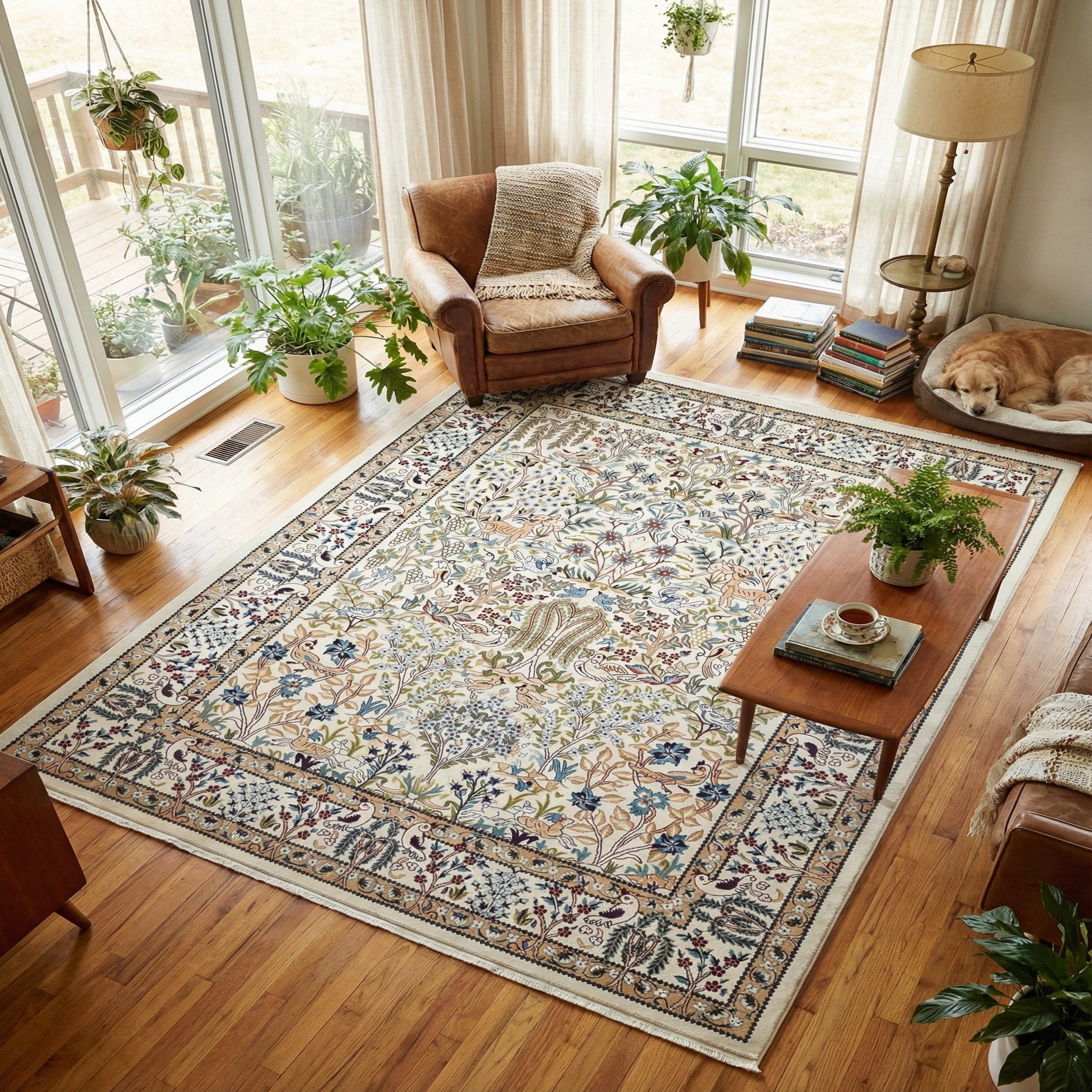An 8x10 rectangular ivory rug with a detailed traditional botanical pattern featuring trees, flowers, birds, and deer, framed by an ornate border.