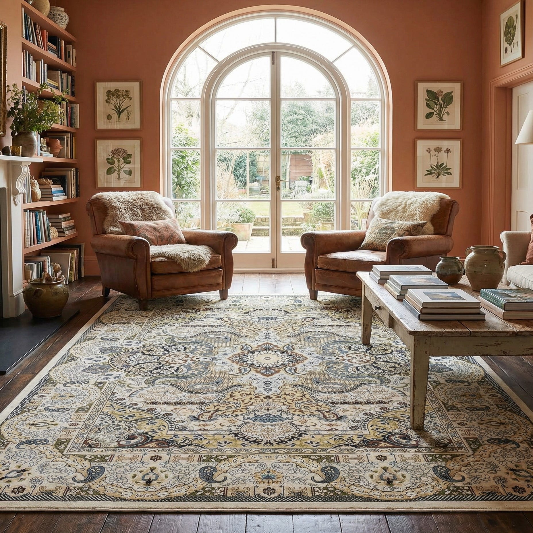 This piece works well anchoring a seating area or sitting beneath a dining table, and it pairs naturally with warm wood tones, neutral upholstery and deep-hued sofas in navy or plum. Use it in a traditional living room for a cohesive look, or in a transitional space to introduce pattern and color against clean-lined furniture; layered textiles in cream and burgundy or brass-accented lighting will bring the colors together.