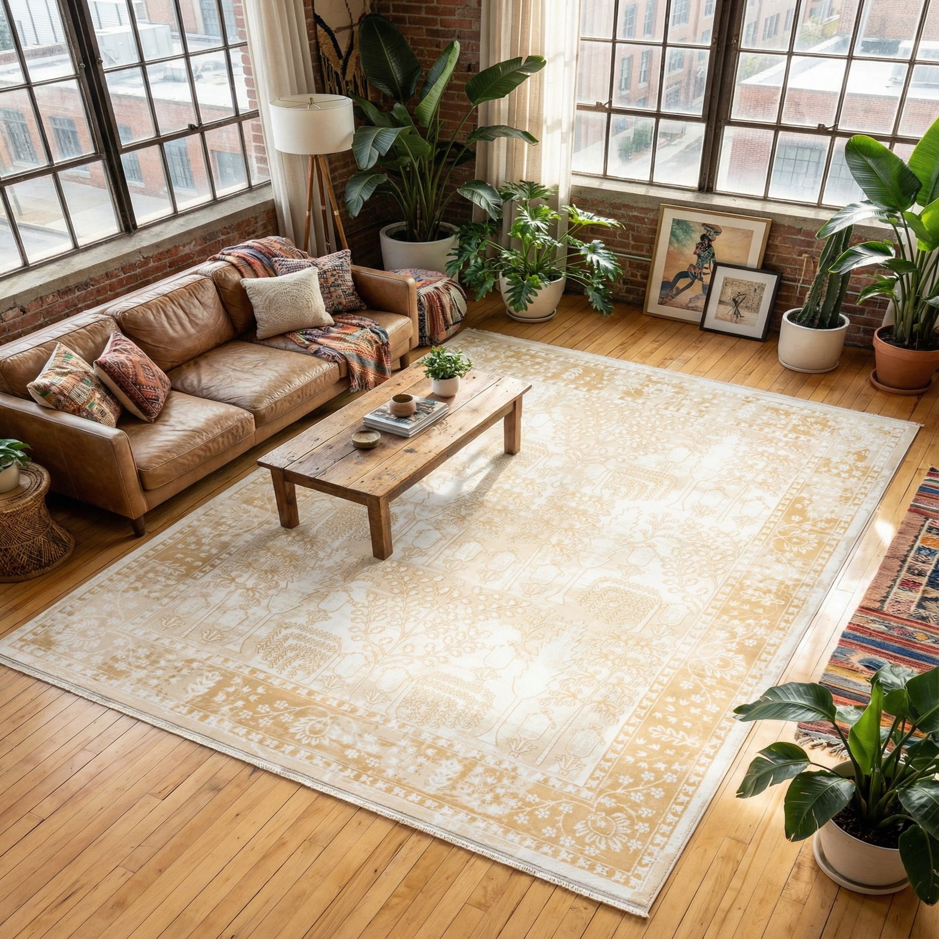 A soft ivory field provides a calm backdrop for a lightly distressed, classic floral-and-tree pattern rendered in warm beige tones. The design nods to traditional Persian motifs with repeating botanical medallions and a subtle border that frames the field without overpowering it. Machine-made construction of 85% polypropylene and 15% chenille gives the surface a gentle, tactile quality — the chenille threads add a plush, velvety touch while the polypropylene keeps the pile low enough for furniture placement and everyday use.