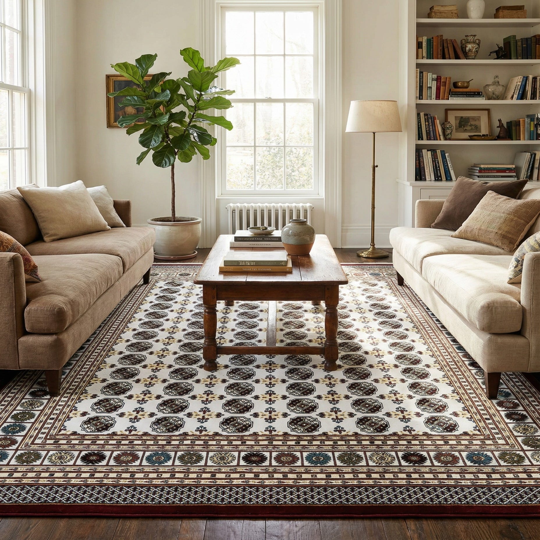 Primary color is Ivory. Colors in this rug include: Ivory, Blue, Beige, Red, Olive.