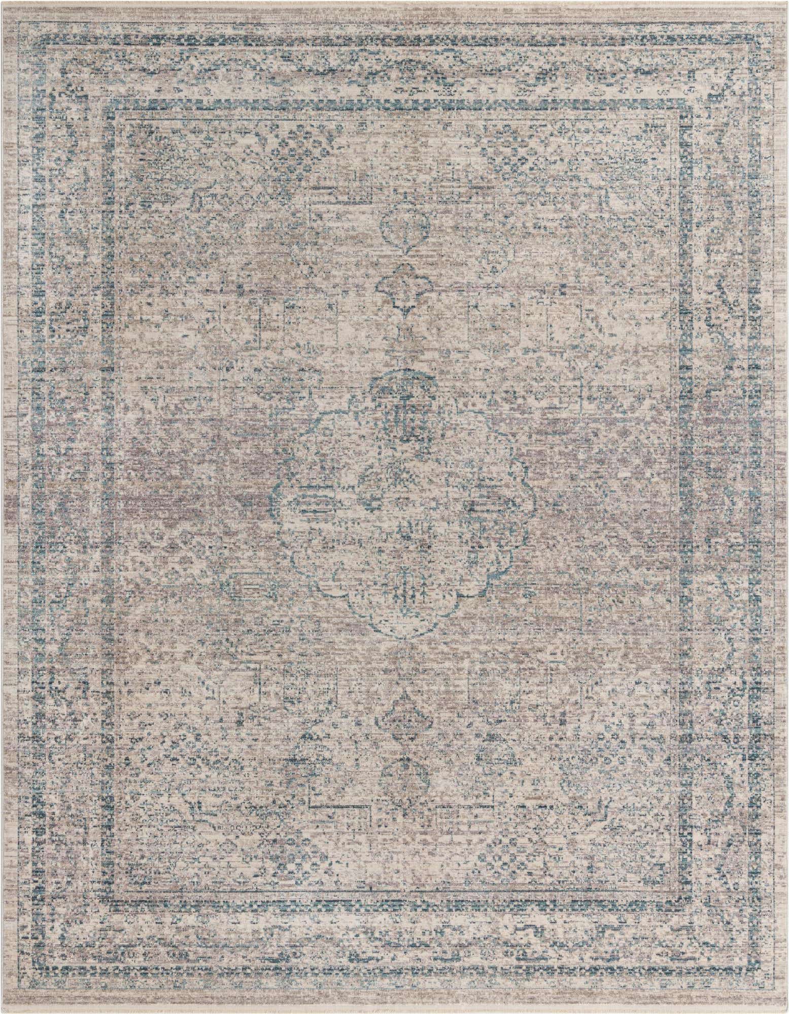 The Noble Collection offers a versatile 8x10 rug that artfully integrates into various interior themes. Crafted with precision, it is machine-woven from 100% polyester, providing durability with a soft texture. This rug presents a symmetrically centered ornamental design complemented by a gracefully worn look, encapsulating a sense of historic charm. Its ivory background is skillfully accented with hues of gray, navy blue, beige, and light blue, creating a serene color palette.
