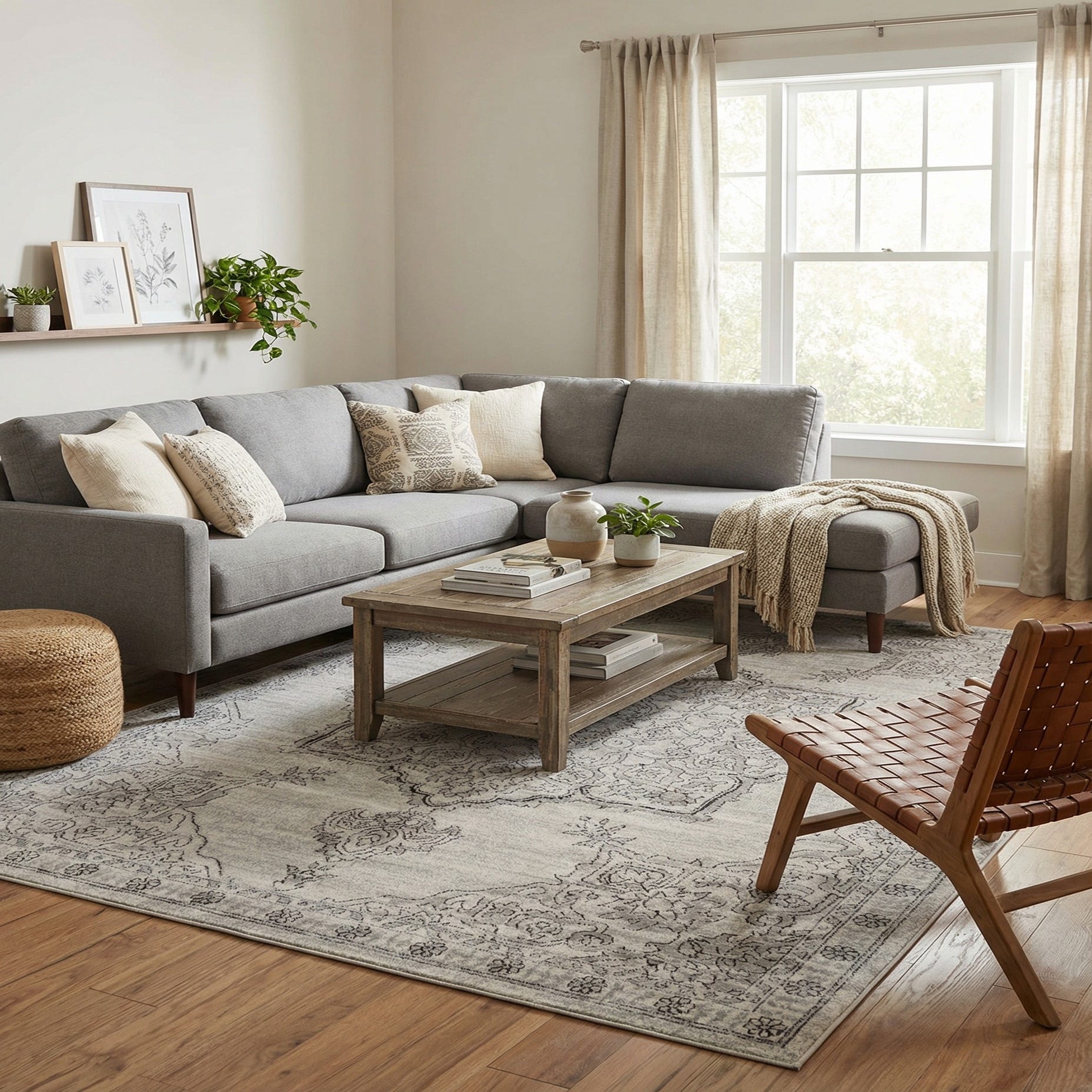 This rug works well as an anchor in a living room beneath a coffee table, layered under a dining table to balance a light-filled space, or placed in a bedroom to add understated pattern without overwhelming other finishes. It coordinates easily with natural wood tones, black metal accents, and neutral upholstery, making it a versatile choice for transitional, modern farmhouse, or contemporary interiors.