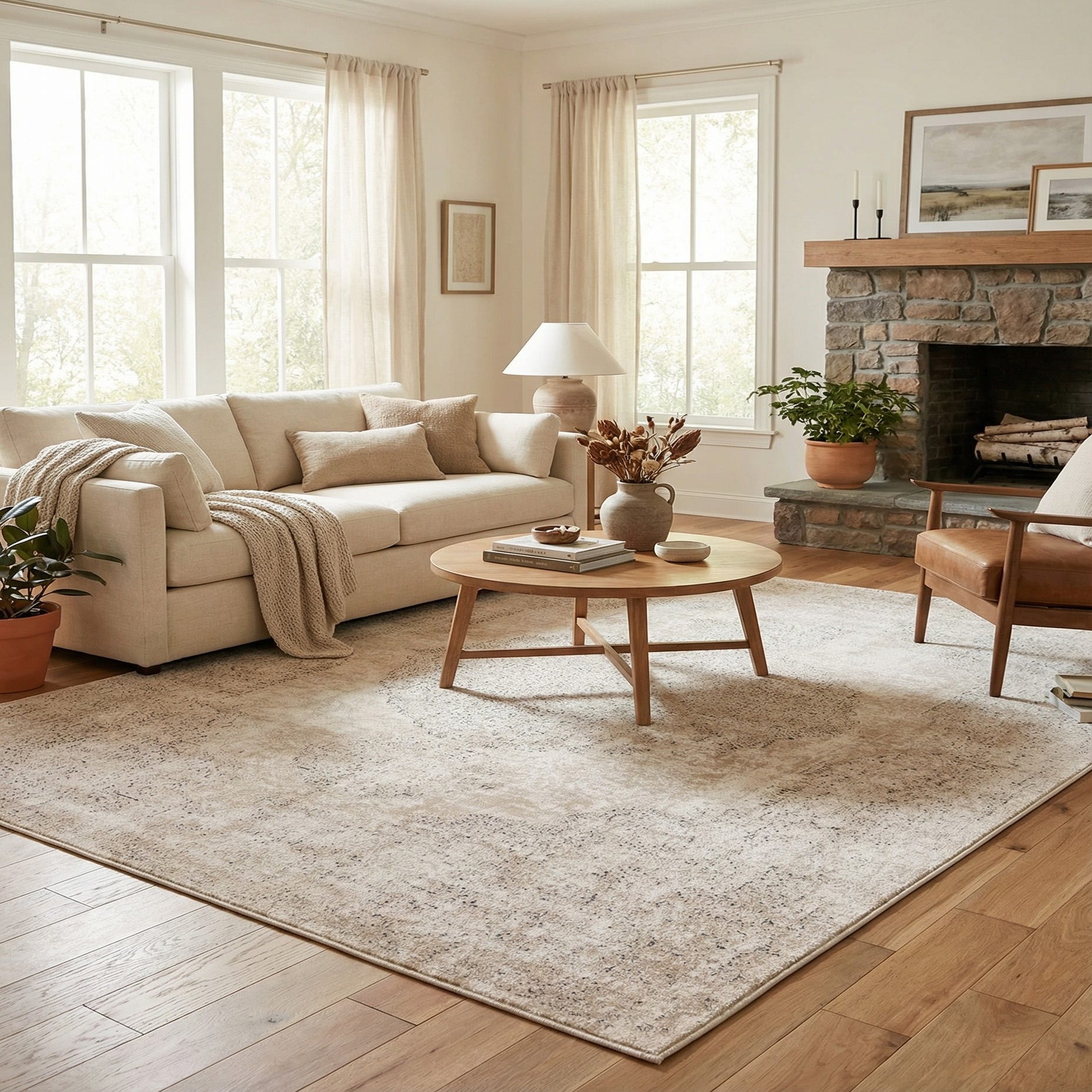 An 8x10 rectangular ivory and cream shabby-chic rug with a subtle vintage medallion pattern, ideal for a living room.