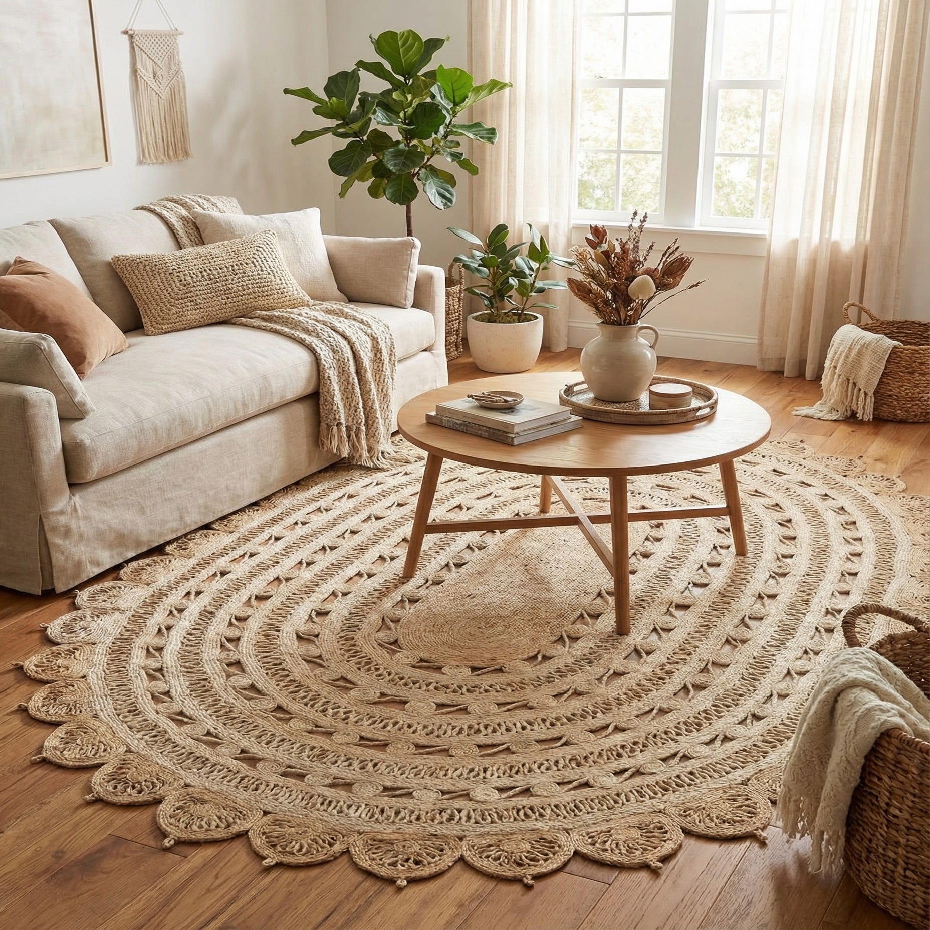 This rug works well layered over hardwood in a relaxed living room, tucked beneath a round dining table, or at the foot of a bed to introduce natural texture without heavy color. Its neutral palette and organic construction suit coastal, bohemian, farmhouse, or casual contemporary interiors, and it brings a handcrafted touch to entryways, sunrooms, or covered porches.