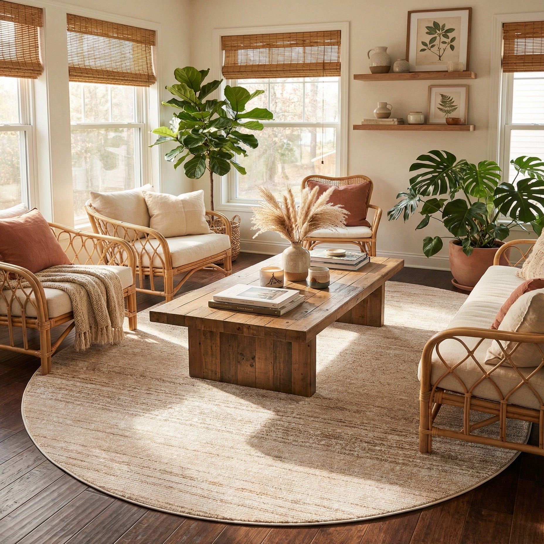 The oval shape brings a softened edge to hard-lined furniture and is well suited to living rooms beneath a coffee table, entryways that need a welcoming anchor, or a bedroom seating nook. It pairs naturally with light woods, linen upholstery, and muted greens for a Scandinavian or coastal look, and also complements modern farmhouse and contemporary interiors that favor warm neutrals and layered textures.