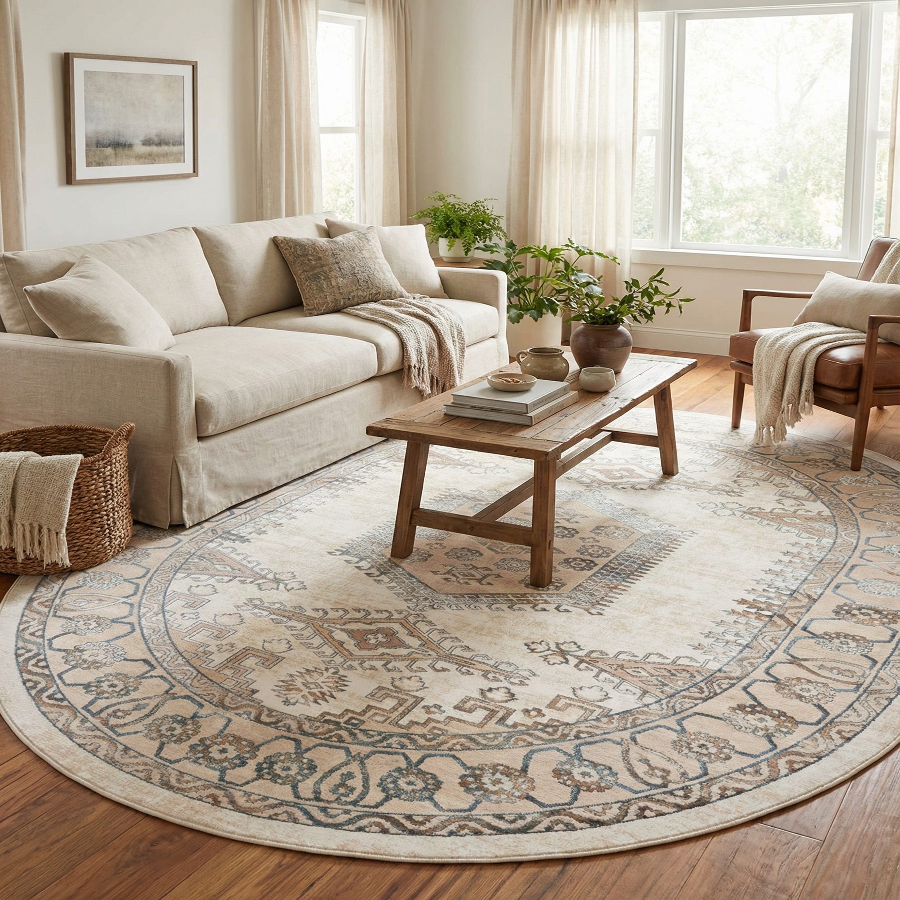 Machine made of 60% polypropylene and 40% polyester, the rug has a low-pile, smooth surface that feels soft underfoot and shows the pattern with gentle texture. Use it to anchor a seating area in a living room, center a round dining table, or soften a hallway or entry. The neutral palette and mixed traditional-transitional motifs complement wood furniture, painted cabinetry, and both modern and farmhouse interiors.