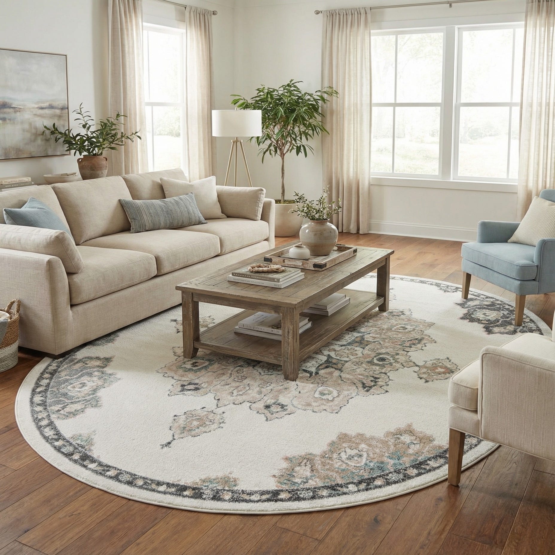 An oval ivory rug with a central medallion and floral patterns in muted blues, creams, and grays, framed by a dark border.