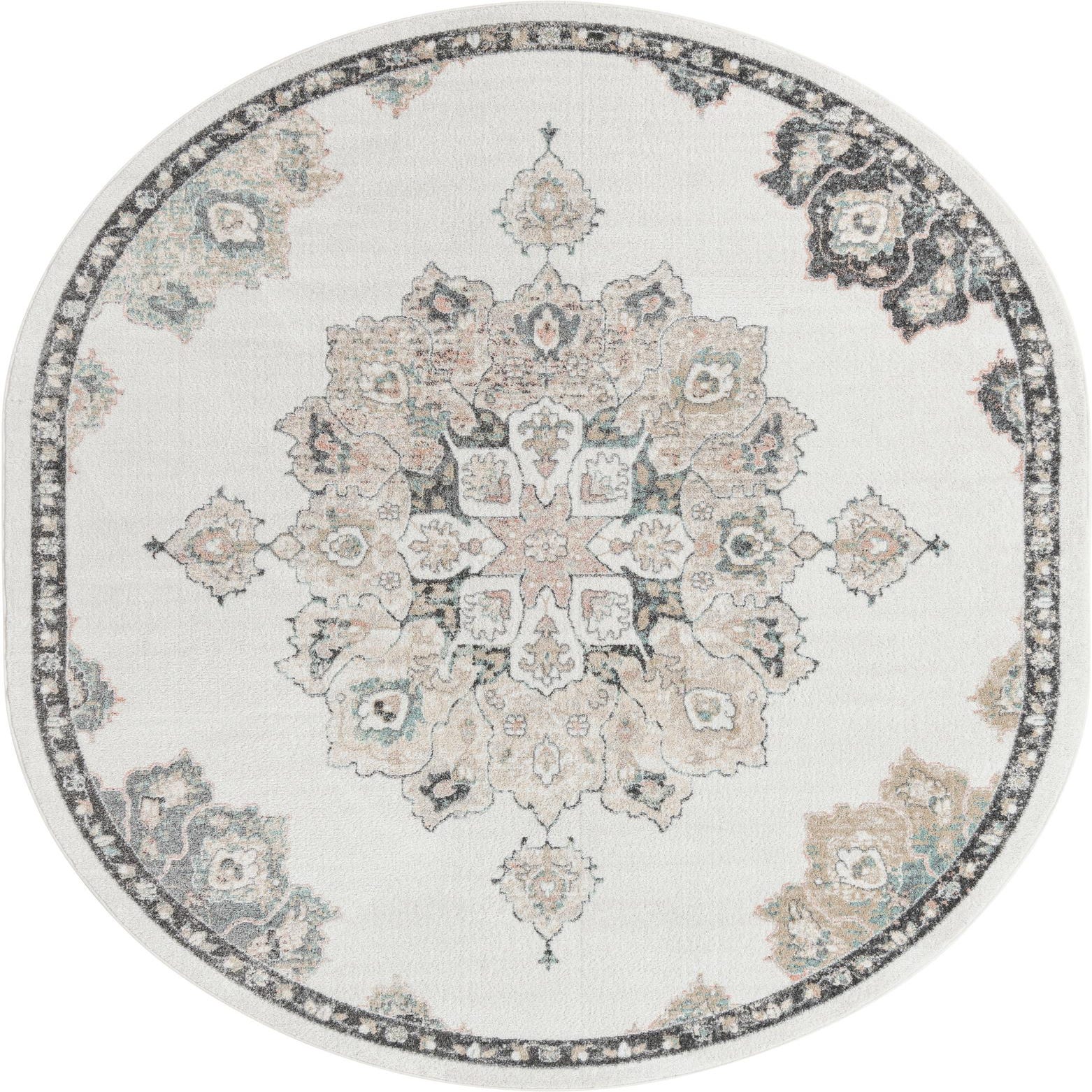A soft ivory field sets a calm backdrop for a classic medallion motif rendered in warm beige and gentle pink, with black accents that define the pattern and add subtle contrast. The design blends floral elements and ornamental details in a slightly aged, low-contrast finish that gives the rug a vintage-inspired look without heavy distressing. An ornate inner border echoes the central medallion and helps frame the oval shape, creating a balanced, pulled-together appearance.