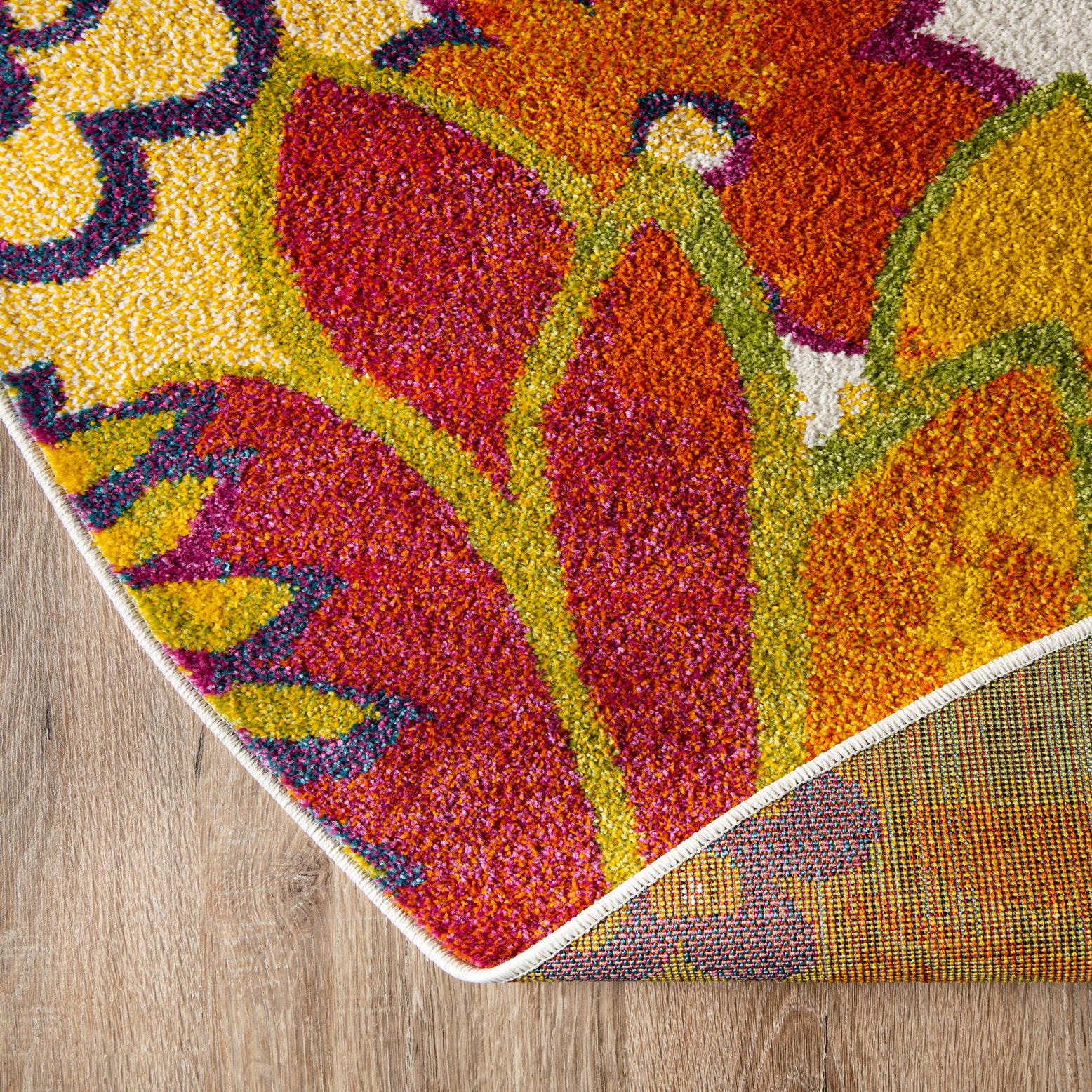 An oval rug featuring a vibrant modern floral pattern with large blooms in yellow, orange, red, green, and purple on an ivory background.