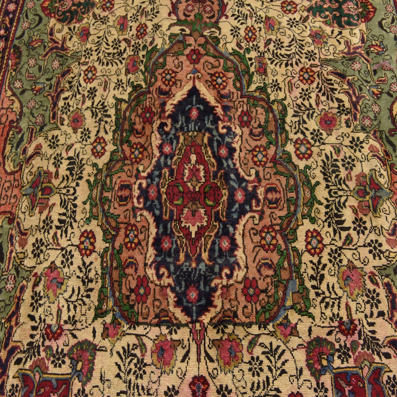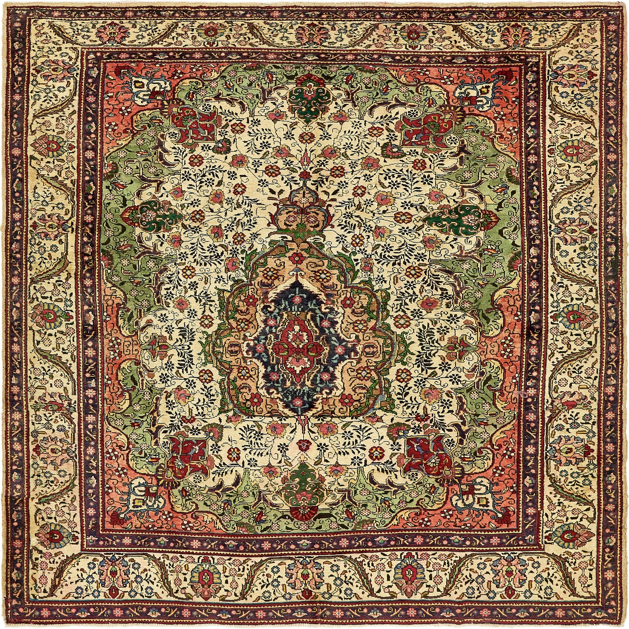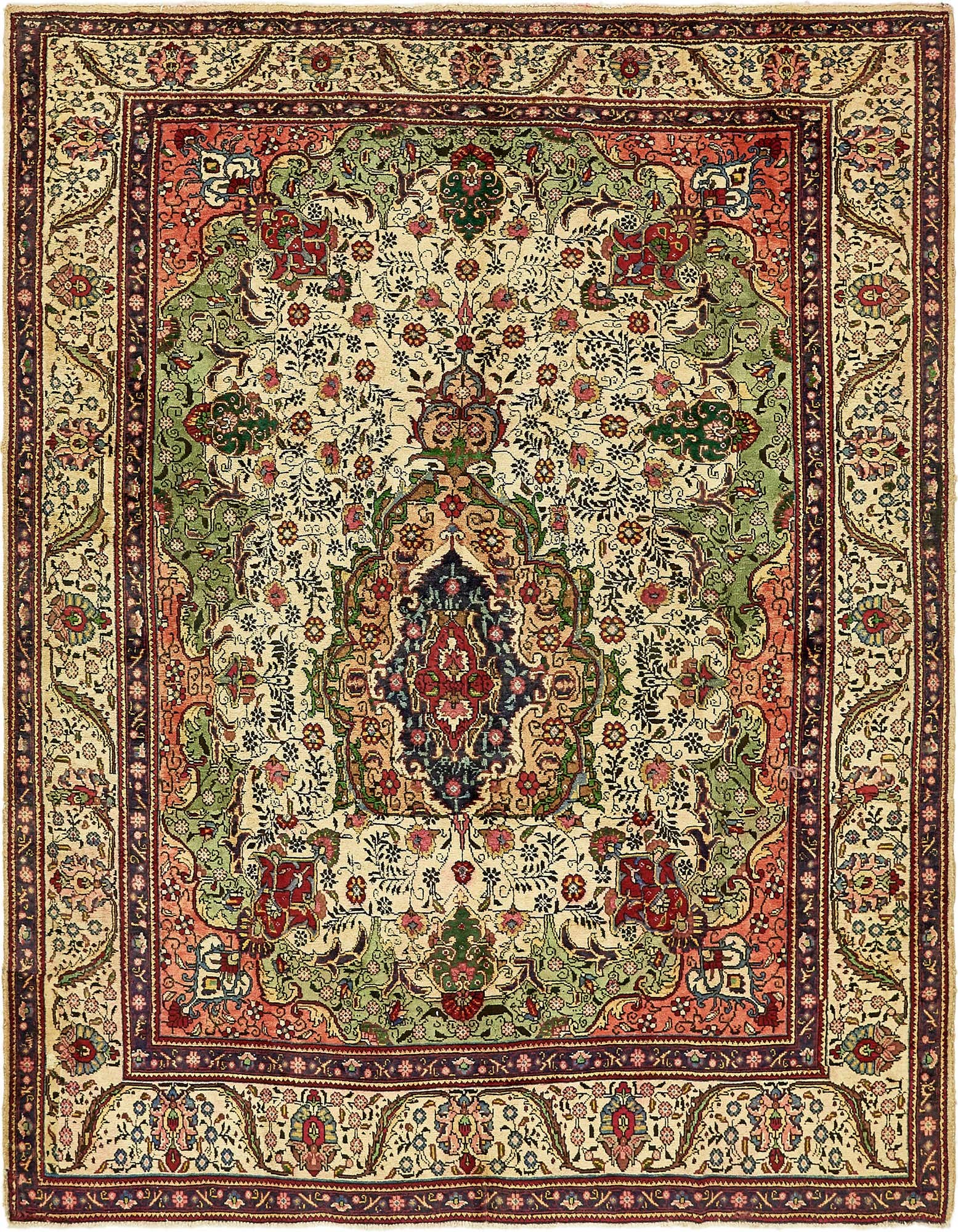 Primary color is Ivory. Colors in this rug include: Ivory, Beige, Blue, Green, Light Brown, Navy Blue, Olive, Peach.