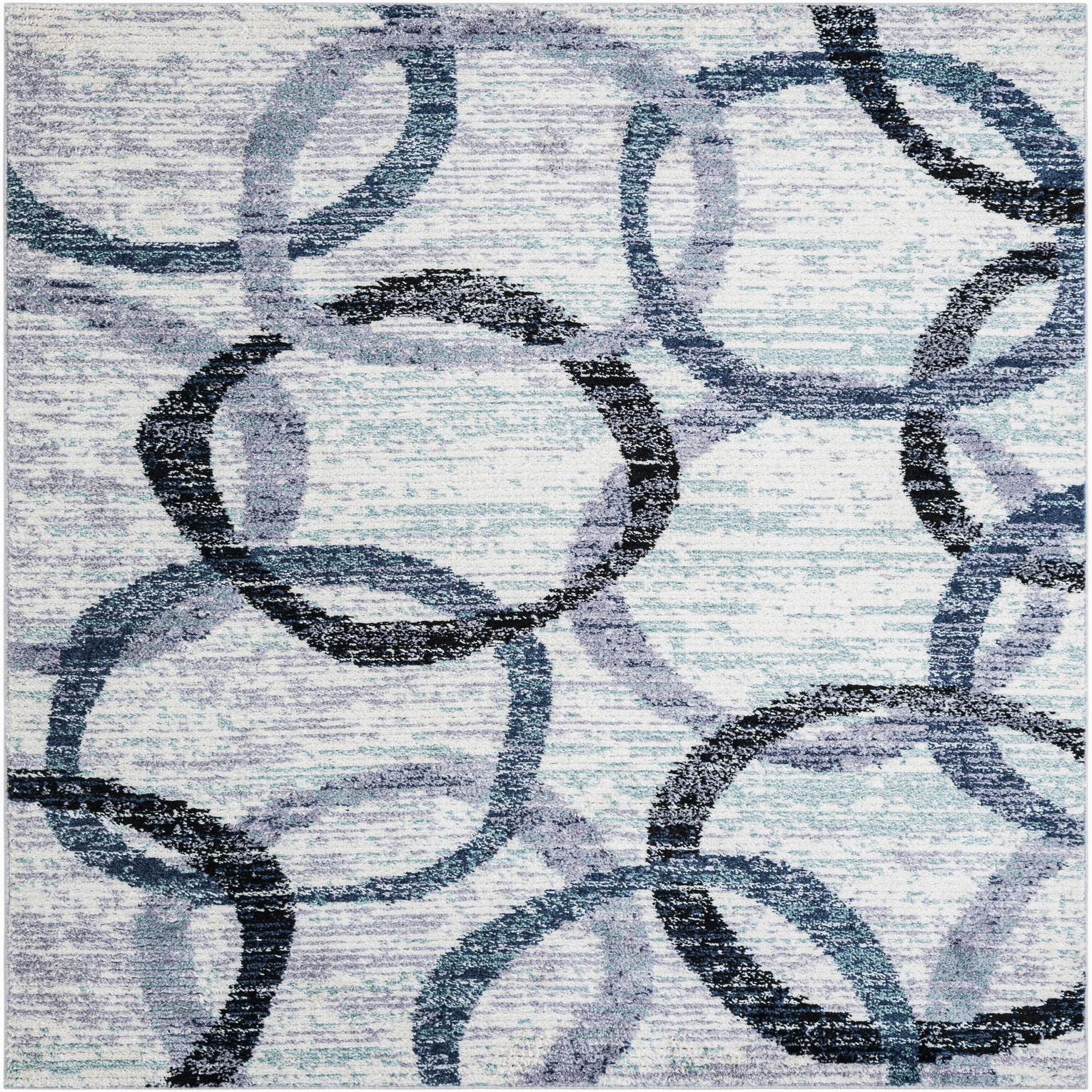 The Tucson collection rug is a versatile 8x10 piece constructed from 100% polyester that offers durability and a soft texture. The rug features an abstract pattern with interlocking rings that create a dynamic and modern aesthetic. The color palette includes soothing shades of ivory, gray, blue, navy blue, and light blue, set against an ivory background that provides a light and airy feel. The stain-resistant qualities of the rug's material make it a practical choice for high-traffic areas.