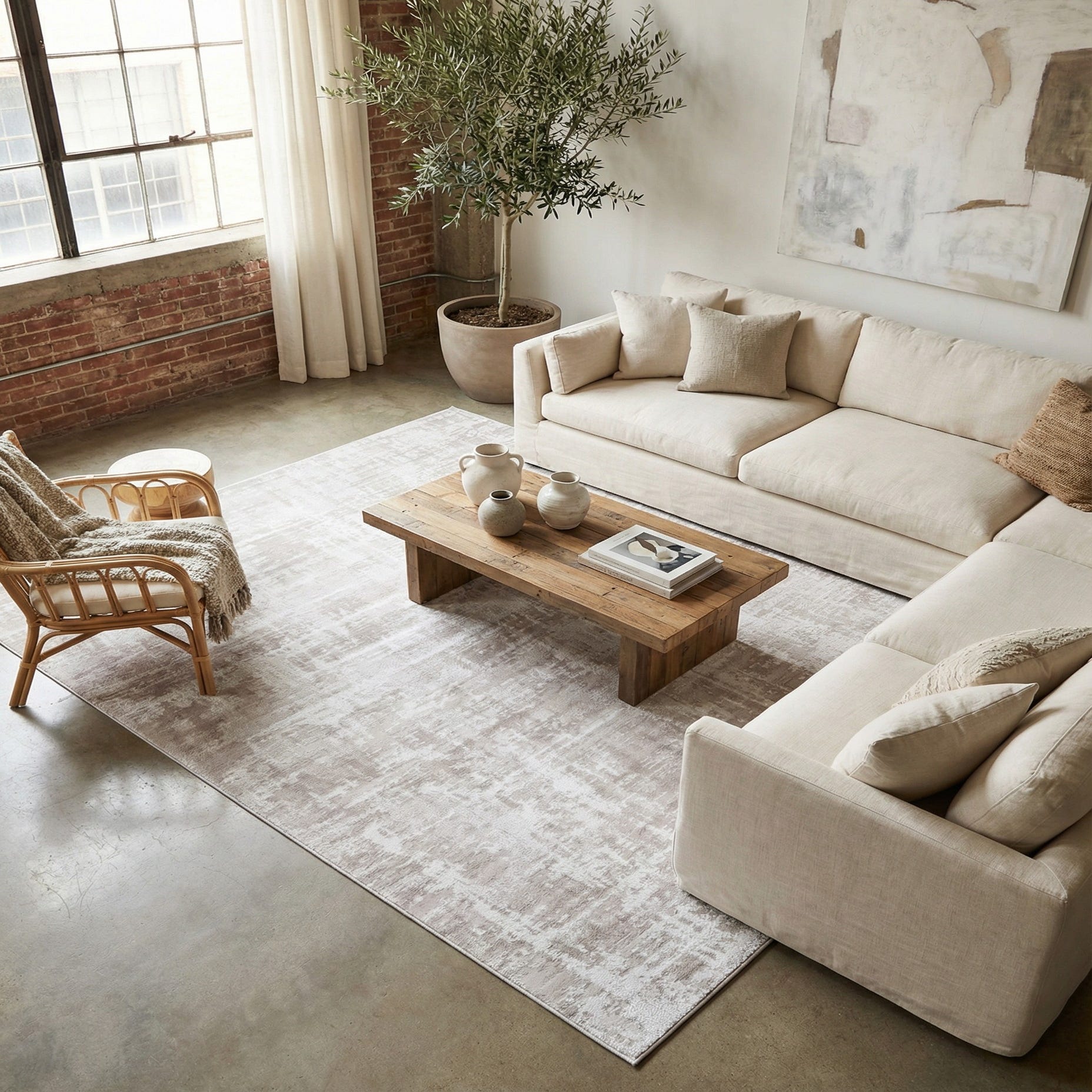 This neutral palette and restrained pattern work well in modern and transitional interiors—place it beneath a sofa to anchor a living room seating area, under a dining table for an understated backdrop, or layered in a bedroom to add warmth without heavy color. It pairs naturally with light woods, linen upholstery, and matte metal accents, and is well suited to minimalist, Scandinavian, or coastal-inspired schemes where a gentle texture and soft tone are preferred.