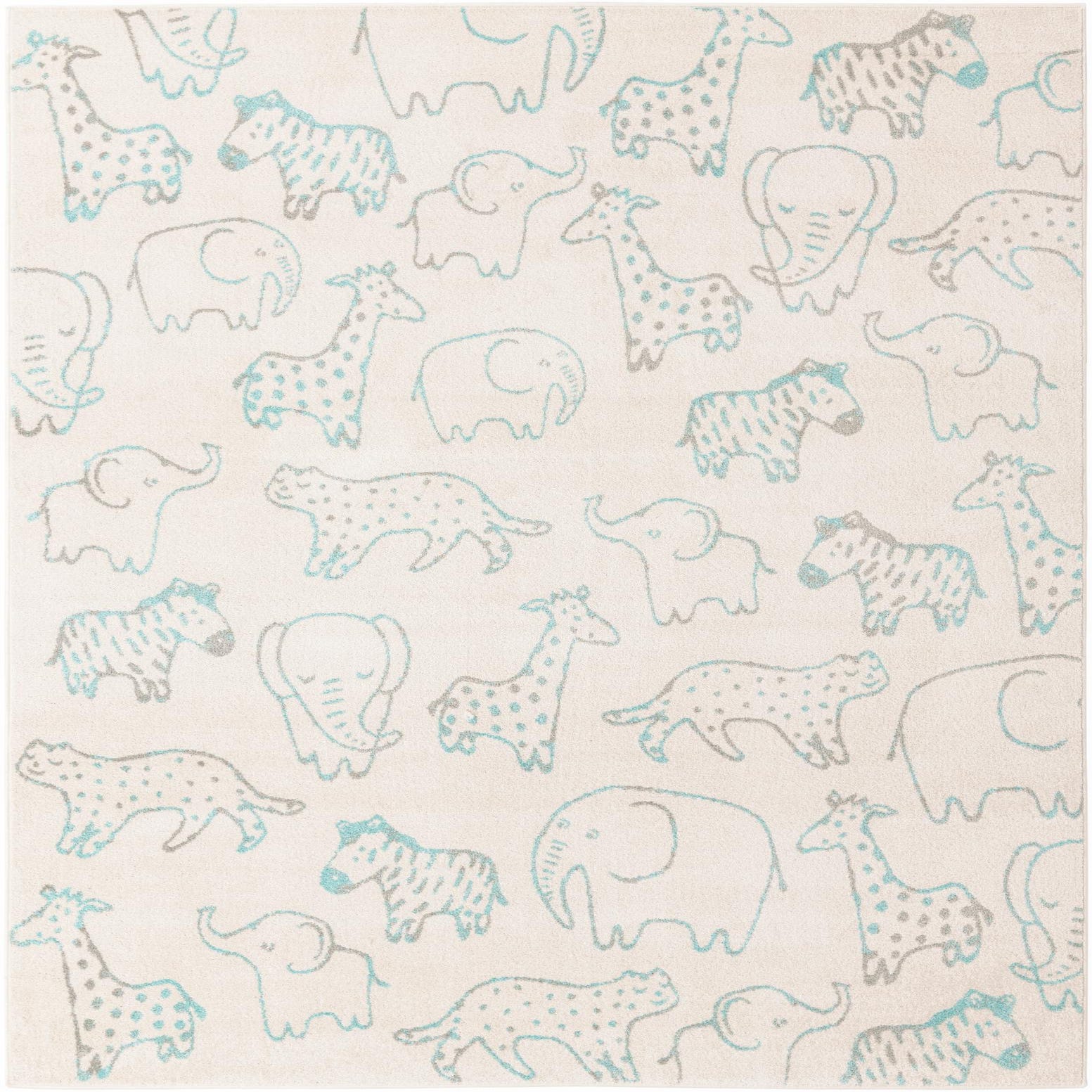 An 8x10 rectangular ivory rug featuring playful blue and gray outlined safari animals like elephants, giraffes, and zebras, perfect for a child's room.