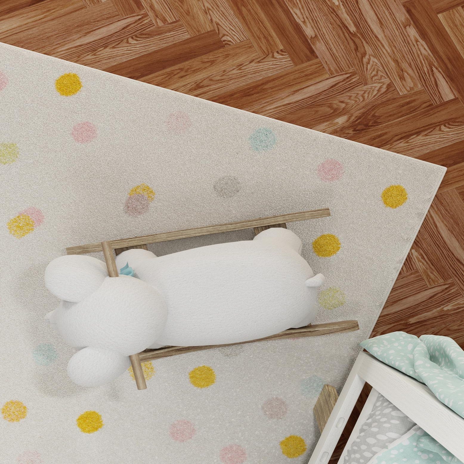 An ivory field punctuated with scattered polka dots in soft blue, gray, green, purple and pink creates a light, playful aesthetic that stays calm and approachable. The dots have a slightly irregular, hand-drawn quality that adds movement across the surface without competing with other room elements. The low-to-medium pile has a smooth, slightly velvety feel underfoot, offering a gentle cushion when sitting or playing on the floor.