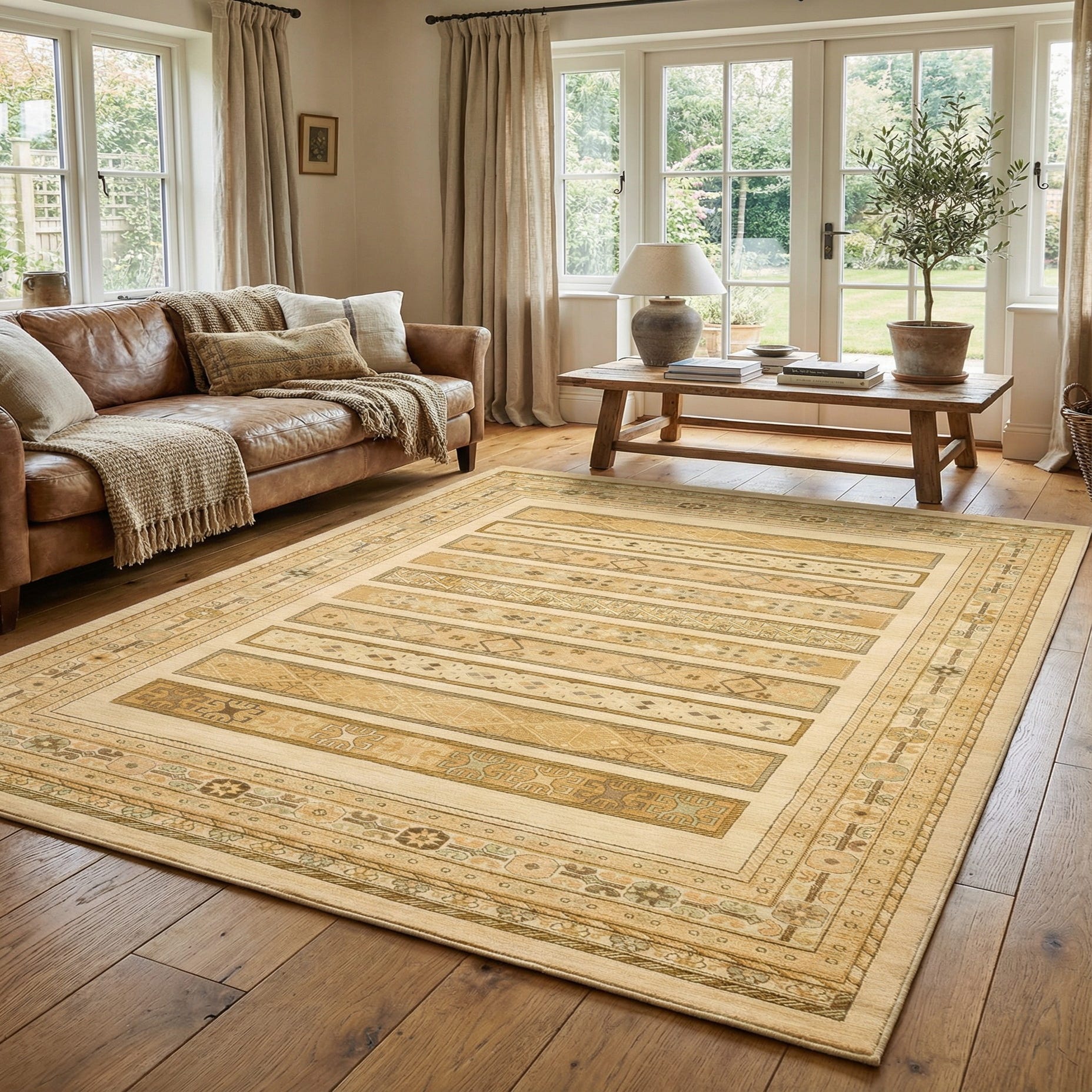 This rug works well in a transitional living room or a relaxed, modern farmhouse setting, where its neutral palette complements warm wood tones, linen upholstery and muted green accents. It also suits a formal dining area as a grounding element beneath the table or a home office where calm, structured patterning helps define the space.