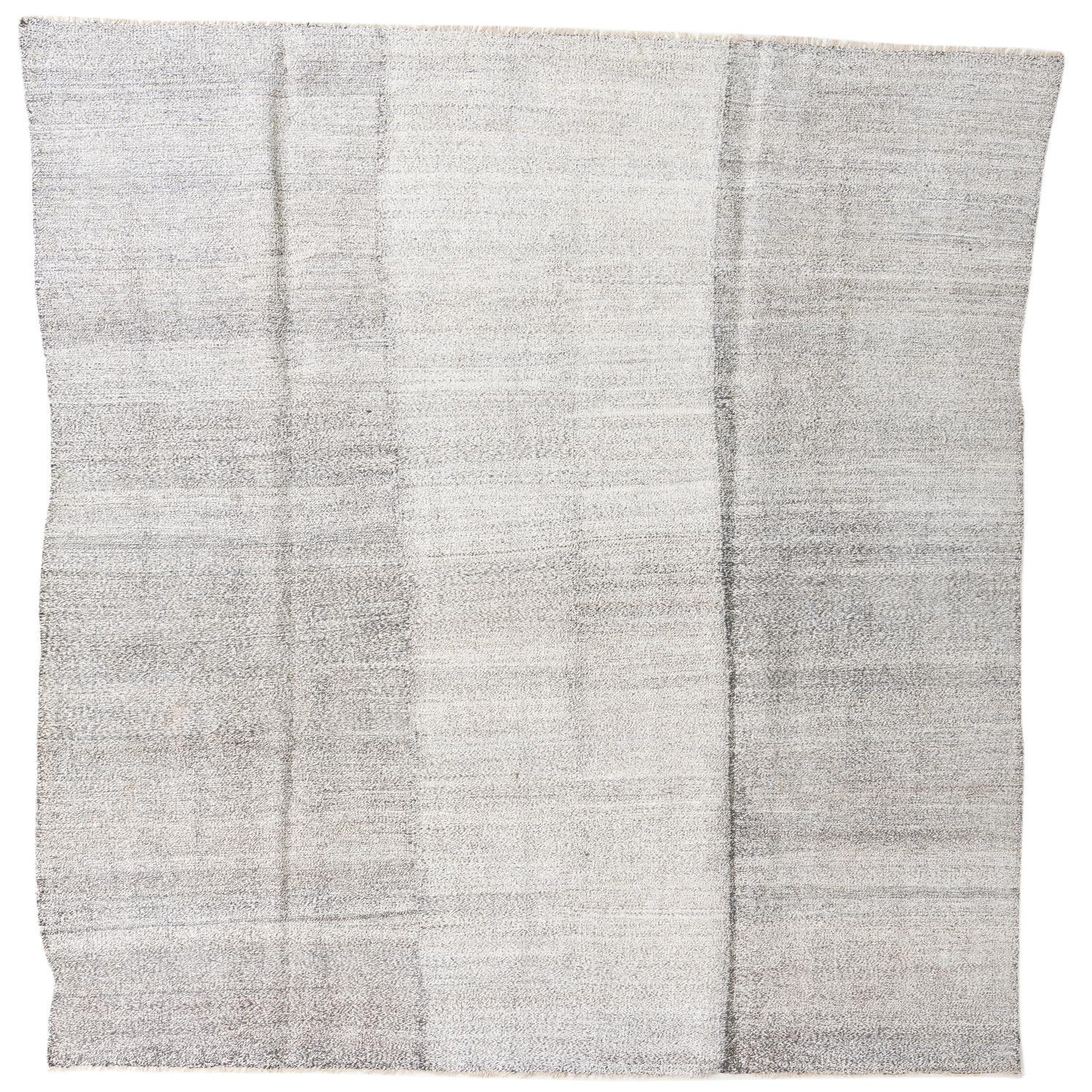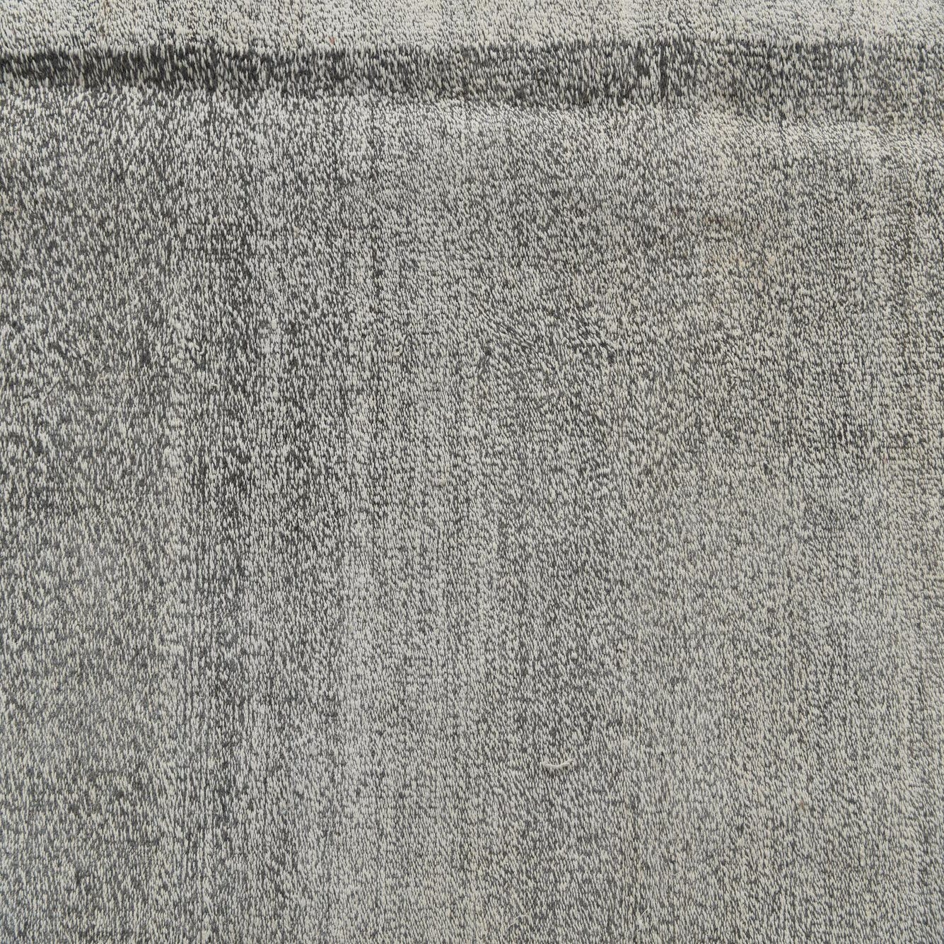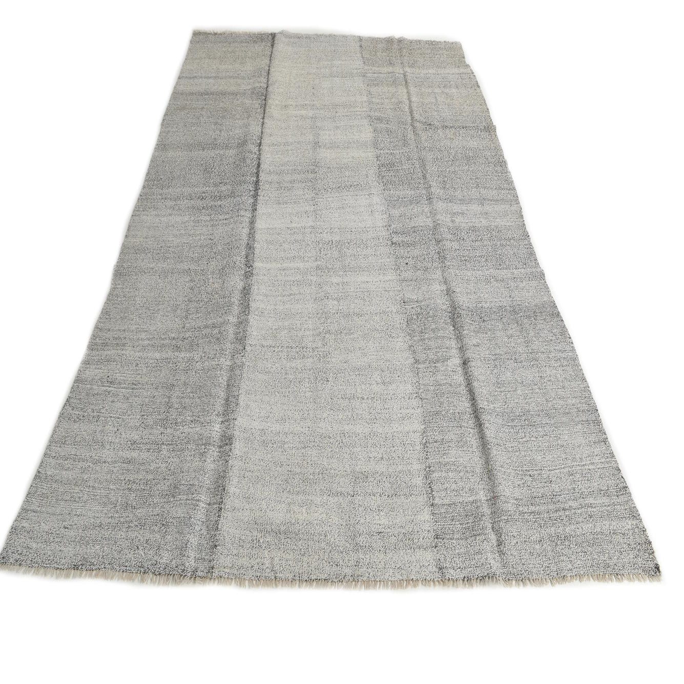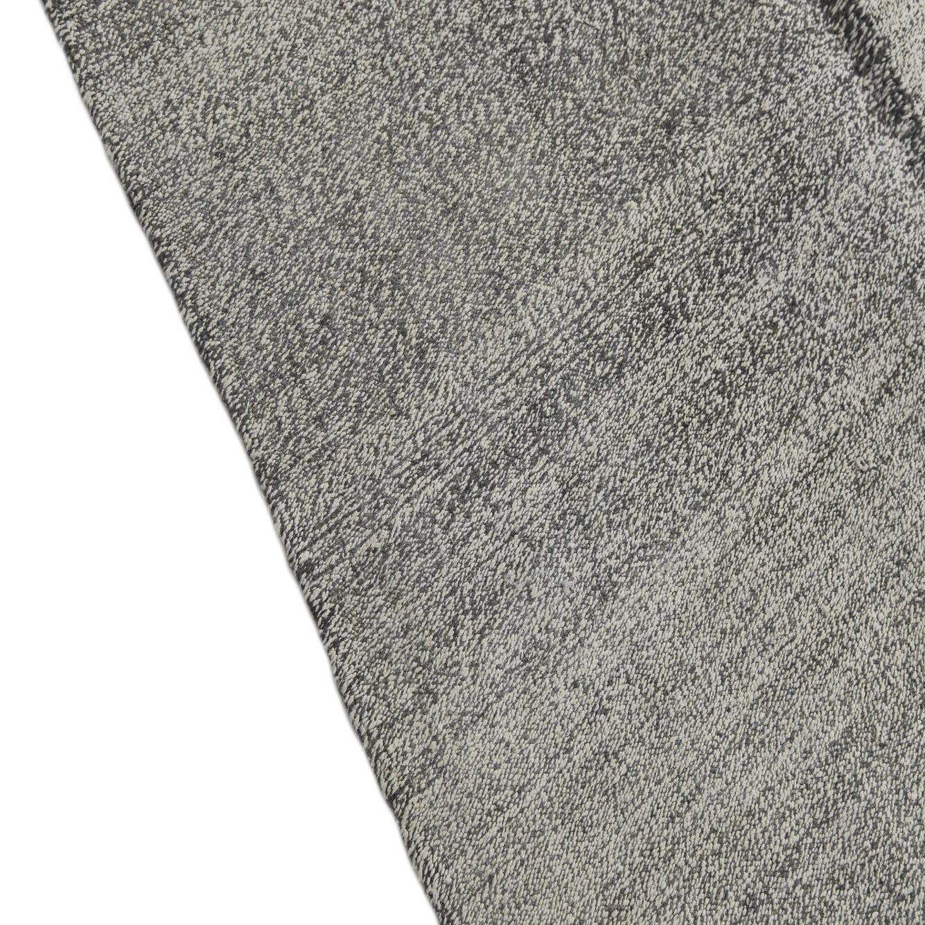This Kilim Modern collection rug is hand-woven from 100% wool, offering a naturally textured surface with durable qualities. The 8x11 size is generous, making it suitable for accommodating both larger spaces and defining areas within open-plan interiors. The rug showcases a clean, understated pattern with subtle gray striations over an ivory background, lending a contemporary yet versatile appeal. Its simple design is punctuated by a traditional fringe detail, creating a balance between modernity and classic charm.