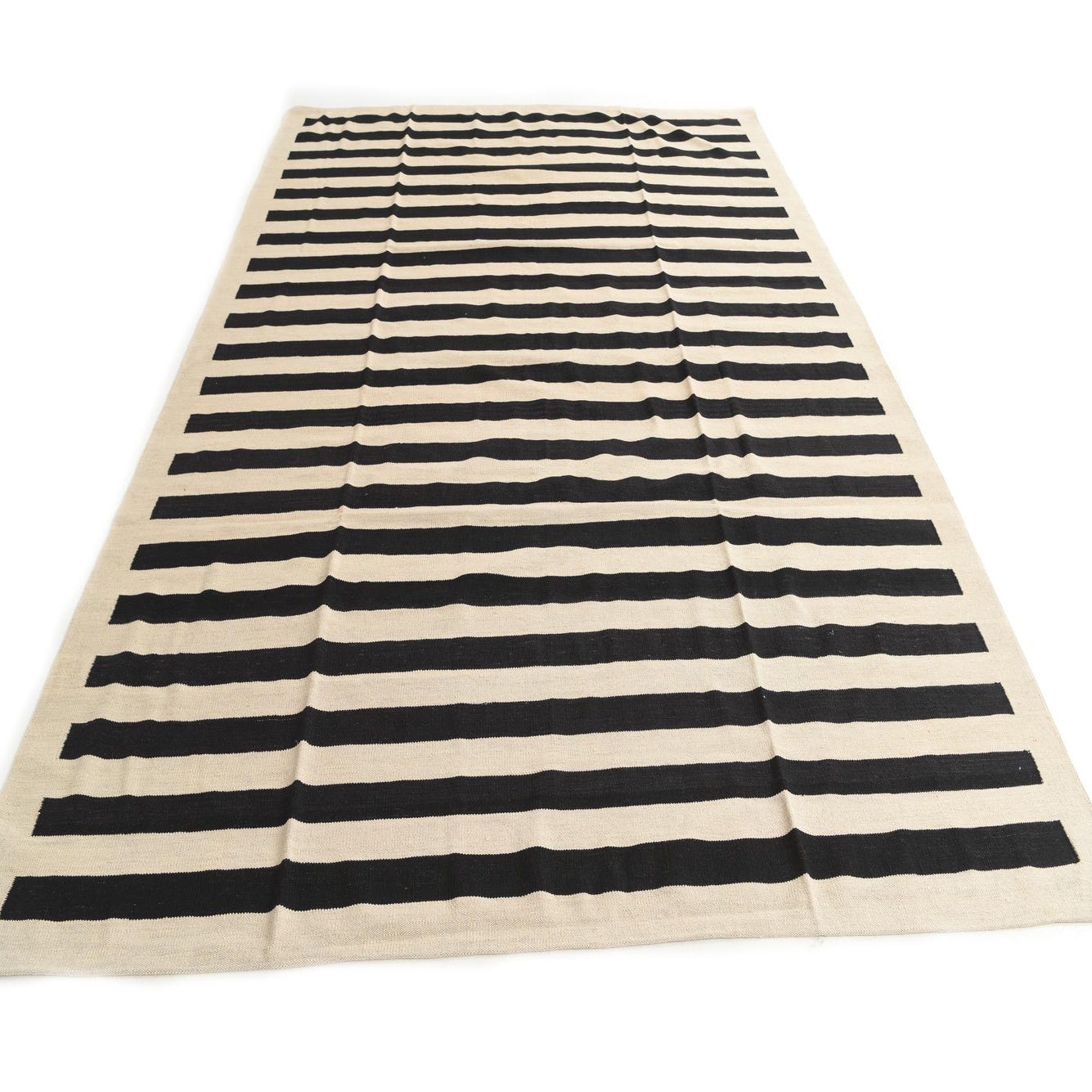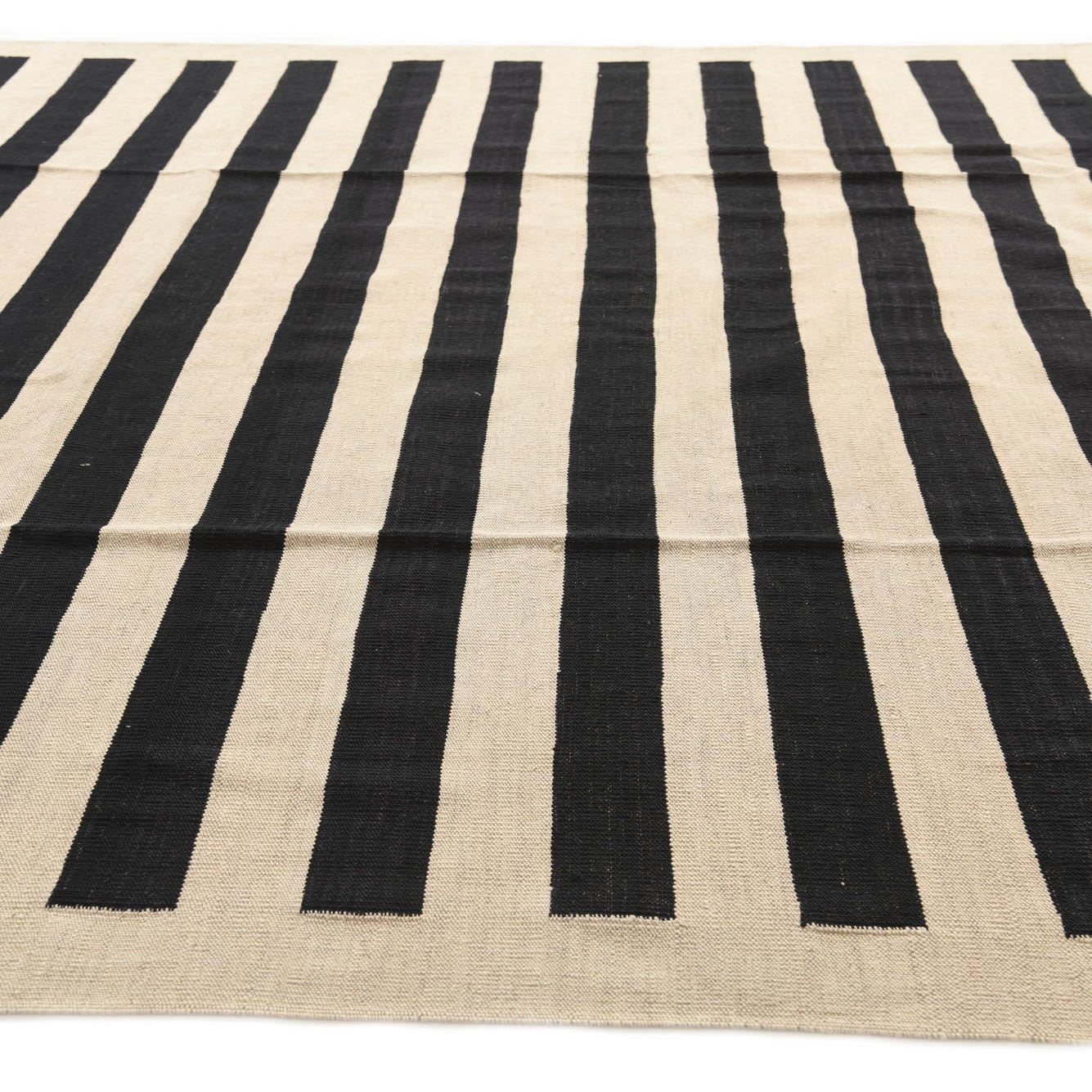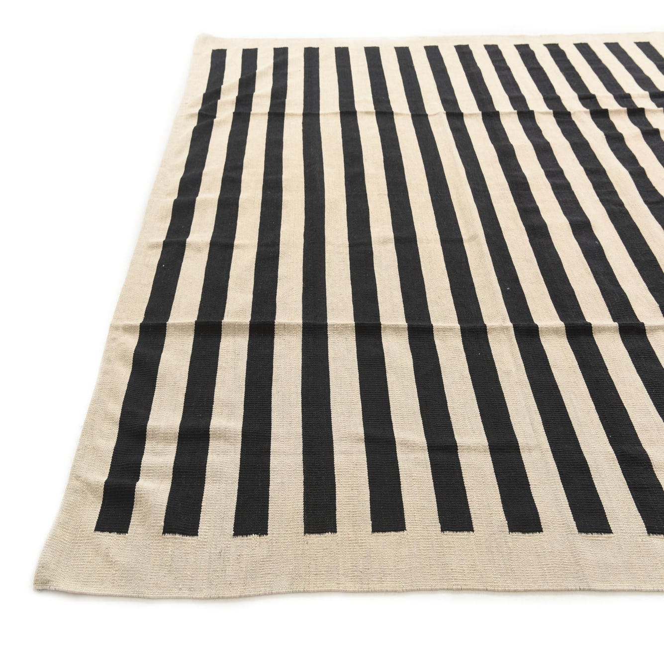 A large 8x11 rectangular ivory and black striped flatweave rug, ideal for a modern living room.
