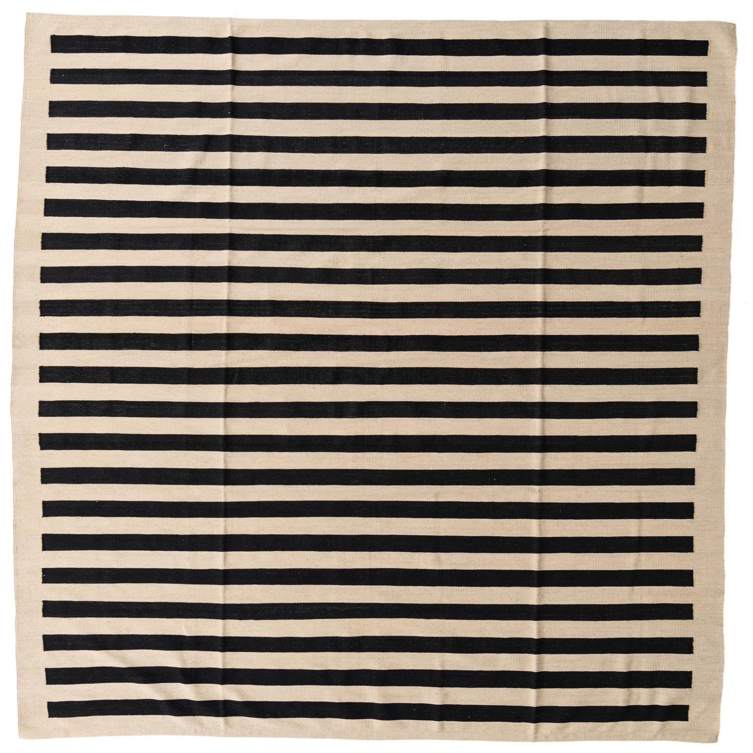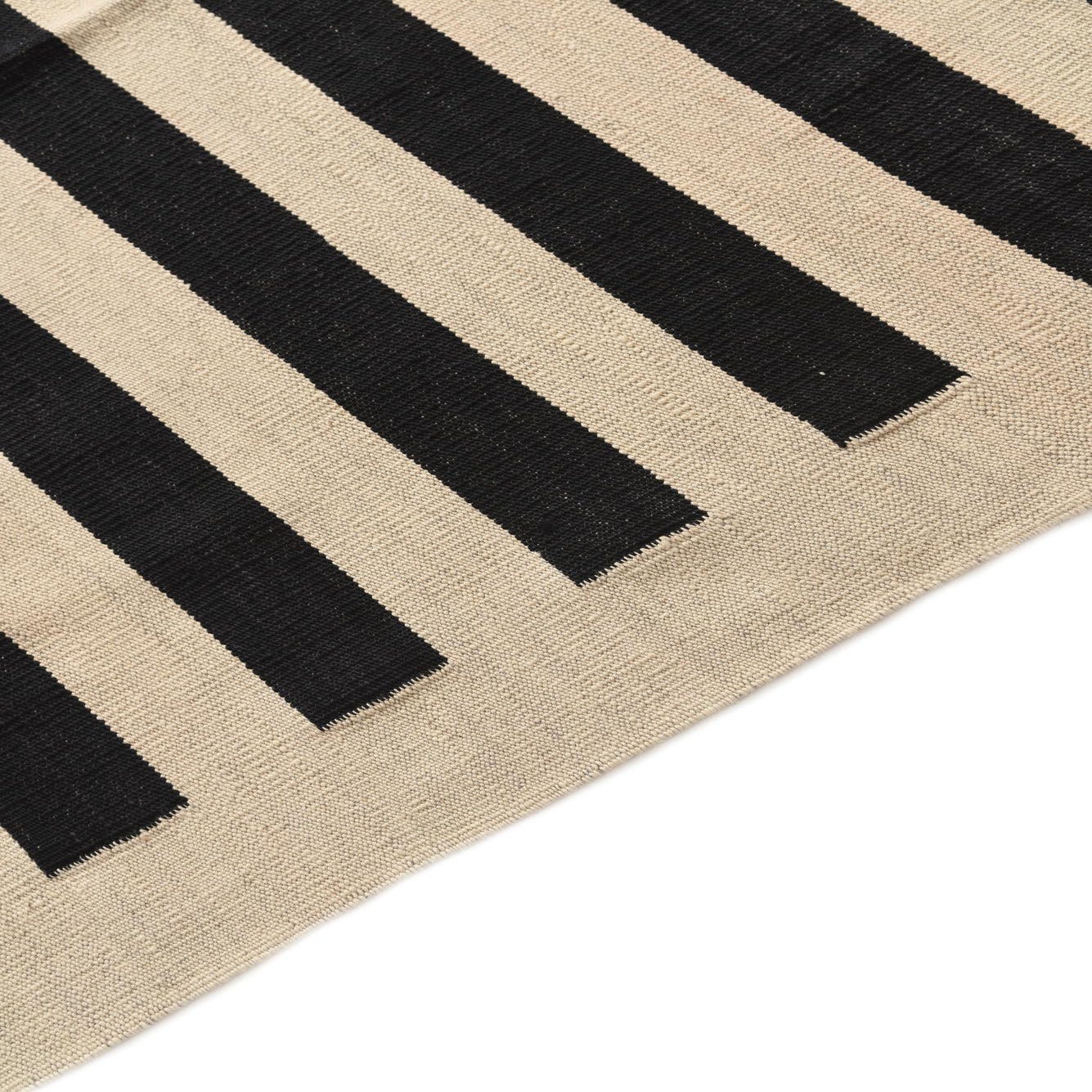 The Kilim Modern collection presents a hand-woven 8x11 rug, distinguished by its clear-cut design and monochromatic palette. This rug showcases a bold, linear pattern with black stripes contrasting effectively on an ivory background, providing visual interest and a dynamic aesthetic. The use of 100% wool guarantees a soft texture and a sturdy composition, ensuring durability and comfort underfoot.