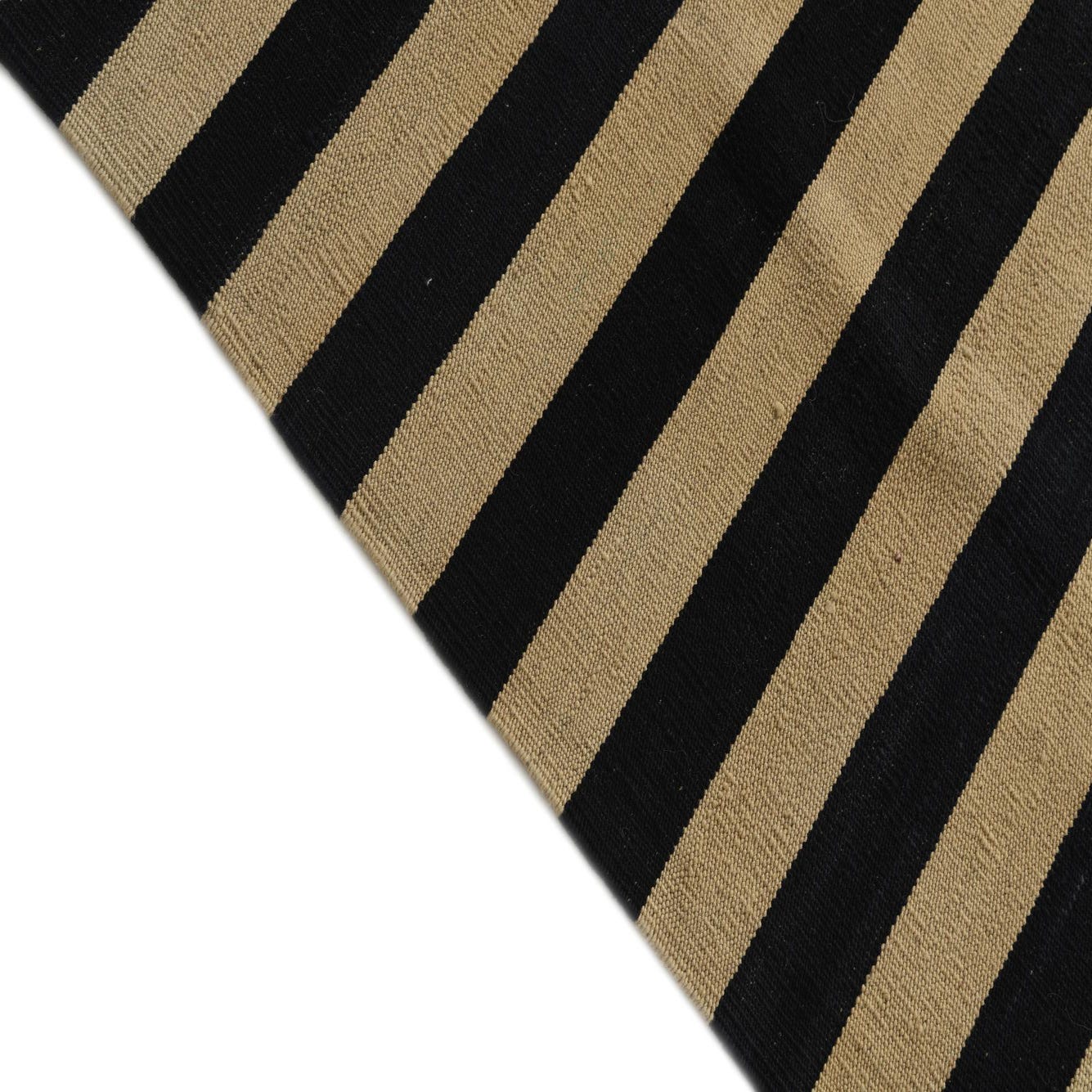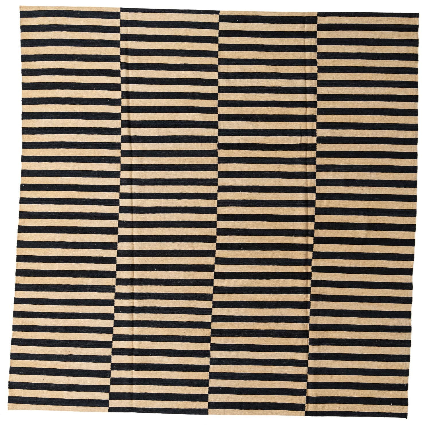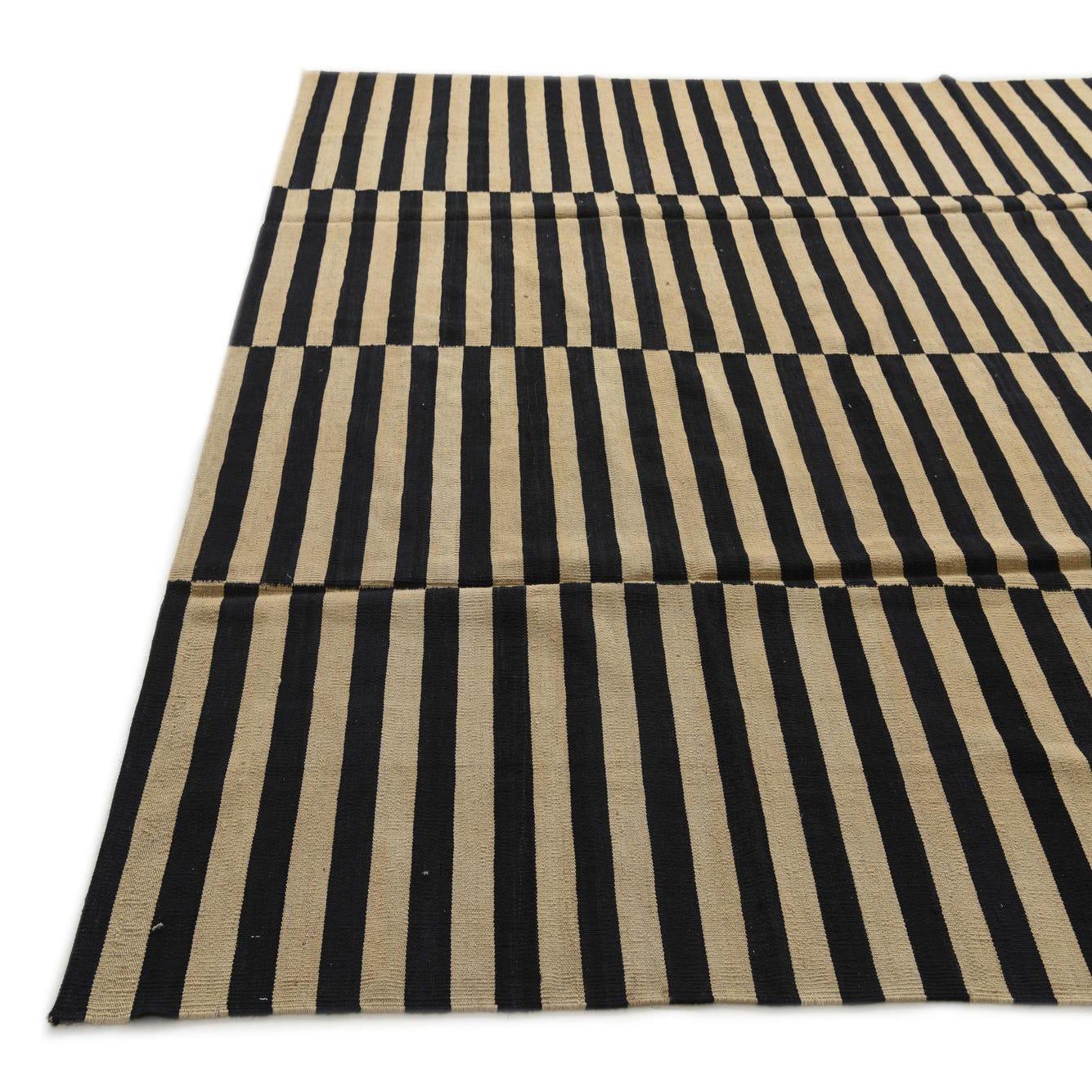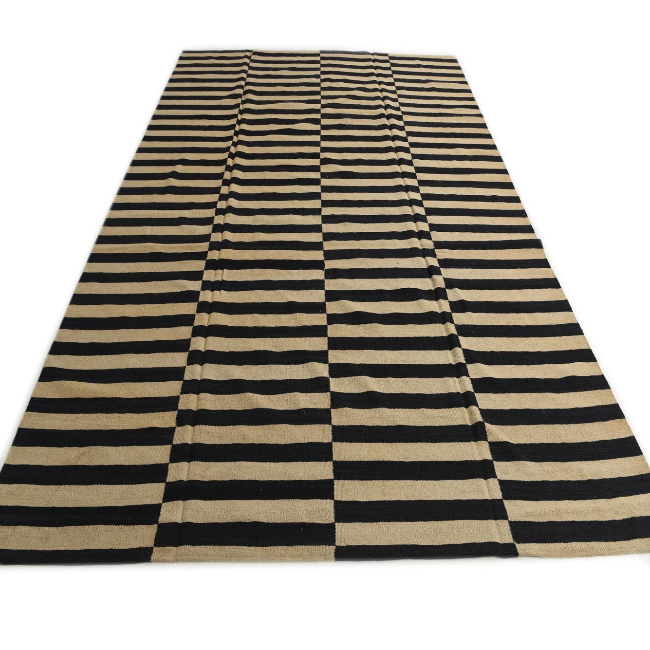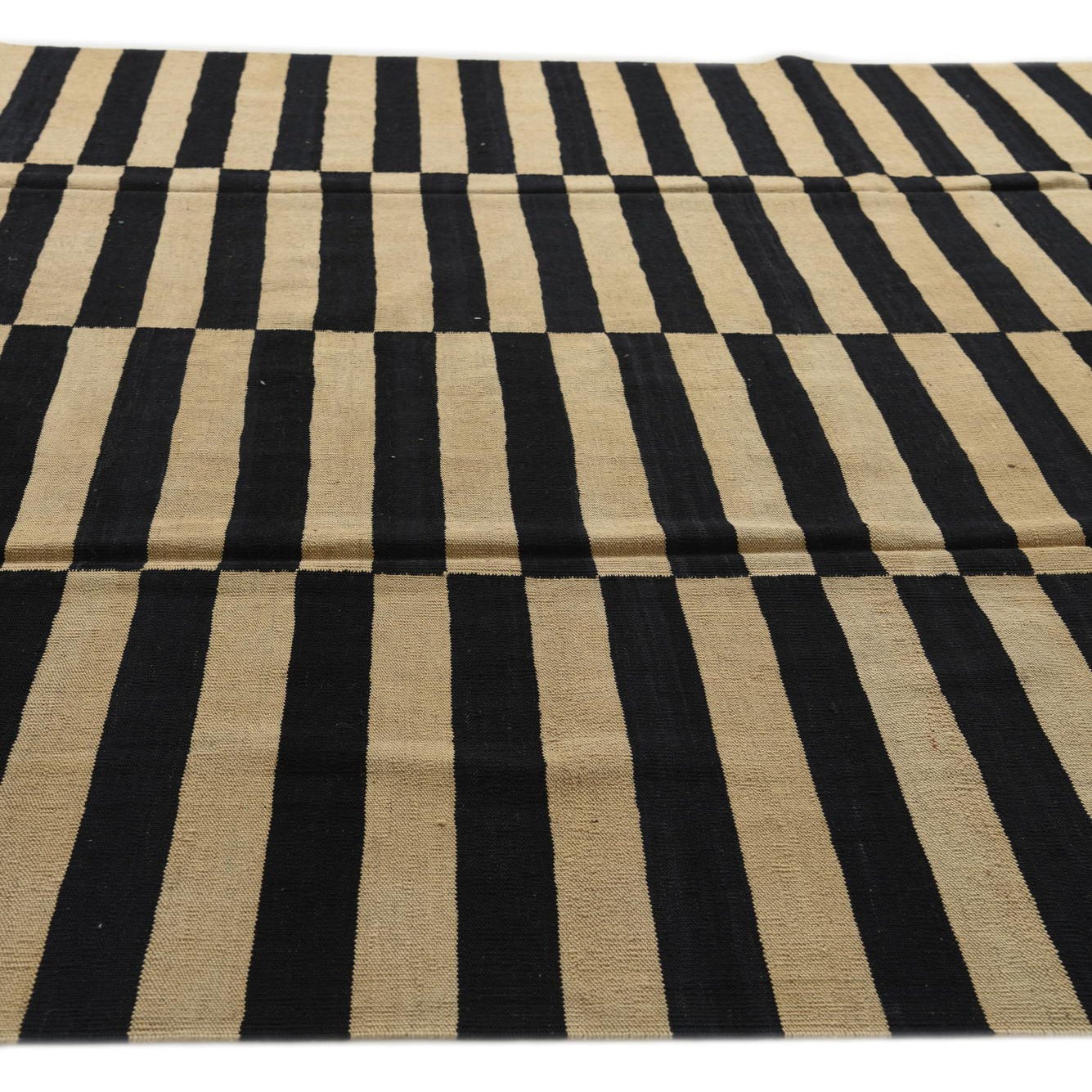 An 8x11 rectangular Kilim Modern rug with alternating horizontal stripes of black and cream, creating a bold, modern tribal pattern.
