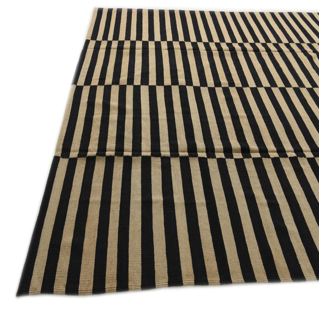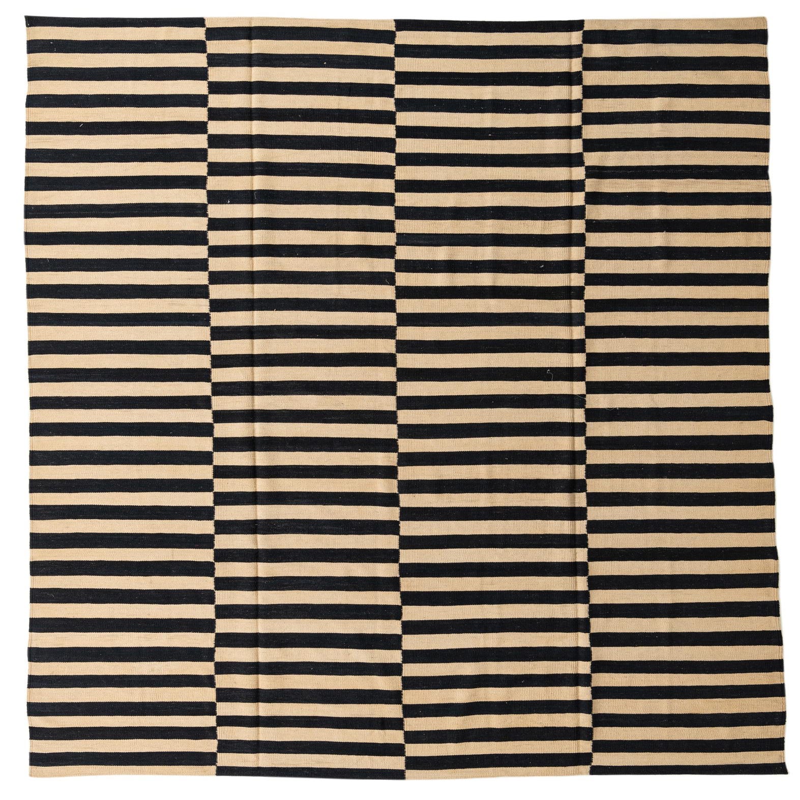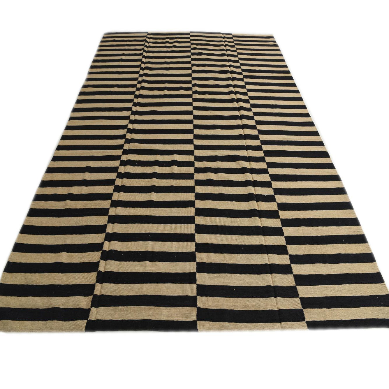 A large 8x11 rectangular Kilim Modern rug with alternating black and ivory horizontal stripes creating a bold, modern tribal pattern.