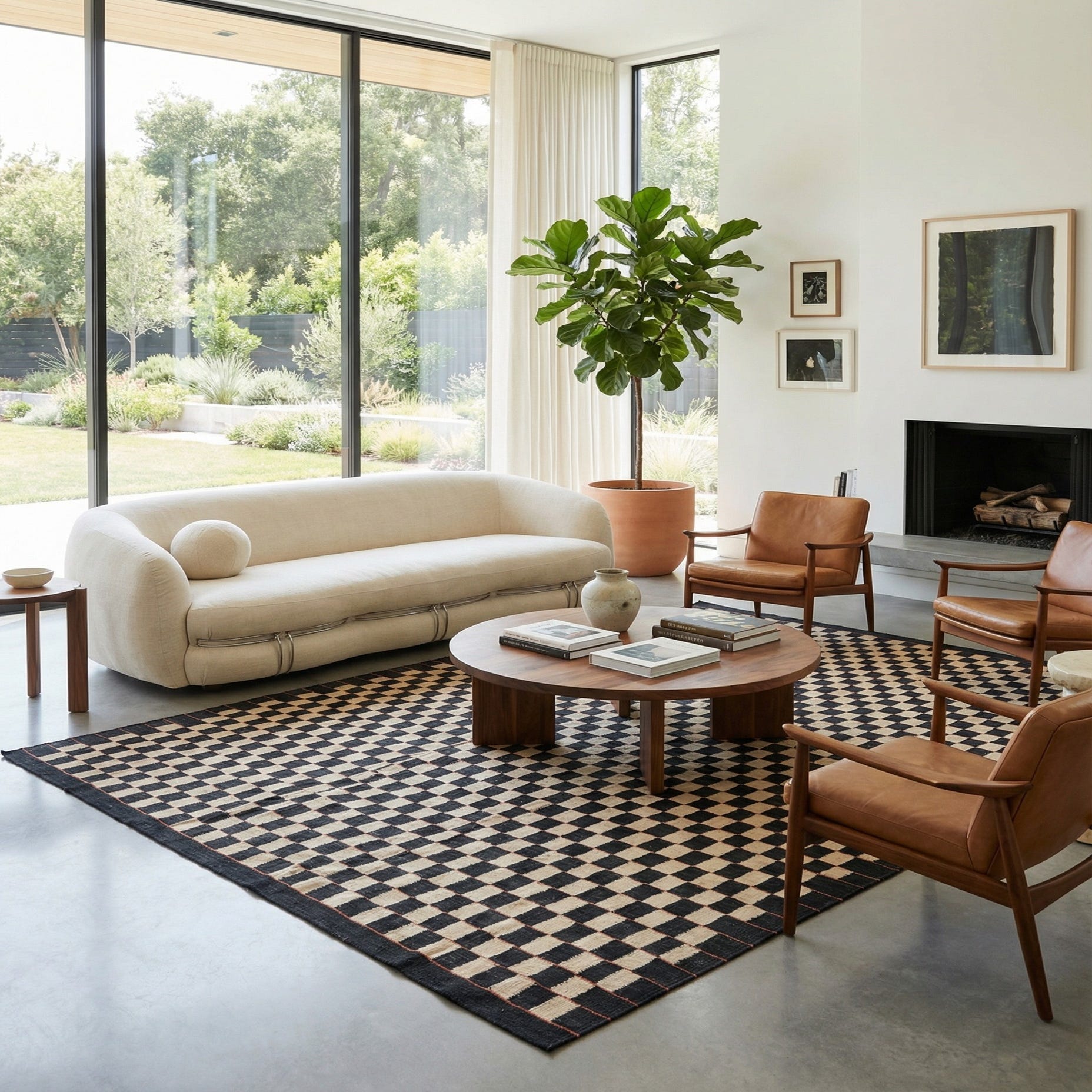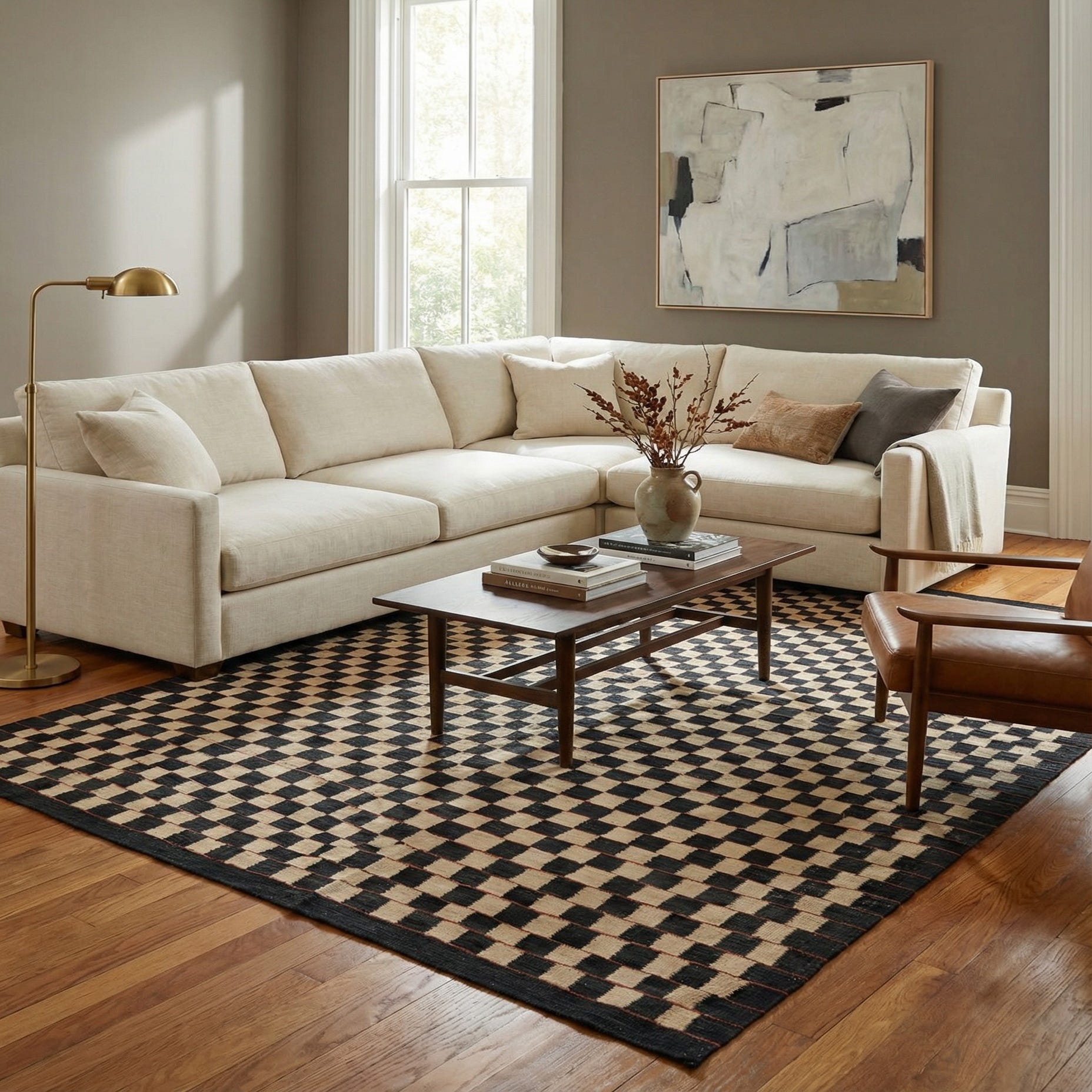 A rectangular 8x11 Kilim Modern rug featuring a bold checkerboard pattern of ivory and black squares, handmade with a flatweave texture.