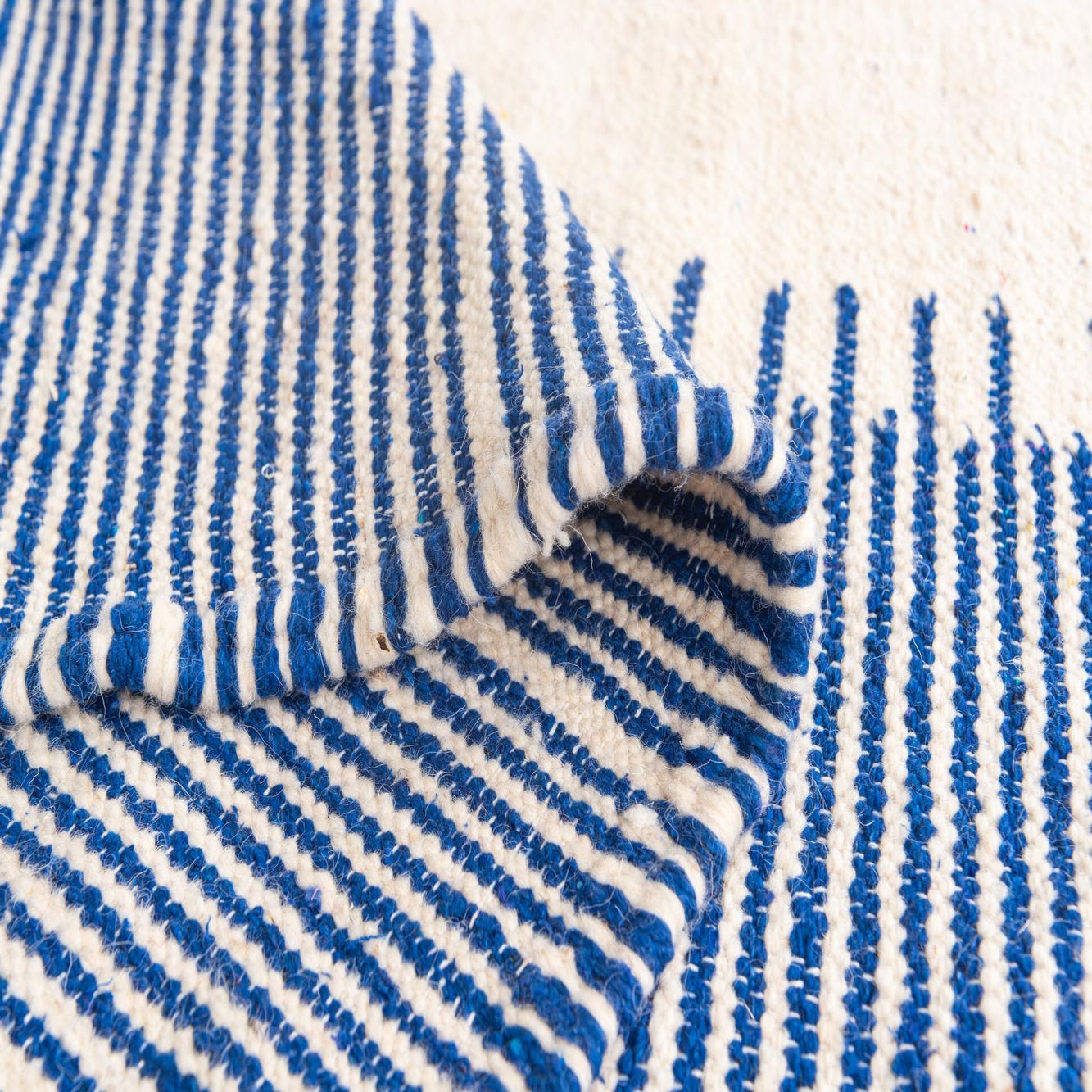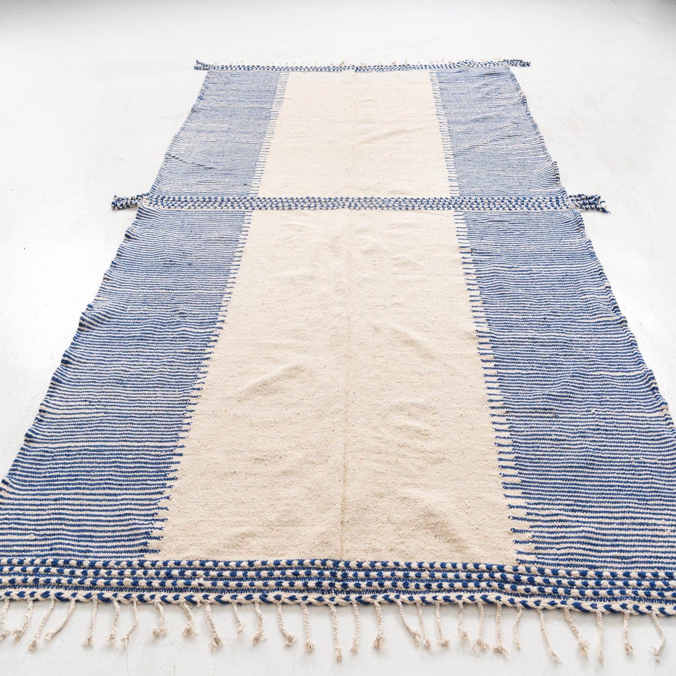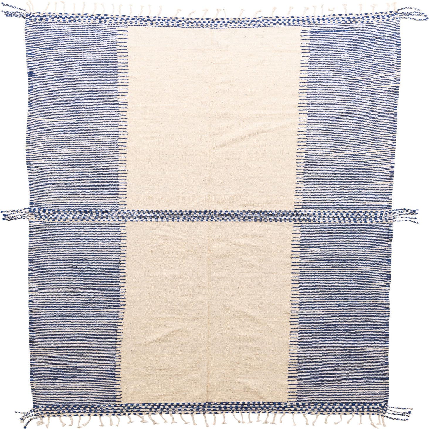 An 8x11 rectangular ivory and blue tribal wool shag rug with a central cream panel and blue striped borders, handmade for a living room.