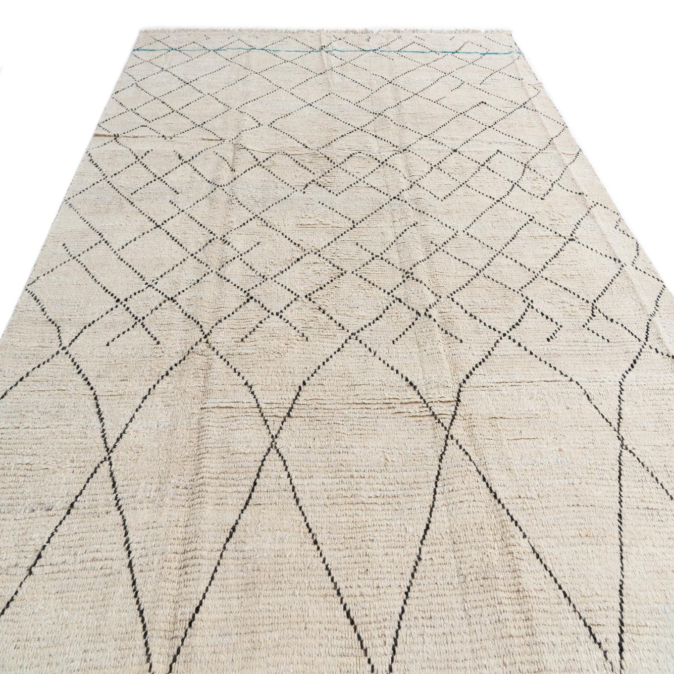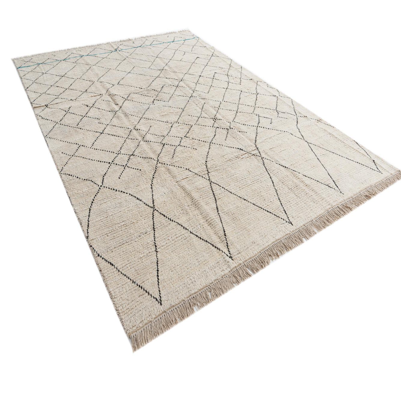 An 8x11 rectangular ivory wool shag rug with a black tribal diamond pattern and thin blue accents.