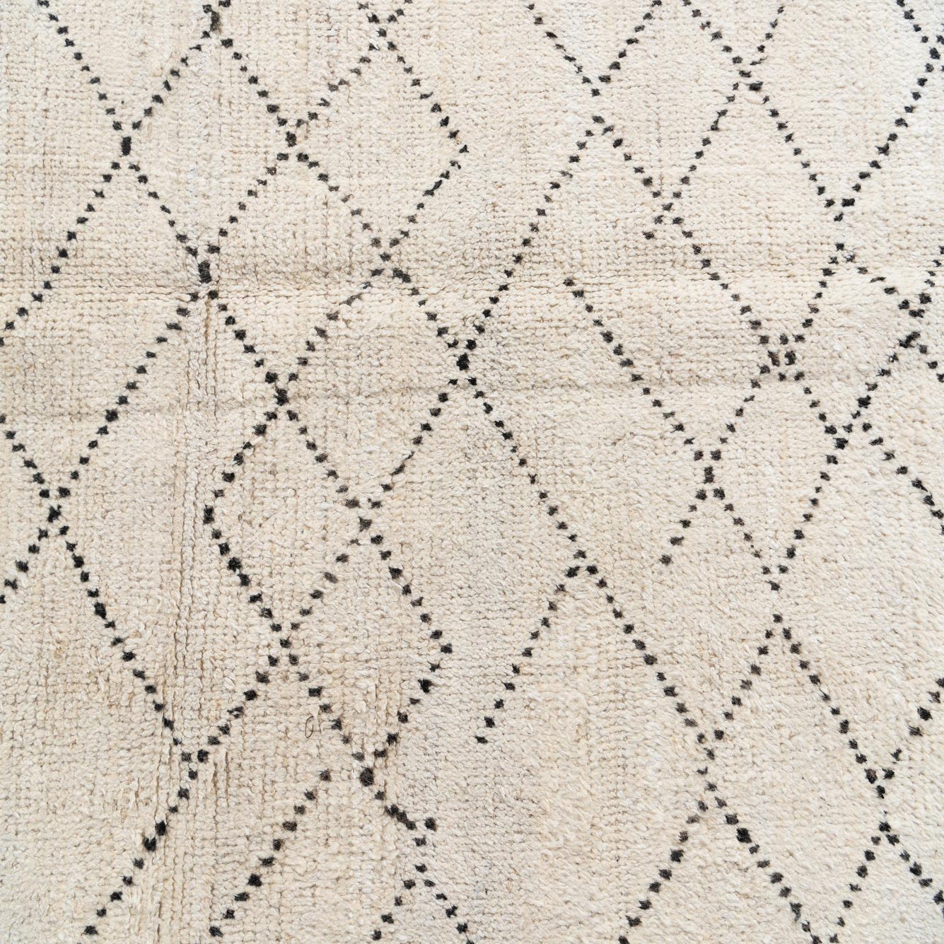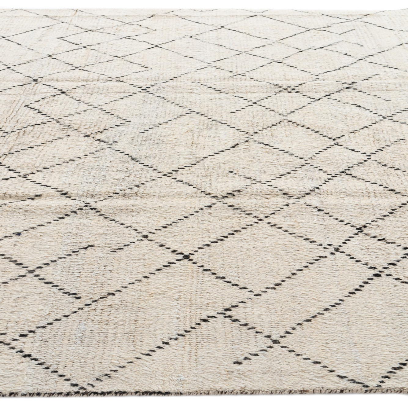 This Moroccan Collection rug is hand-knotted from 100% wool, offering both durability and a soft, inviting texture. Sized at 8x11, the piece features a geometric diamond pattern that grants it a timeless appeal. The contrast of ivory and black hues ensures versatility, allowing this rug to anchor a room without overwhelming it. Its ivory background is accentuated by the bold black linework, which adds a distinct visual interest and rhythmic pattern to the space.