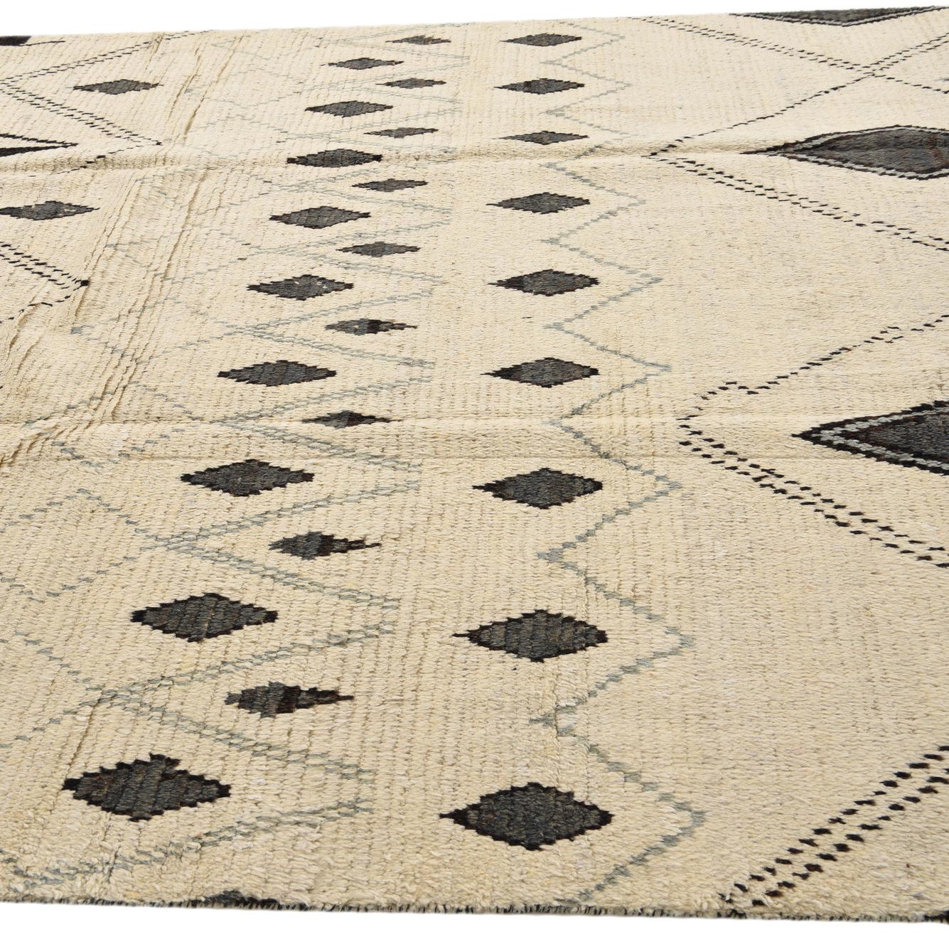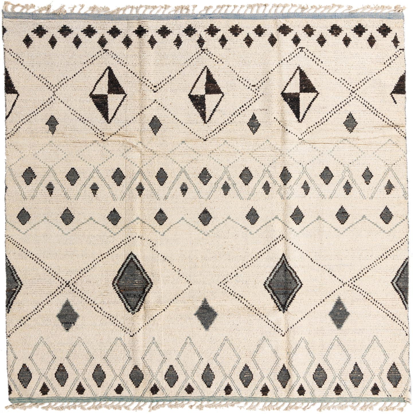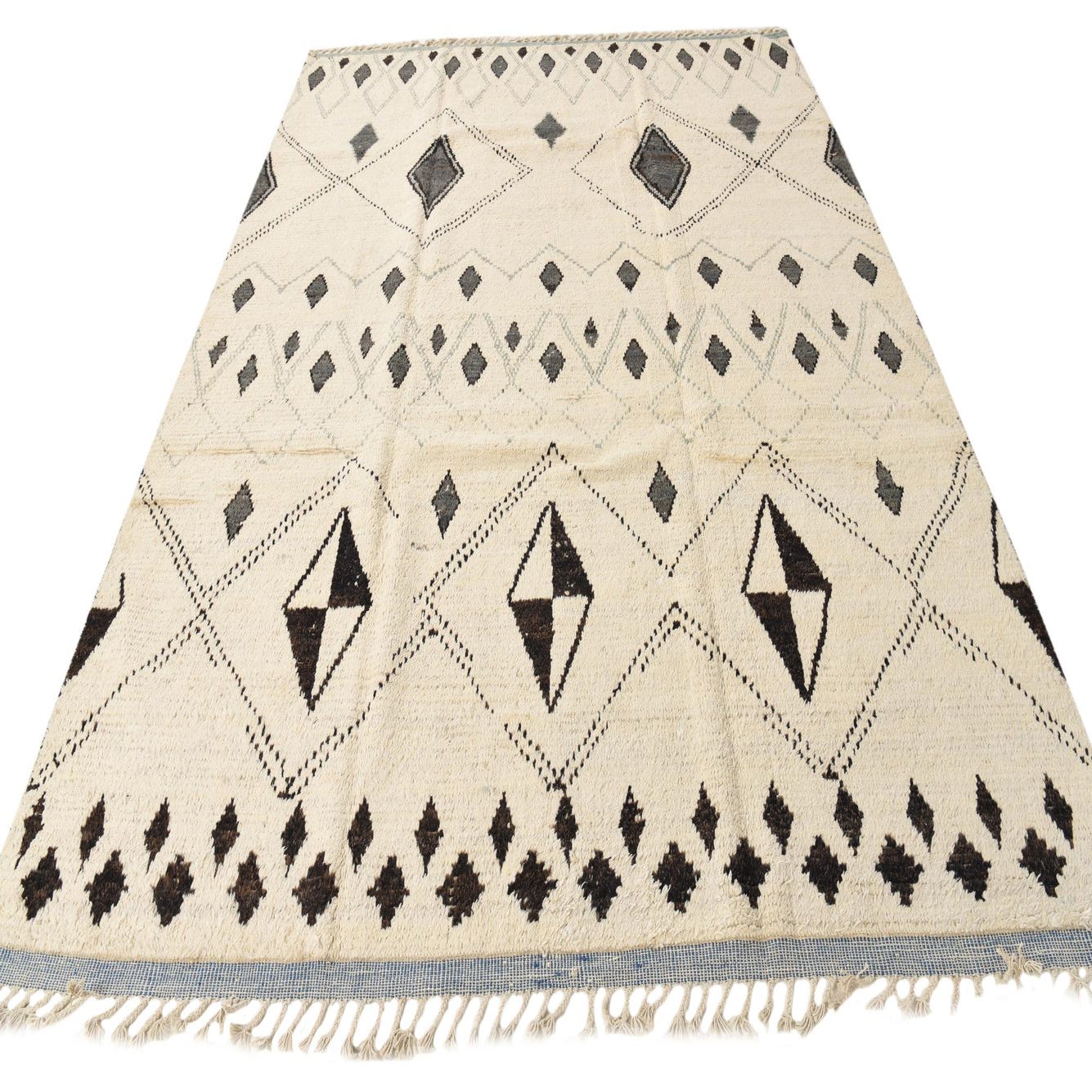 This Moroccan collection rug, sized 8x11 and hand-knotted of 100% wool, showcases a distinctive pattern that marries traditional craftsmanship with a contemporary aesthetic. The design features a series of geometric motifs and diamond shapes in contrasting hues of ivory, black, and gray, set against an inviting ivory background. The texture of the wool offers a comfortable underfoot feel, while the attention to detail in the hand-knotted weave ensures durability and a quality finish.