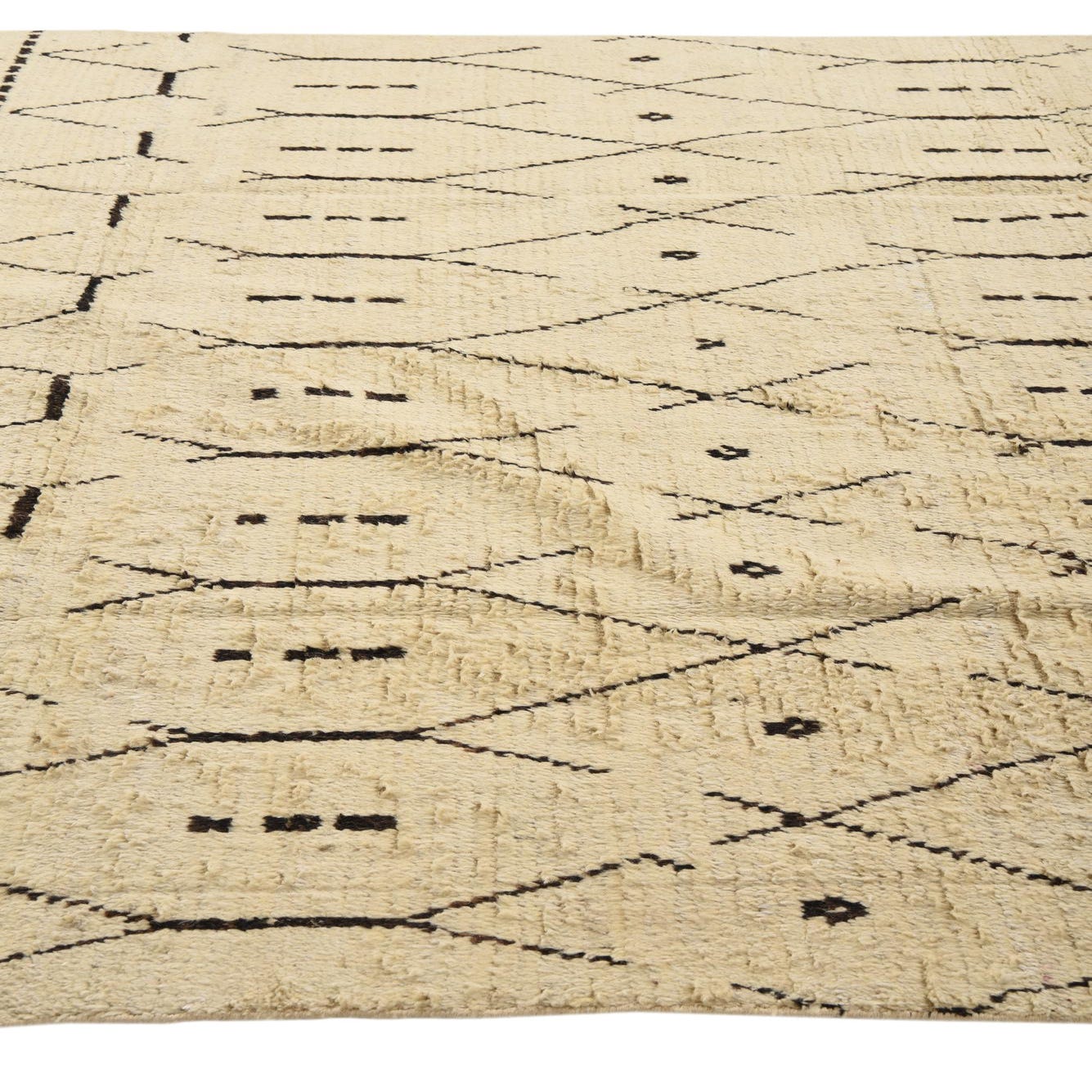 An 8x11 rectangular ivory wool shag rug with a modern tribal geometric pattern in black, featuring diamonds and abstract shapes.