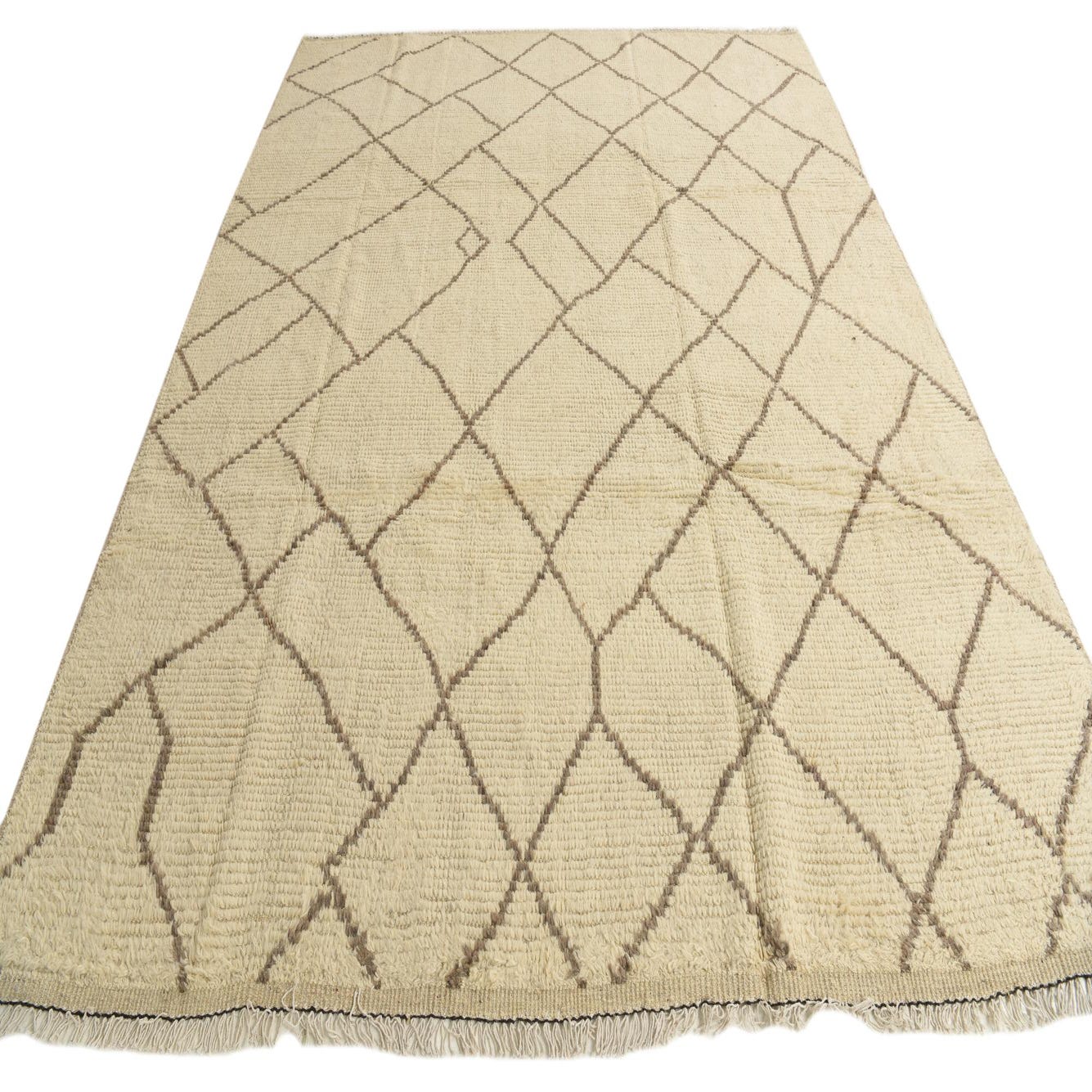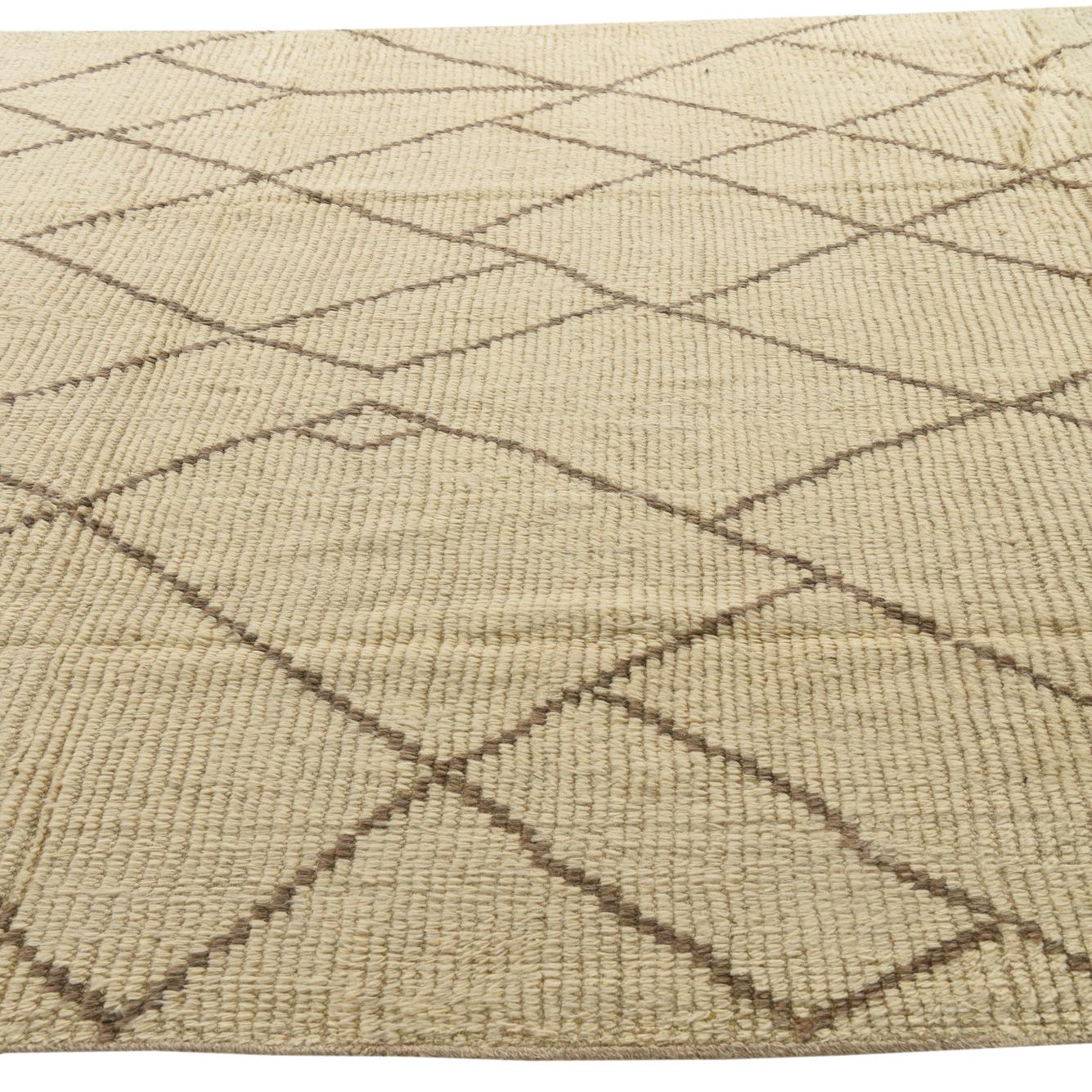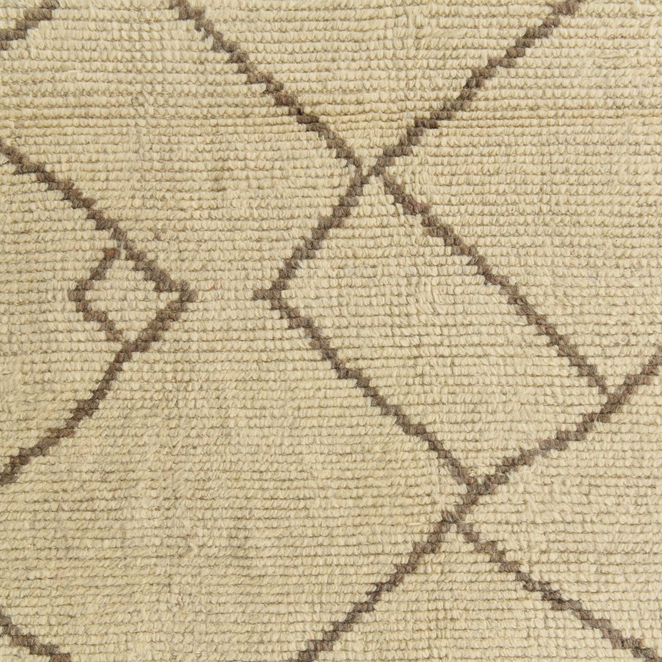This Moroccan collection rug is a hand-knotted piece crafted from 100% wool, offering both durability and a soft, inviting texture underfoot. The design delivers a harmonious blend of ivory and light brown colors, providing a neutral palette that complements a wide range of interiors. The pattern features a series of interconnected diamonds, creating a sense of continuity and flow within the space. Measuring 8x11, it accommodates a variety of room sizes, becoming a focal point in a living area or grounding a dining space with its generous dimensions.