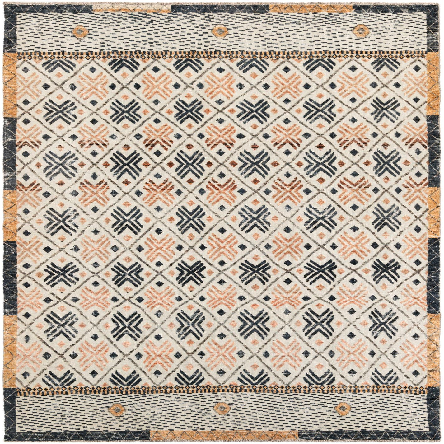 An 8x11 rectangular ivory wool shag rug with a modern tribal pattern in black and peach, perfect for a living room.