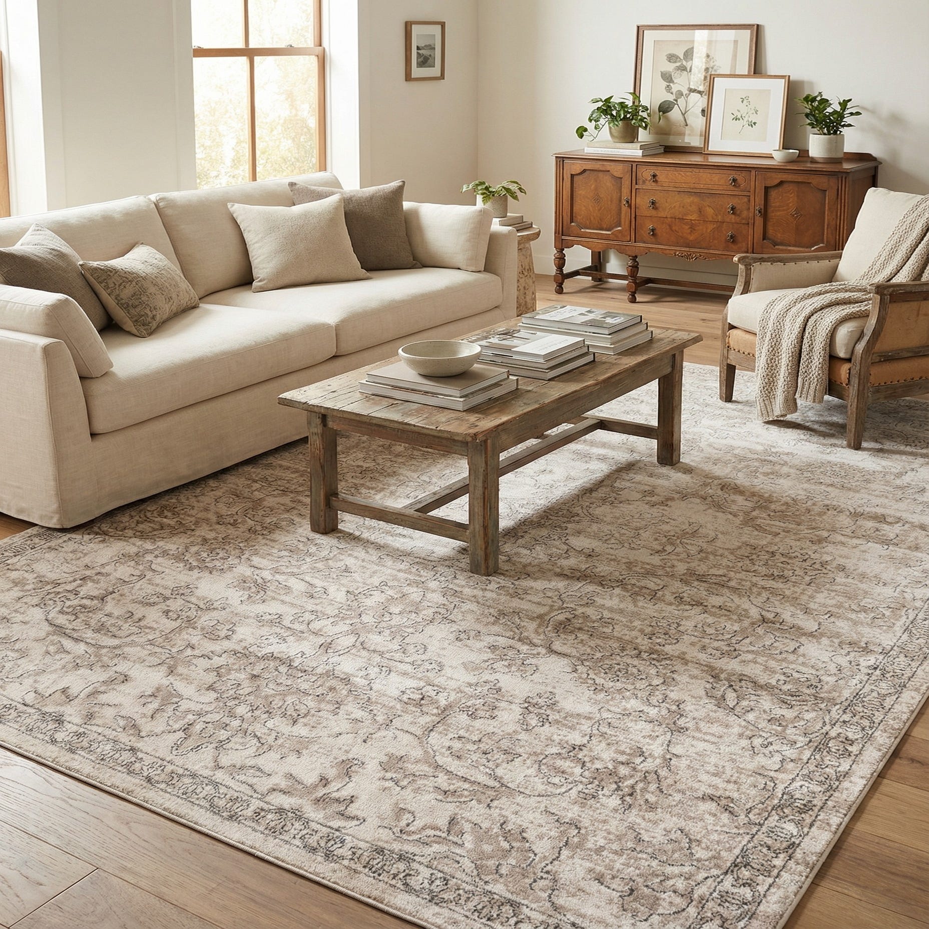 This rug anchors a variety of interiors — place it under a sofa and coffee table to define a living area, layer it beneath a bed to add warmth to a neutral bedroom, or use it under a dining table to ground a casual dining set. It pairs especially well with natural wood, linen or leather furnishings and works in transitional, modern farmhouse, coastal, or classic settings where a quiet, neutral foundation is desired.